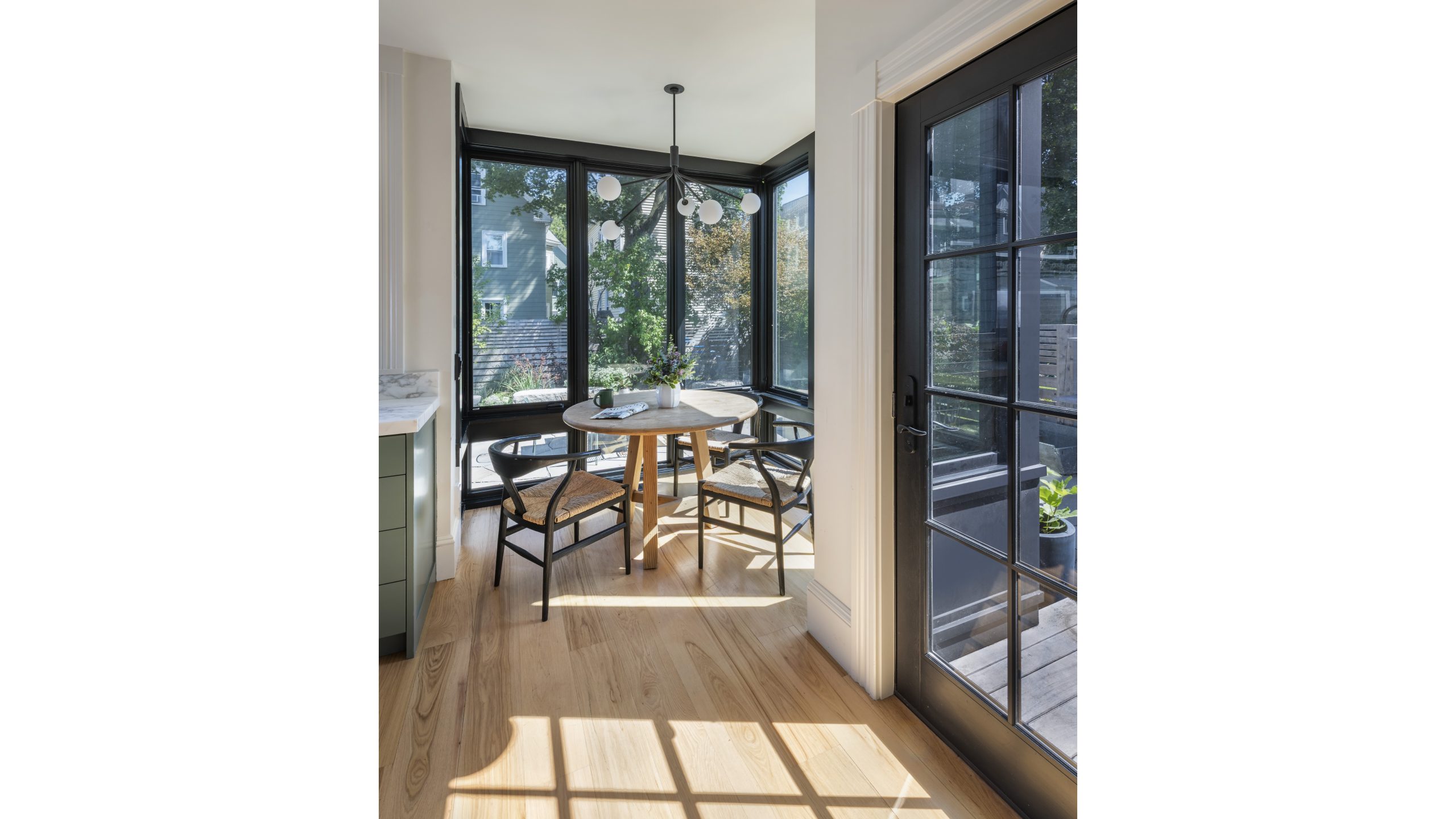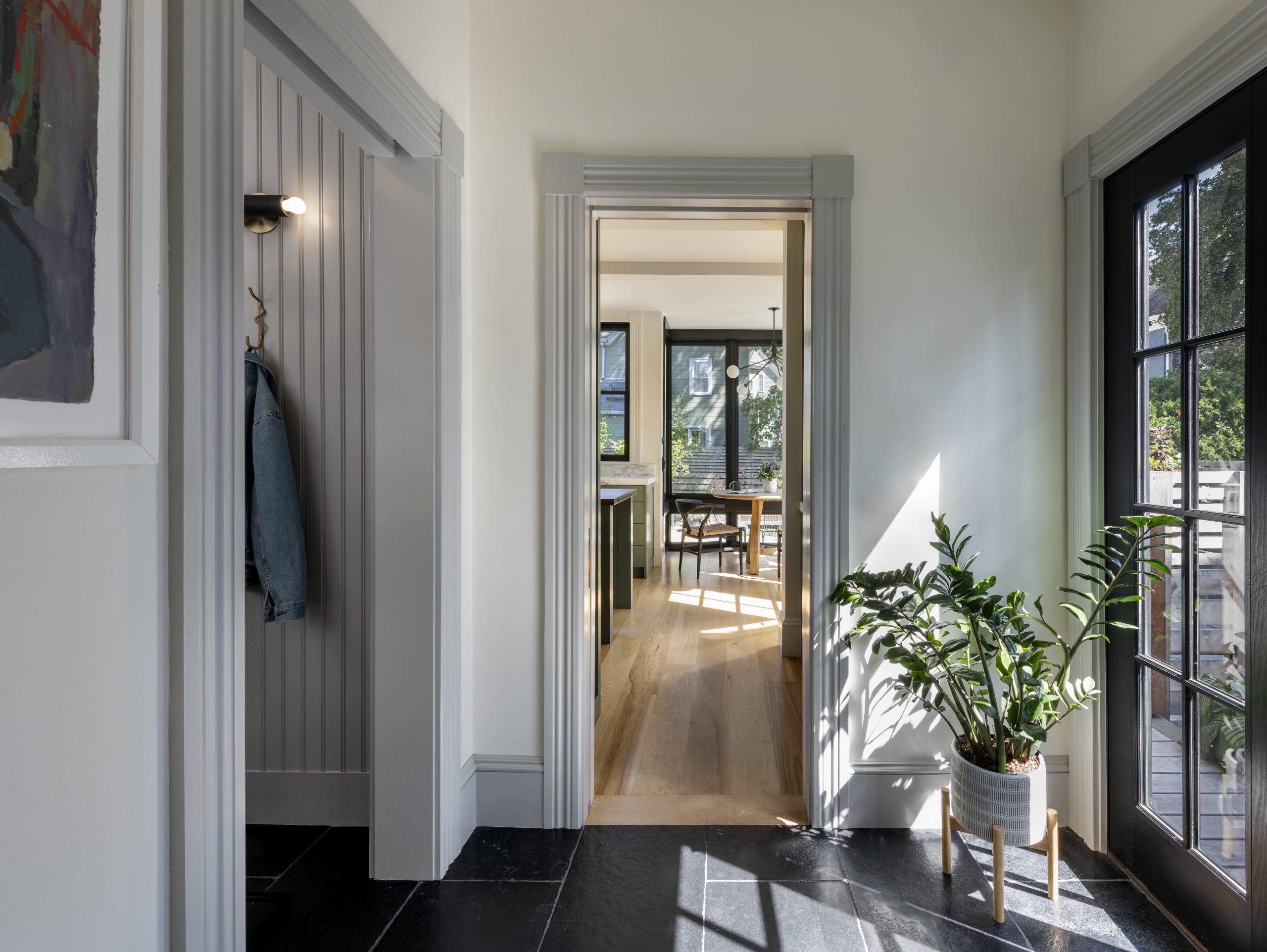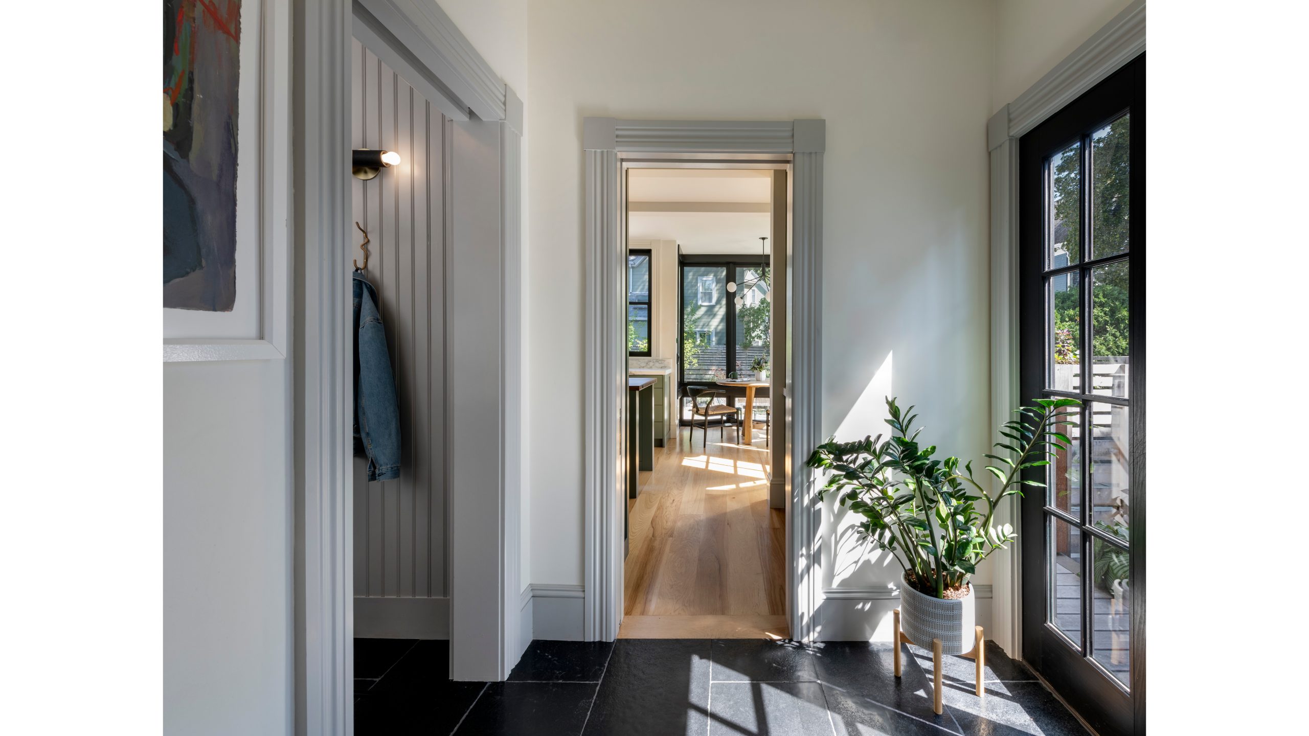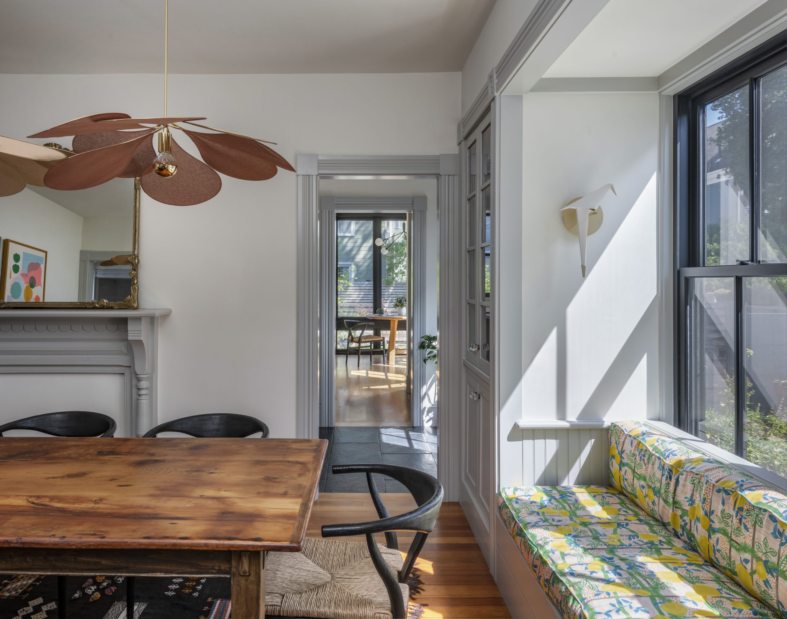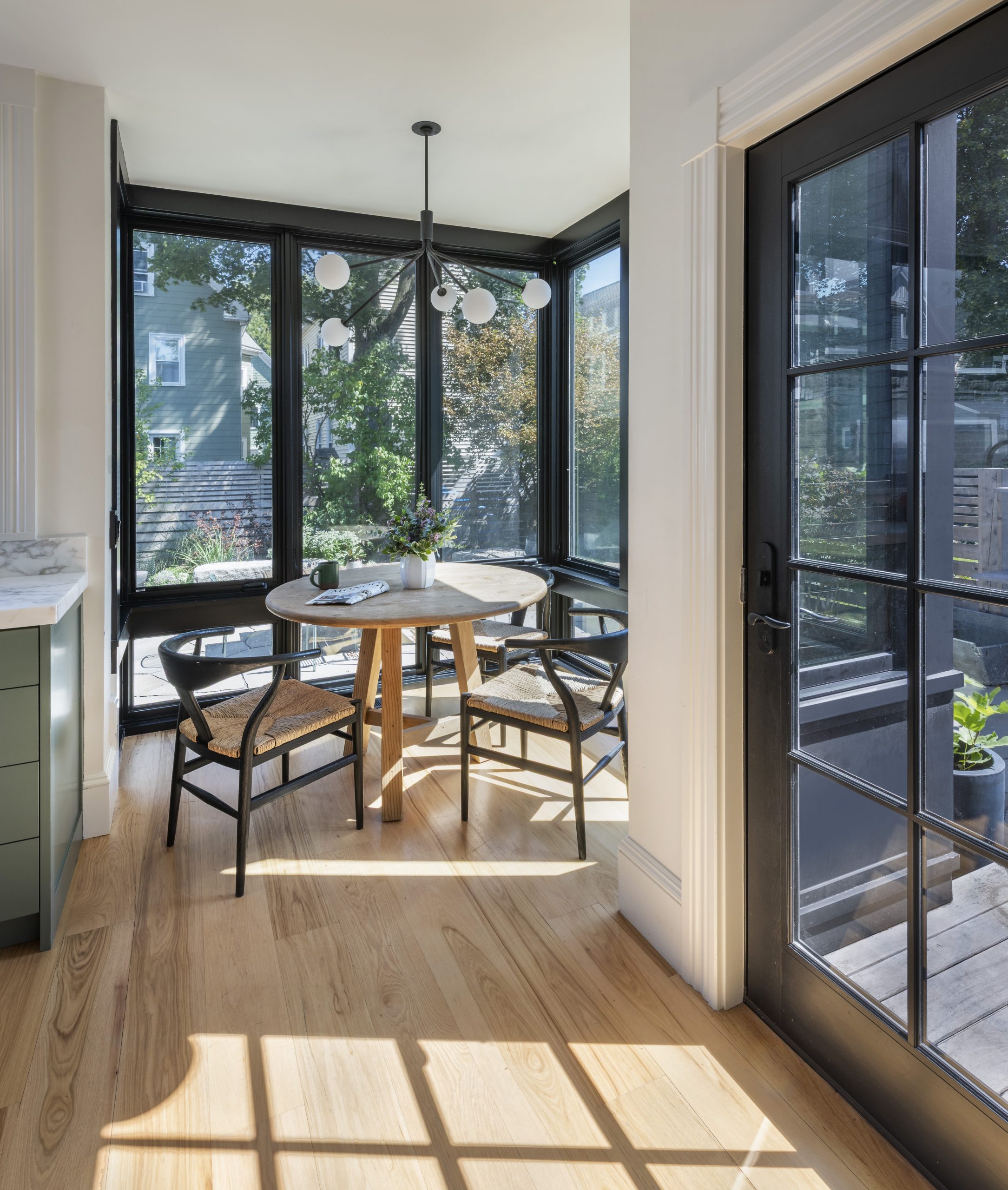 Our clients – a professional chef and a lawyer, and their two dogs – had lived in this three-story Victorian that straddles the Cambridge and Somerville line for several years before deciding to renovate. Their concerns were similar to many of our clients — the kitchen was small and cut off from the rest of the house, the entries (both front and back) were cramped and lacked storage, as did the primary bedroom and bathrooms. And the laundry was in the unfinished basement. A relatively small extension off the back of the house made space for a new mudroom with extensive storage, a half bath, and a large kitchen with breakfast area, specifically designed around the needs of our professional chef client. Upstairs, the new addition allowed a small bedroom and bathroom to be transformed into a new primary suite, and a laundry area was added on the 2nd floor. Another bedroom was turned into a home office, while the third remained available as a guest bedroom. Although not part of the original scope, CTA saw an opportunity up in the attic, where clearing out a couple of closets created a large light filled sitting room for TV and guests.
