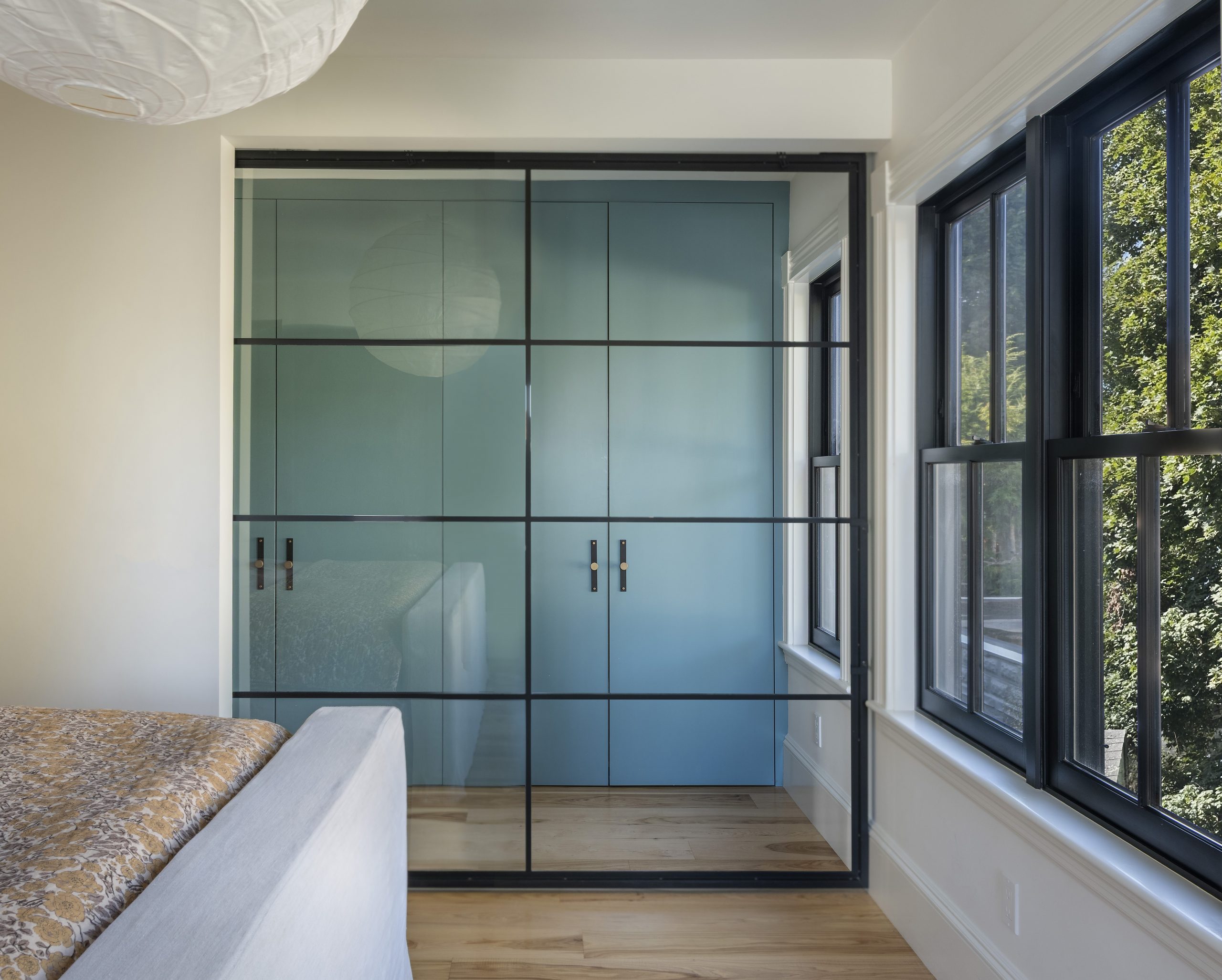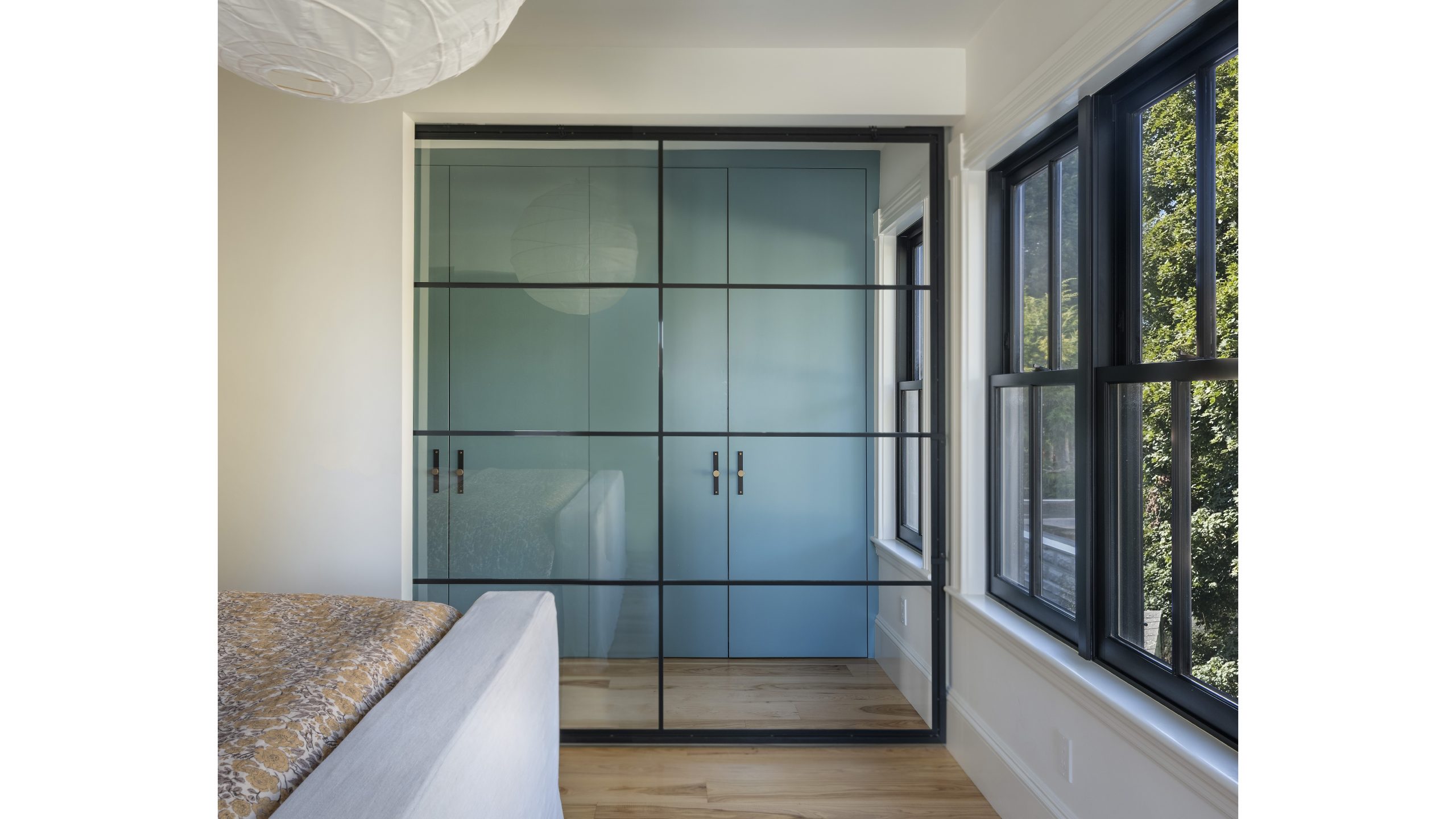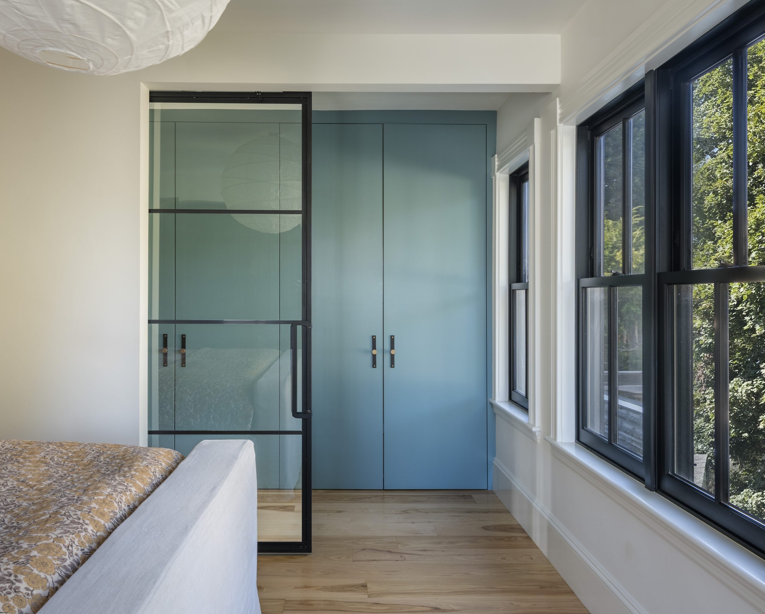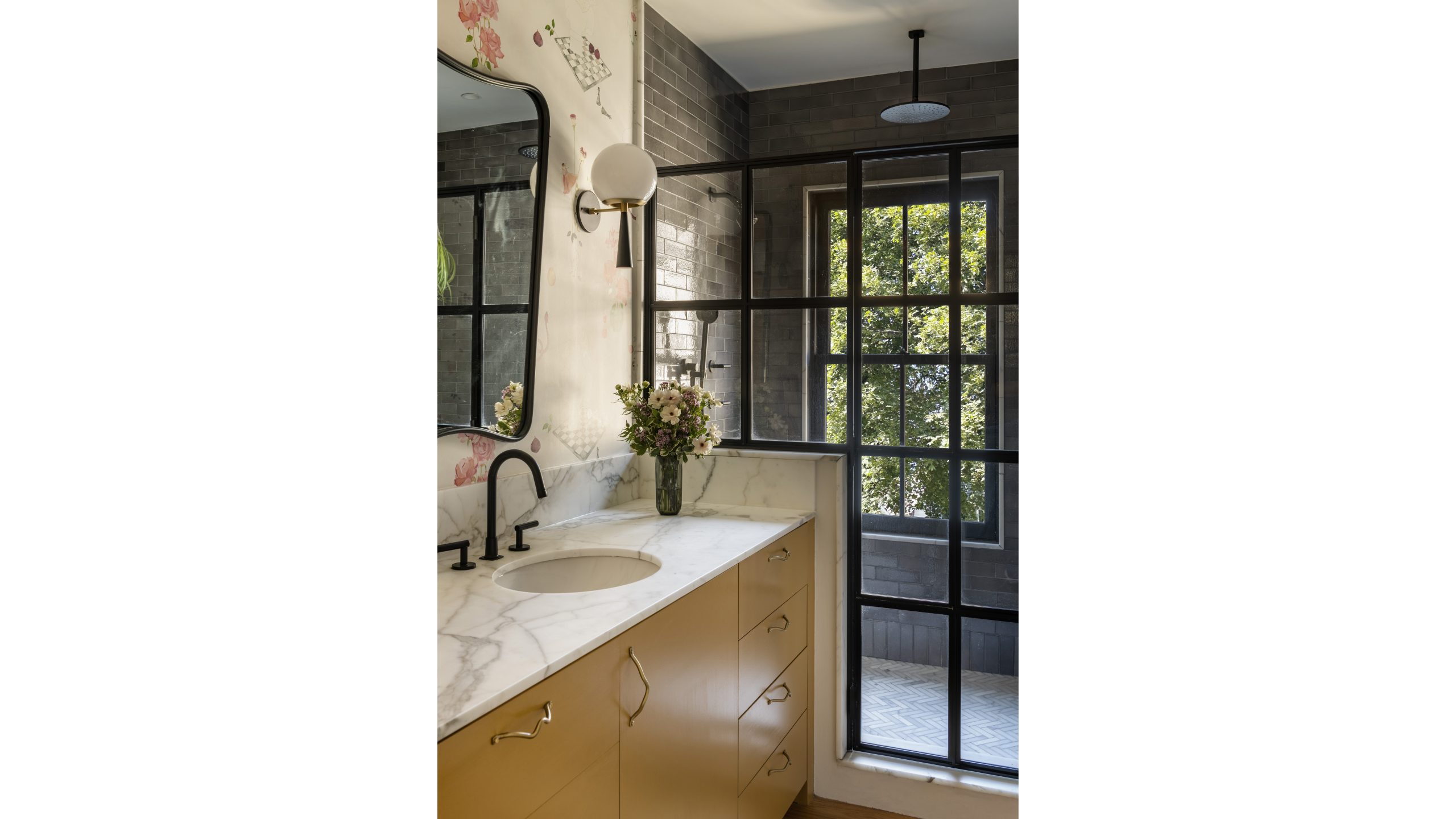 Upstairs, the hall to the primary bedroom does double duty, housing four floor to ceiling reach-in closets, with a large steel and glass barn door closing off the sleeping area. The primary bath, with its bright vanity (Farrow & Ball India Yellow), is set off against the dark gray subway tiles and Calacatta marble.