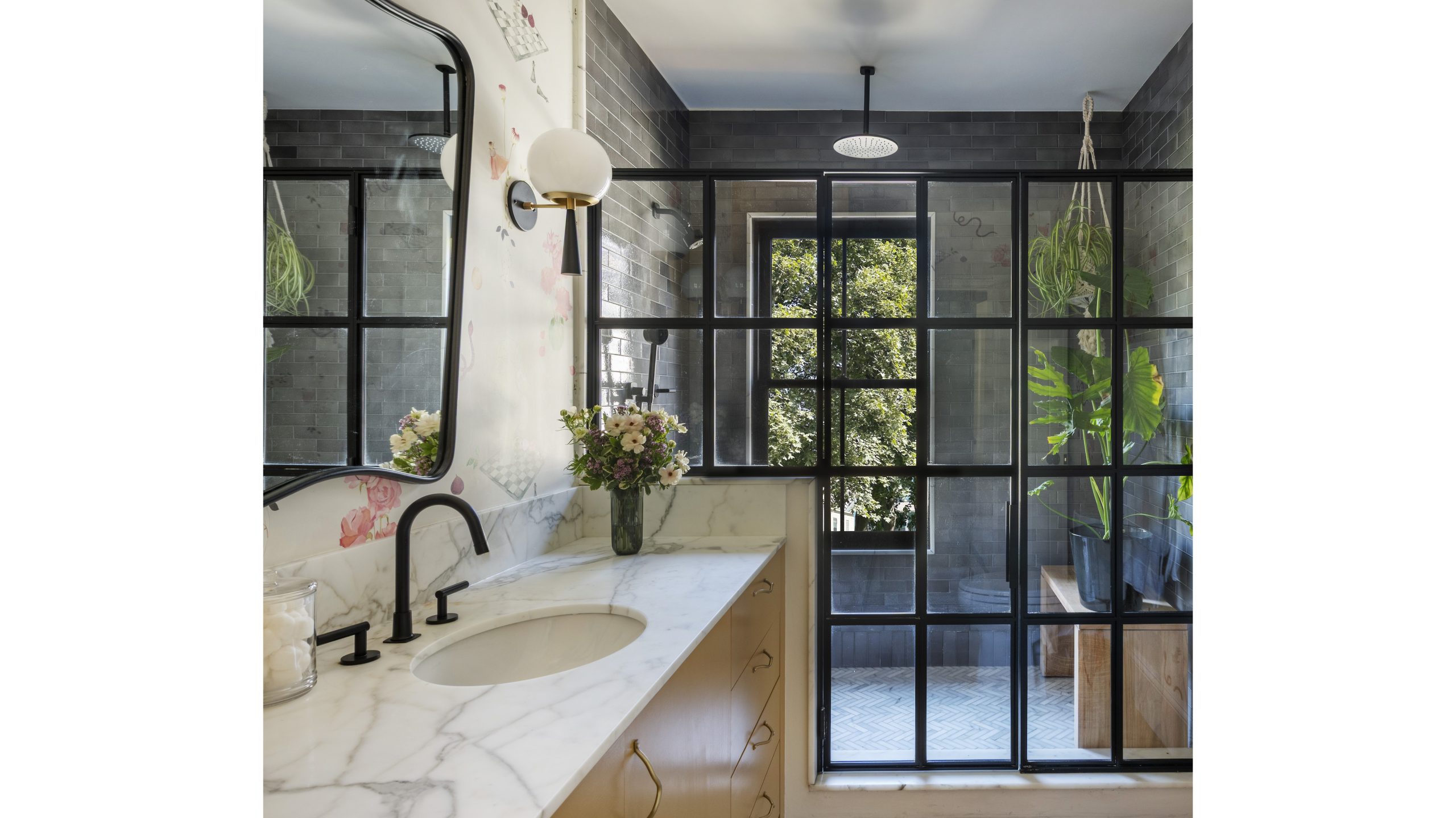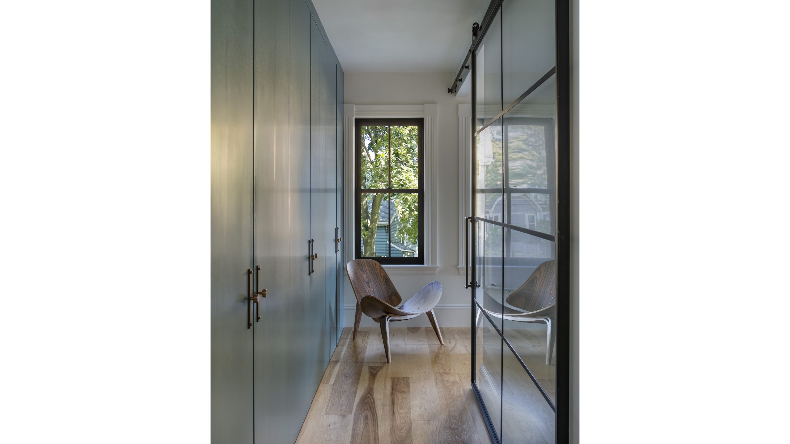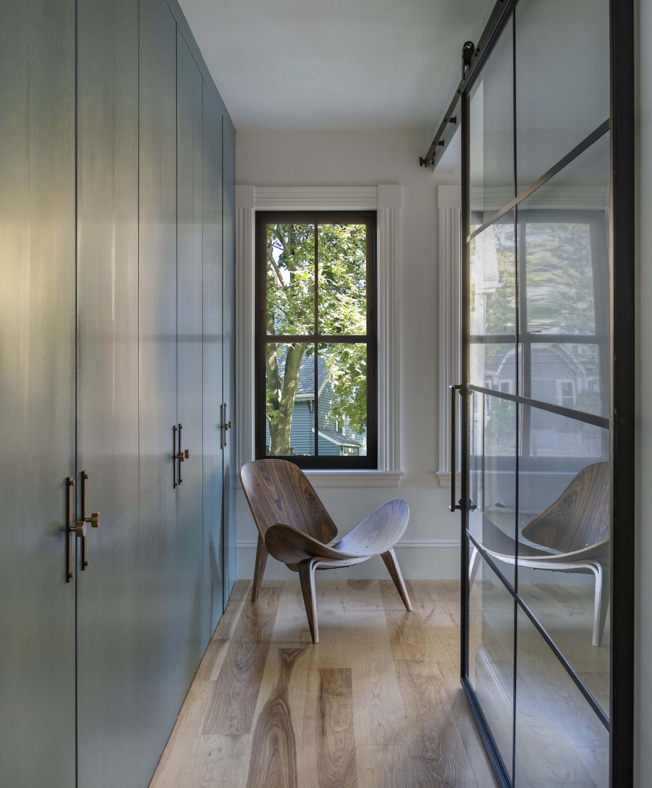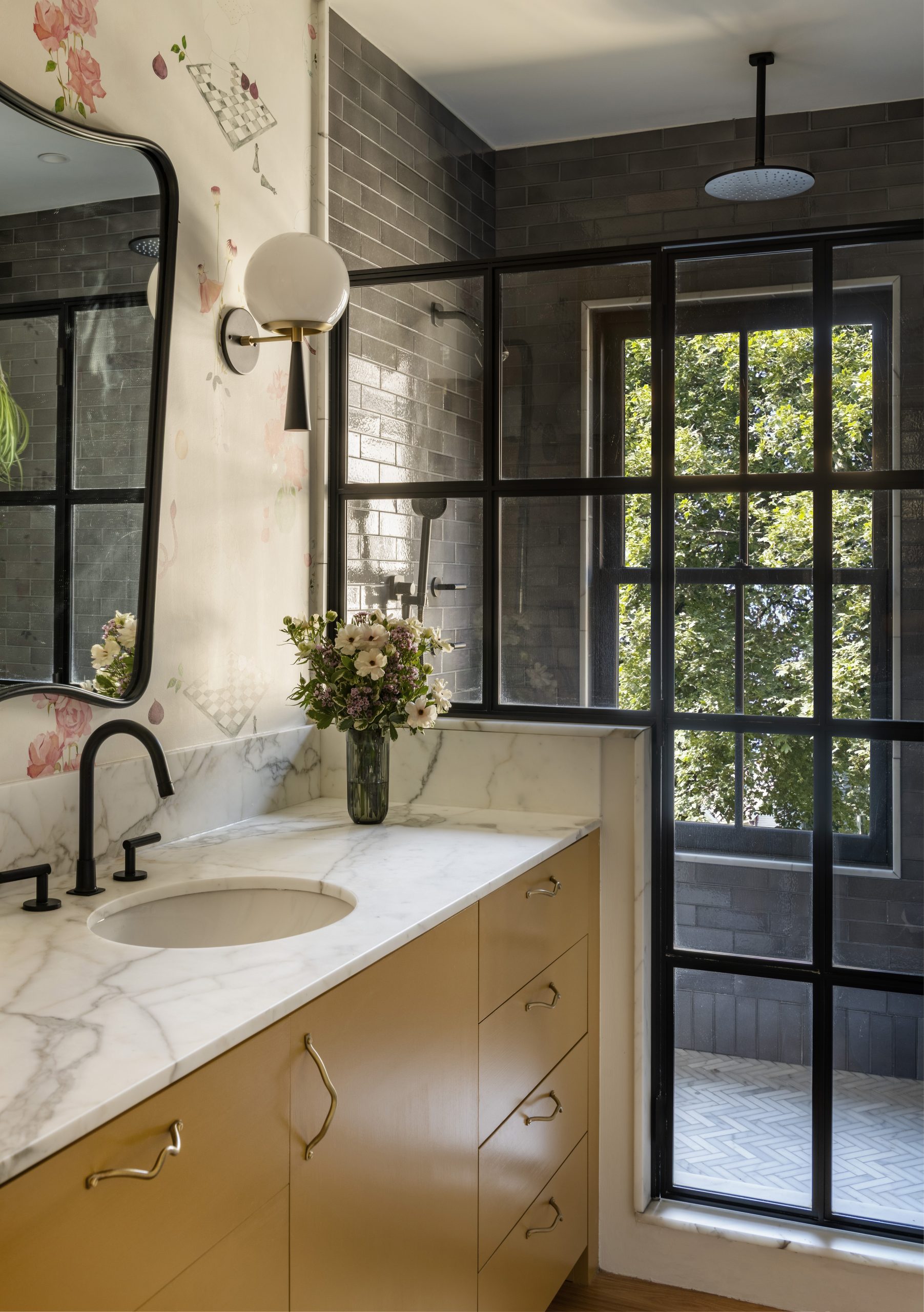 Upstairs, the hall to the primary bedroom does double duty, housing four floor to ceiling reach-in closets, with a large steel and glass barn door closing off the sleeping area. The primary bath, with its bright vanity (Farrow & Ball India Yellow), is set off against the dark gray subway tiles and Calacatta marble.