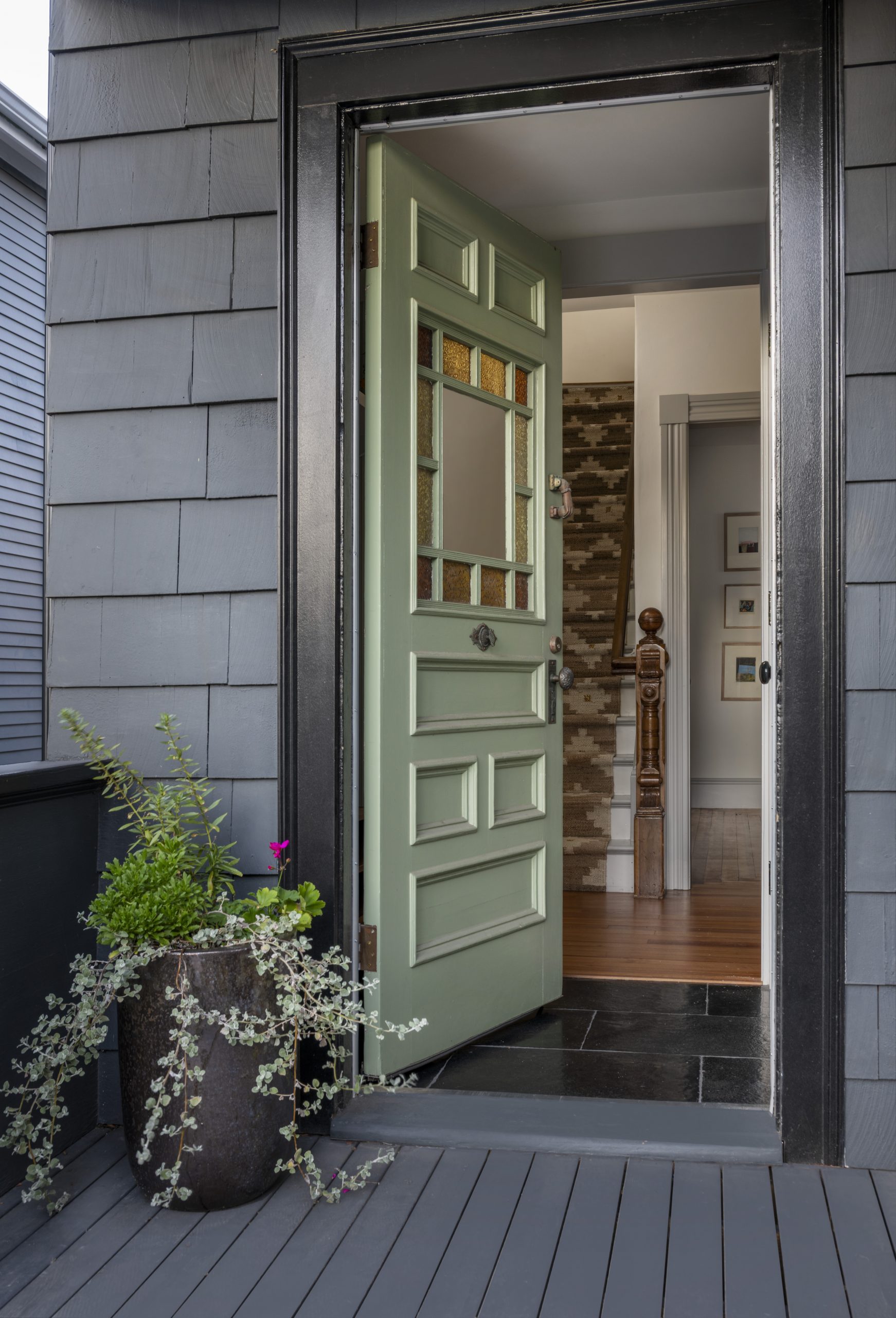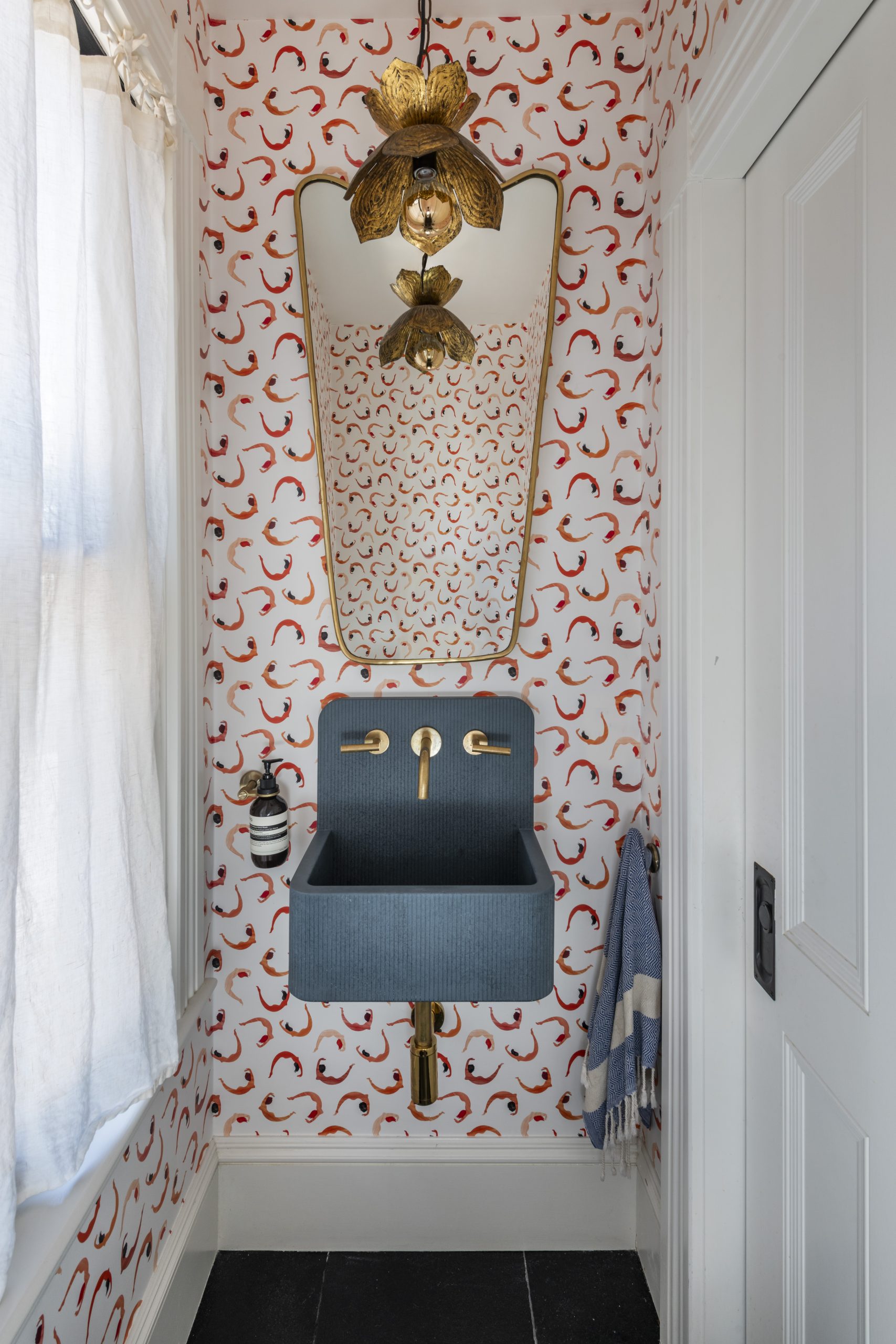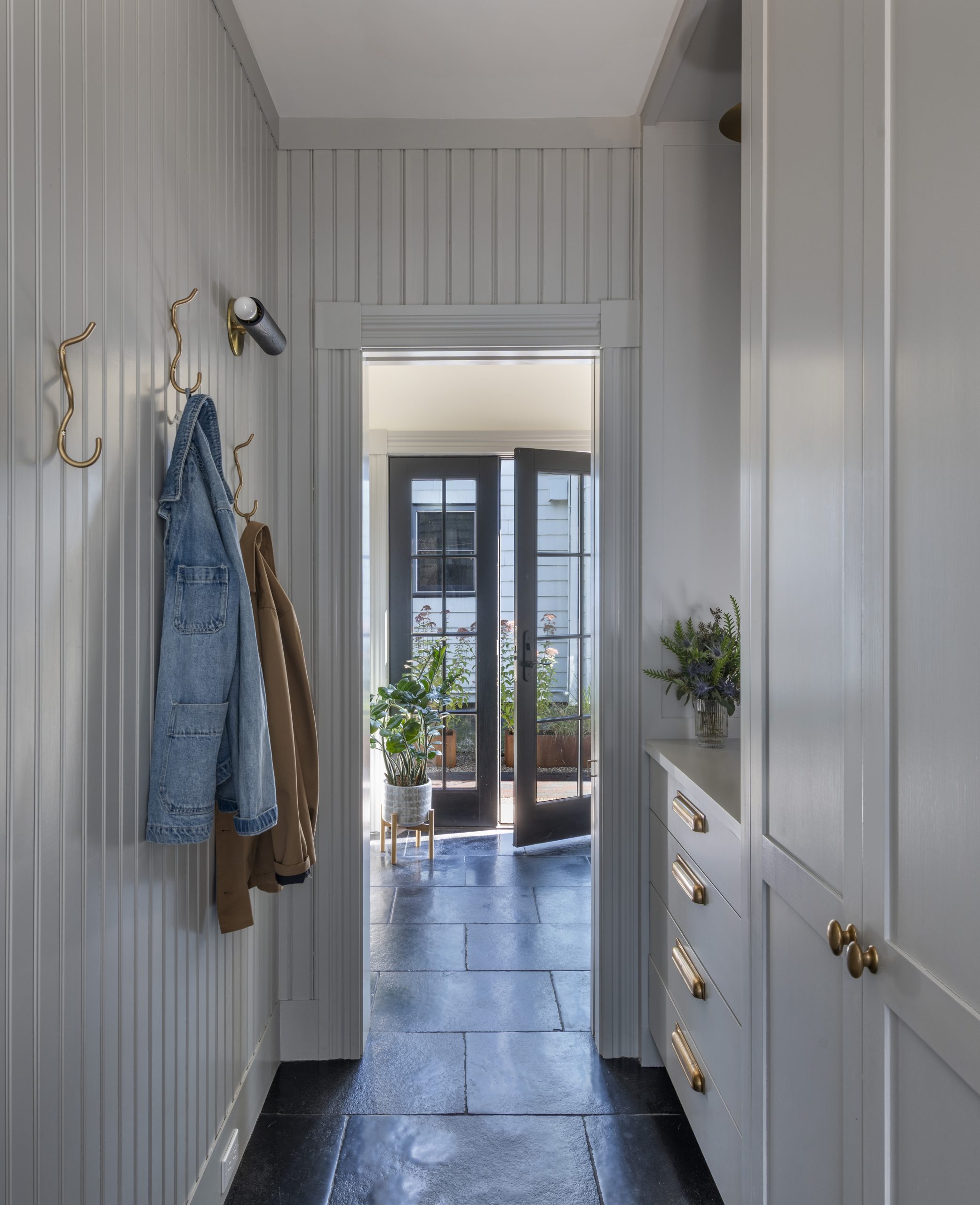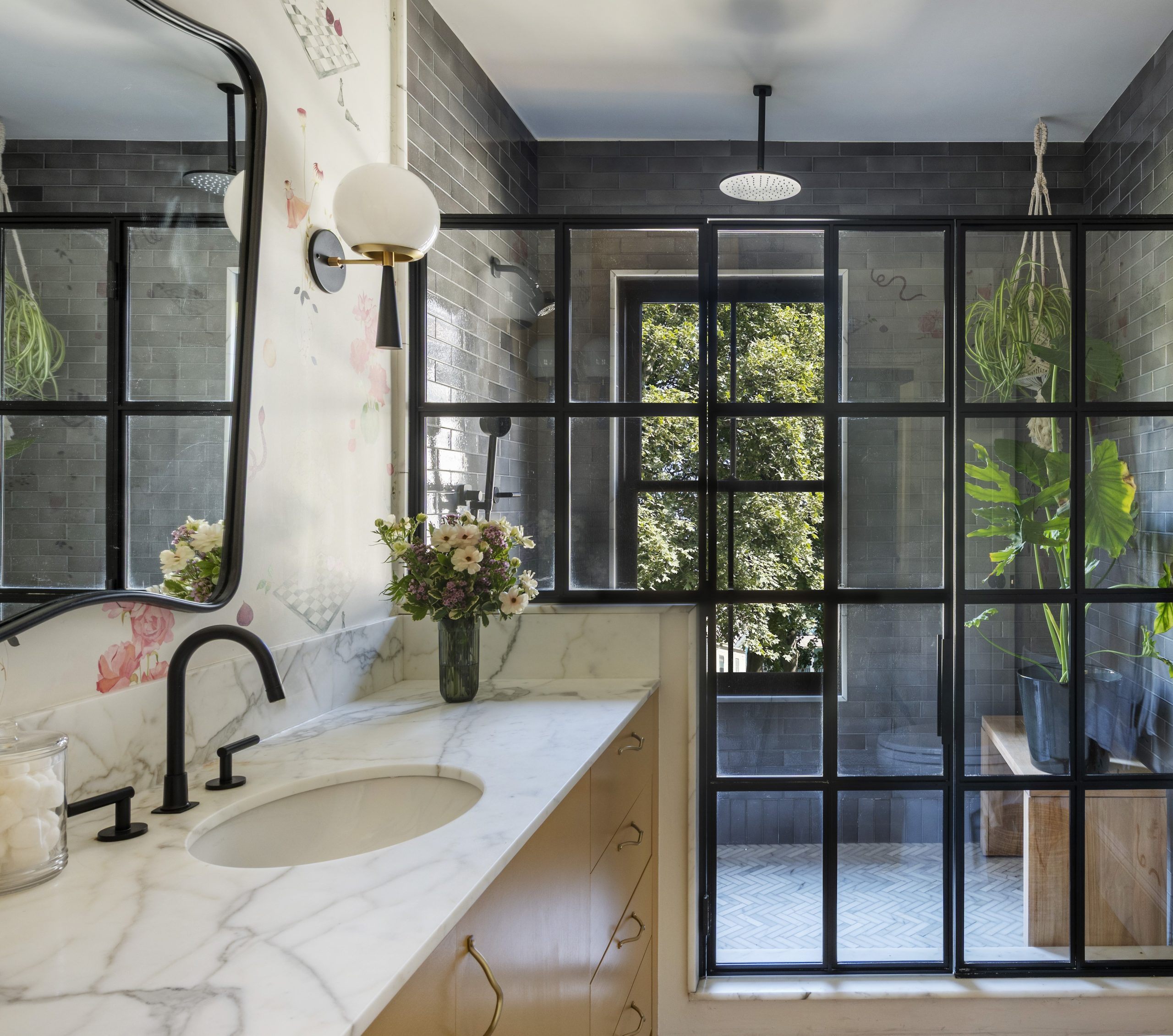 Upstairs, the hall to the primary bedroom does double duty, housing four floor to ceiling reach-in closets, with a large steel and glass barn door closing off the sleeping area. The primary bath, with its bright vanity (Farrow & Ball India Yellow), is set off against the dark gray subway tiles and Calacatta marble.