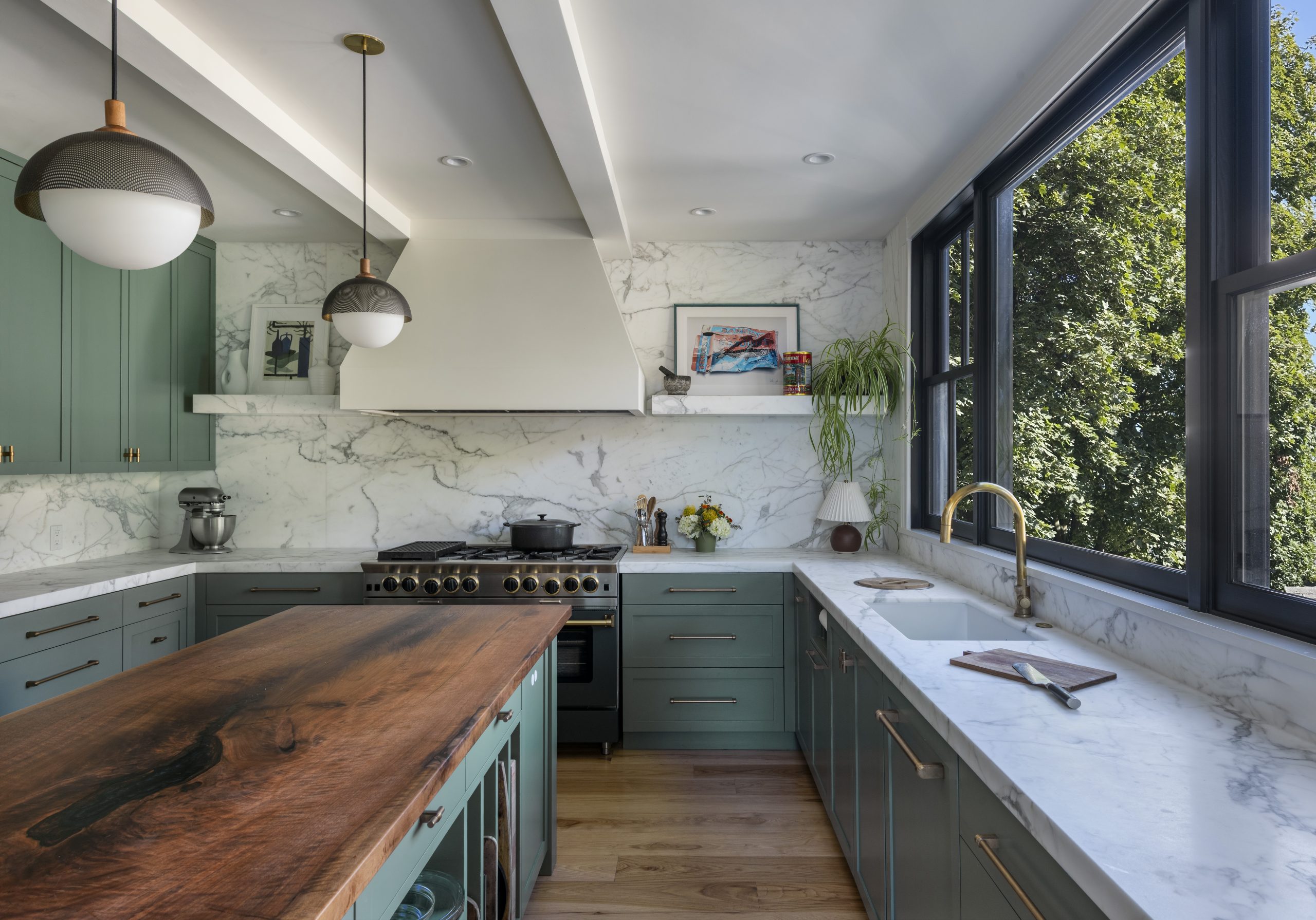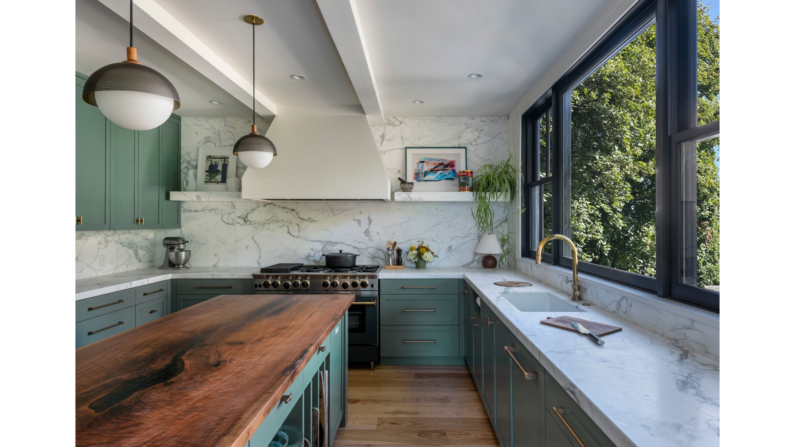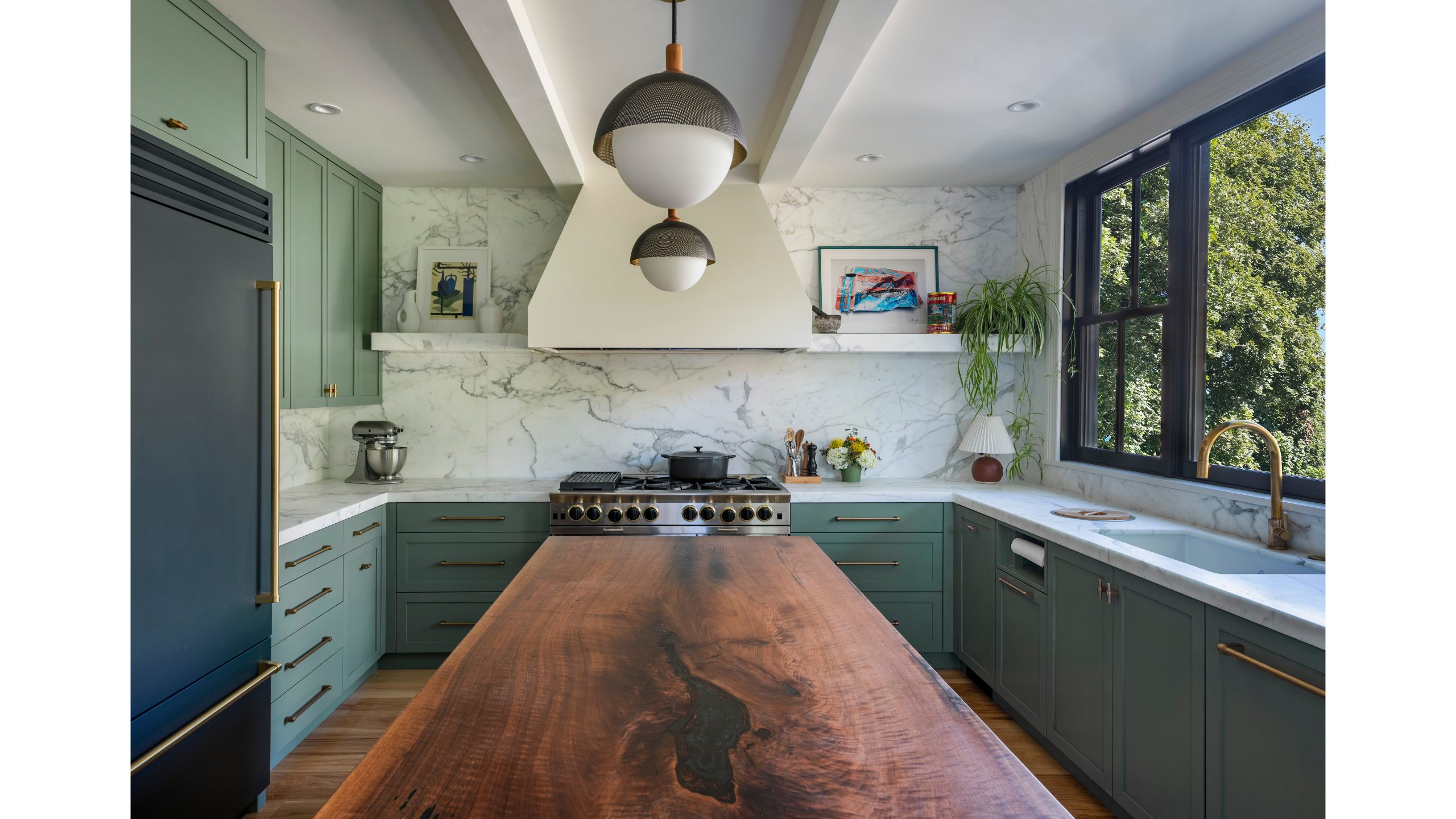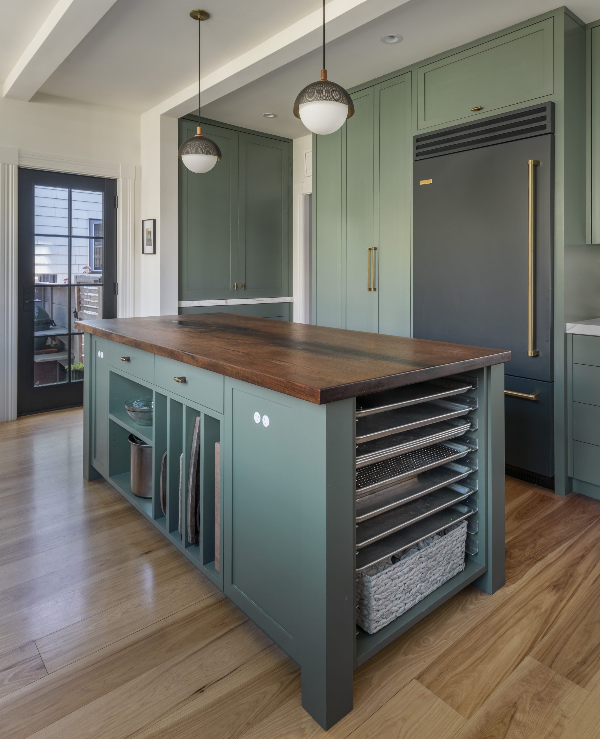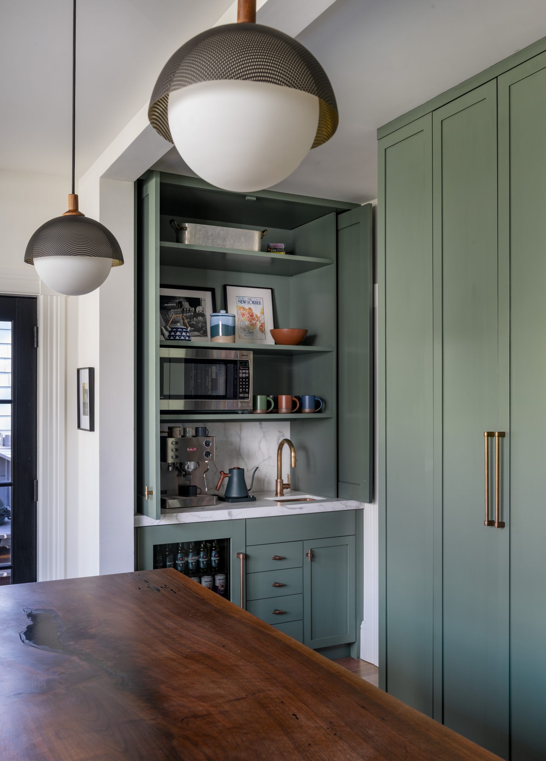 The kitchen is bathed in light, which streams in the new large window overlooking the new backyard. A large BlueStar range dominates one end in front of a full height Calacatta marble backsplash with floating shelves. A matching BlueStar fridge, and lots of storage in a complementary green, and a wet bar complete the perimeter, while an island dominates the center The highly walnut slab, from one single tree, sits on a custom base. Unlike most islands, this is truly a chef’s kitchen island, with built in cooling racks on the end opposite the ovens, and open storage for easy access.