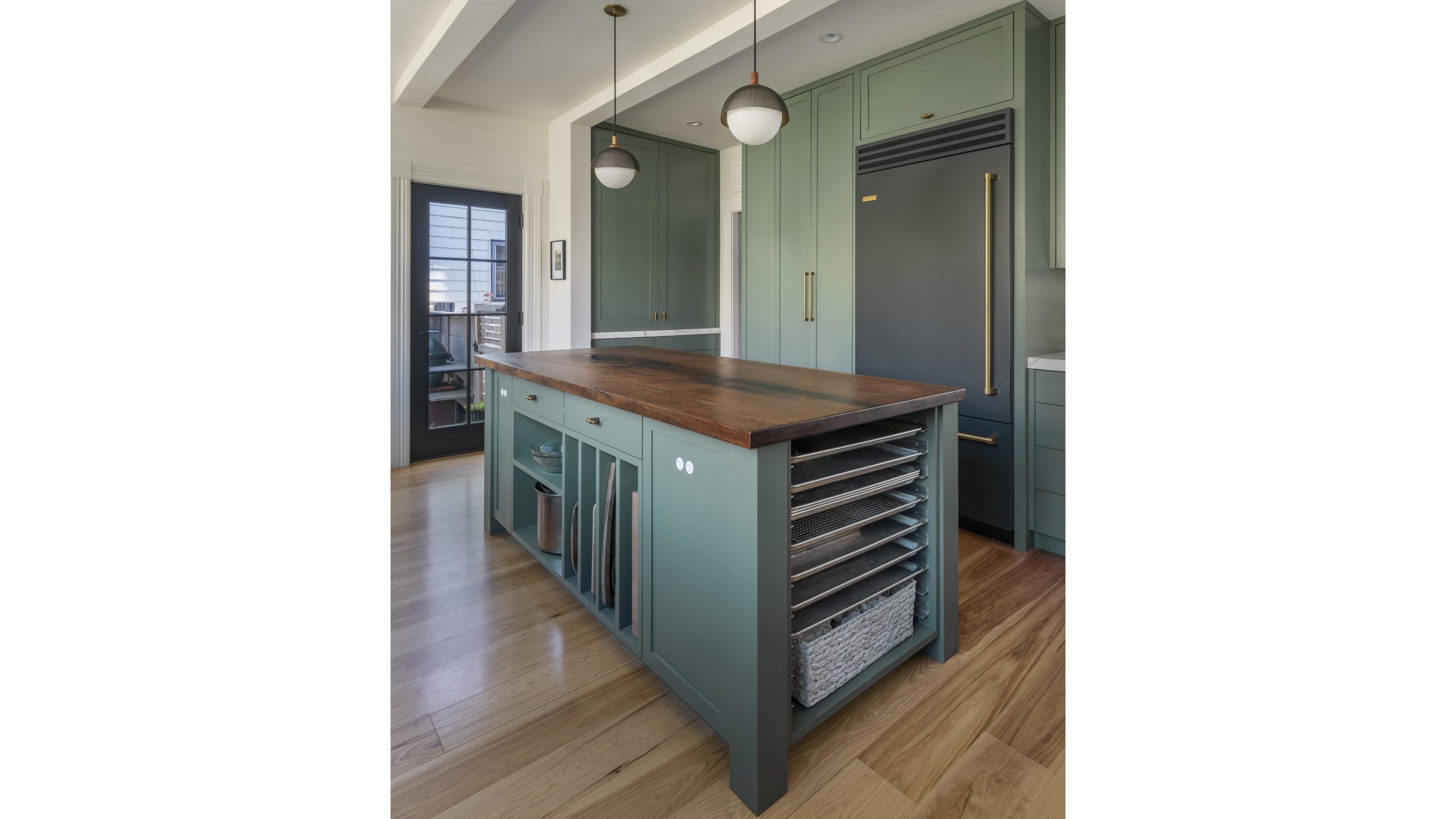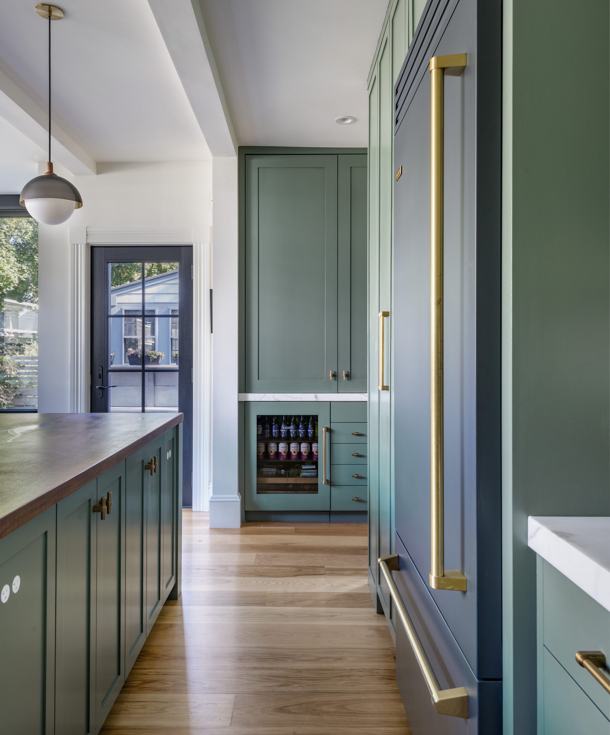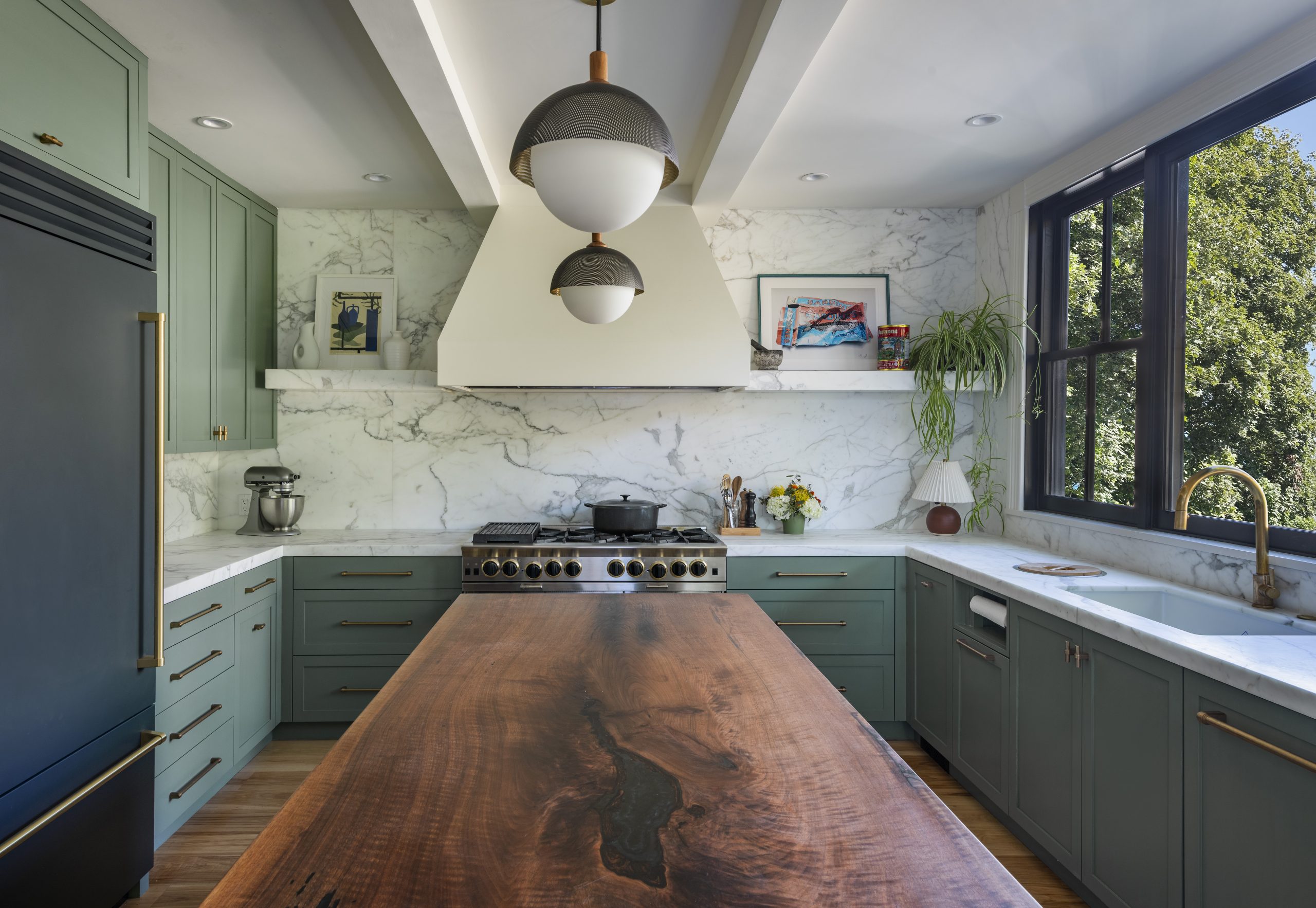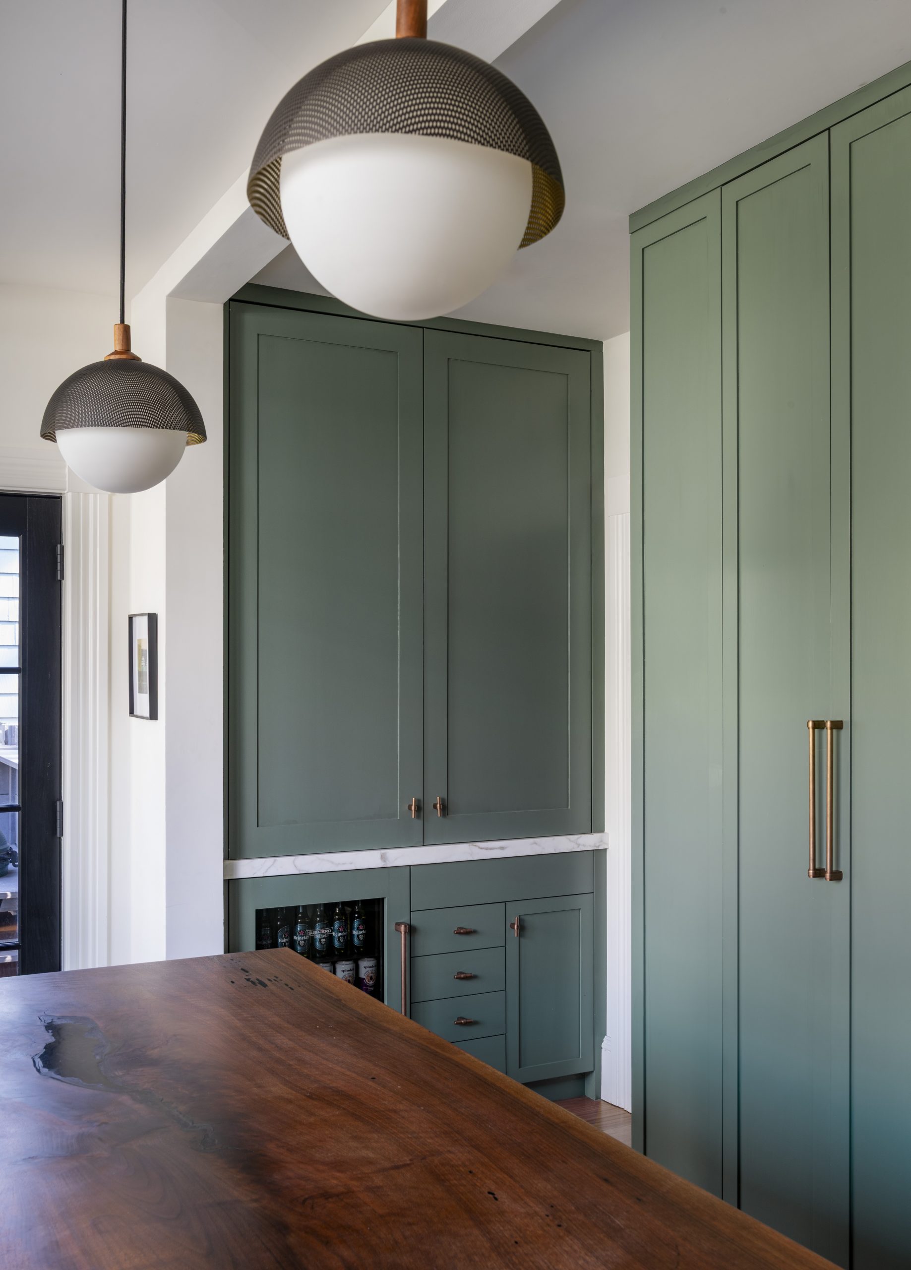 The kitchen is bathed in light, which streams in the new large window overlooking the new backyard. A large BlueStar range dominates one end in front of a full height Calacatta marble backsplash with floating shelves. A matching BlueStar fridge, and lots of storage in a complementary green, and a wet bar complete the perimeter, while an island dominates the center The highly walnut slab, from one single tree, sits on a custom base. Unlike most islands, this is truly a chef’s kitchen island, with built in cooling racks on the end opposite the ovens, and open storage for easy access.