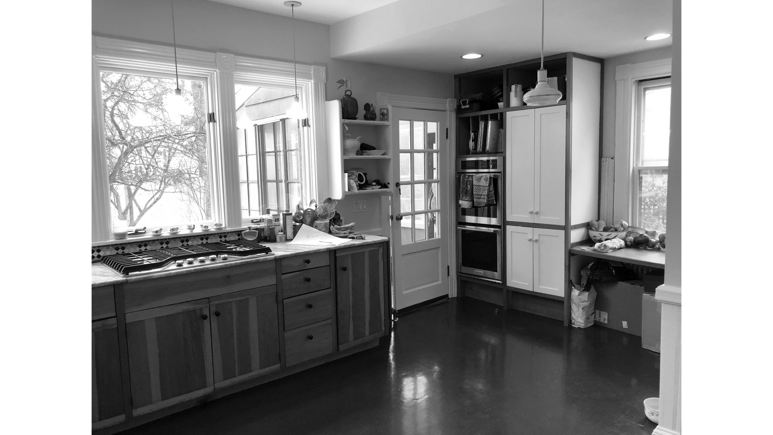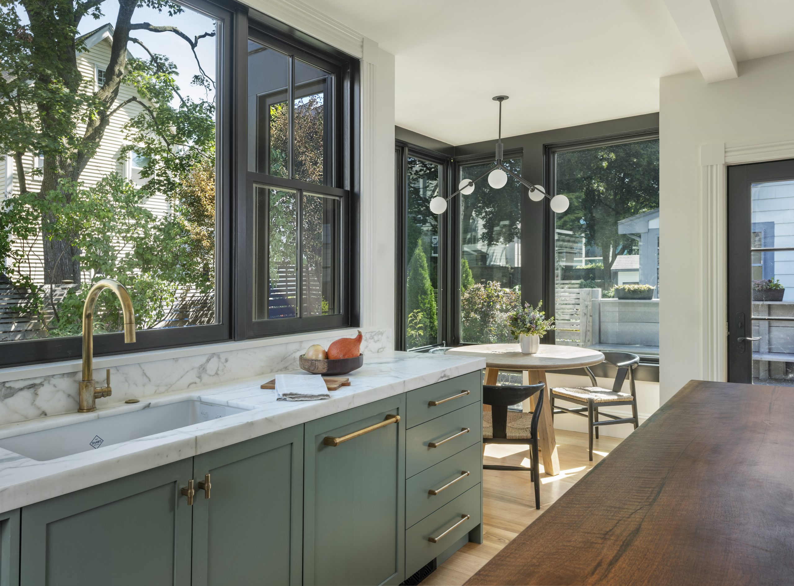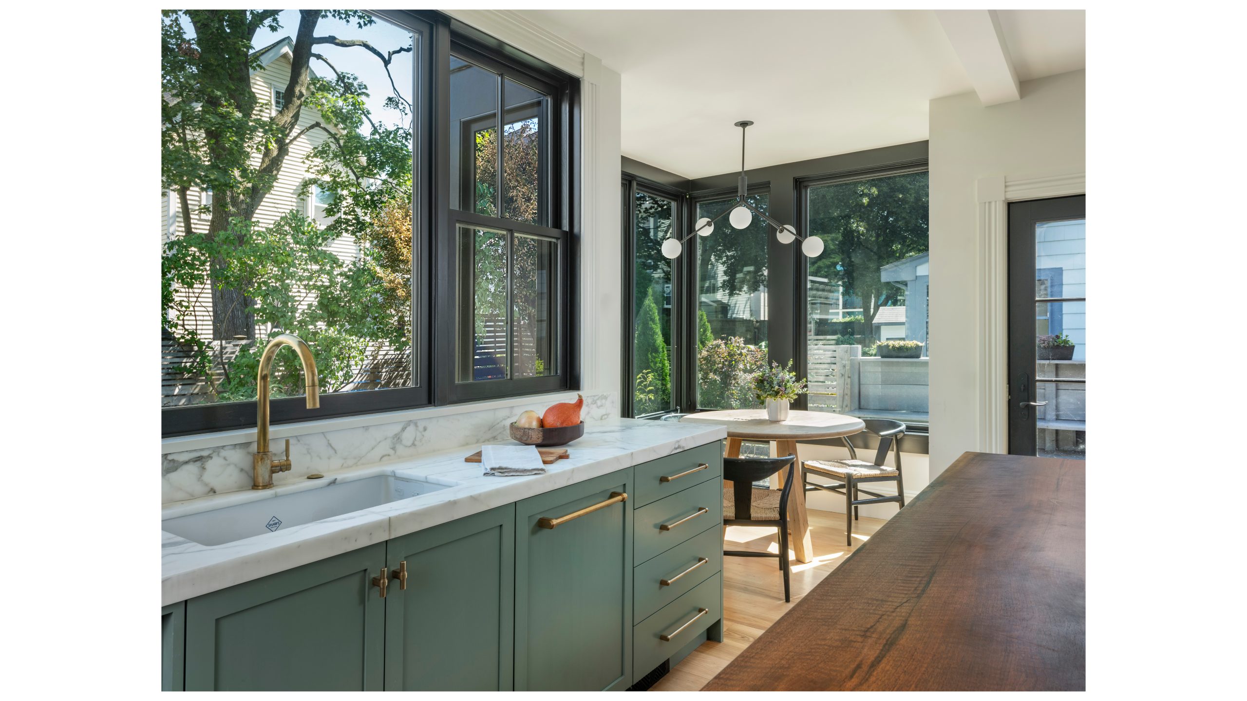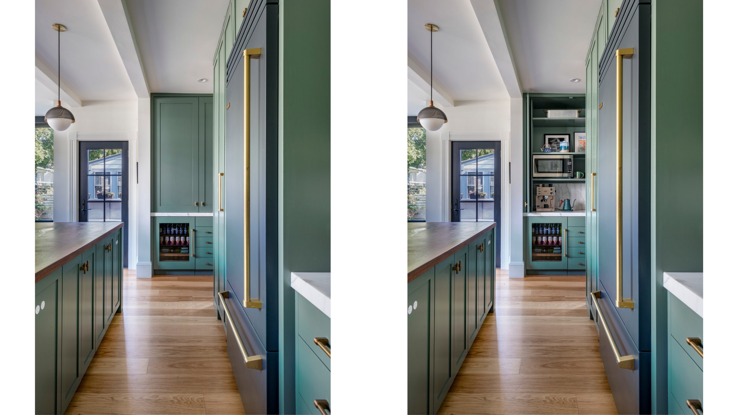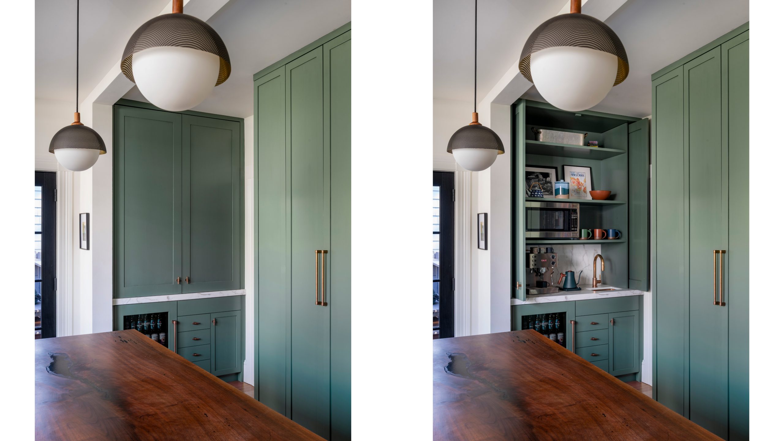 The kitchen is bathed in light, which streams in the new large window overlooking the new backyard. A large BlueStar range dominates one end in front of a full height Calacatta marble backsplash with floating shelves. A matching BlueStar fridge, and lots of storage in a complementary green, and a wet bar complete the perimeter, while an island dominates the center The highly walnut slab, from one single tree, sits on a custom base. Unlike most islands, this is truly a chef’s kitchen island, with built in cooling racks on the end opposite the ovens, and open storage for easy access.