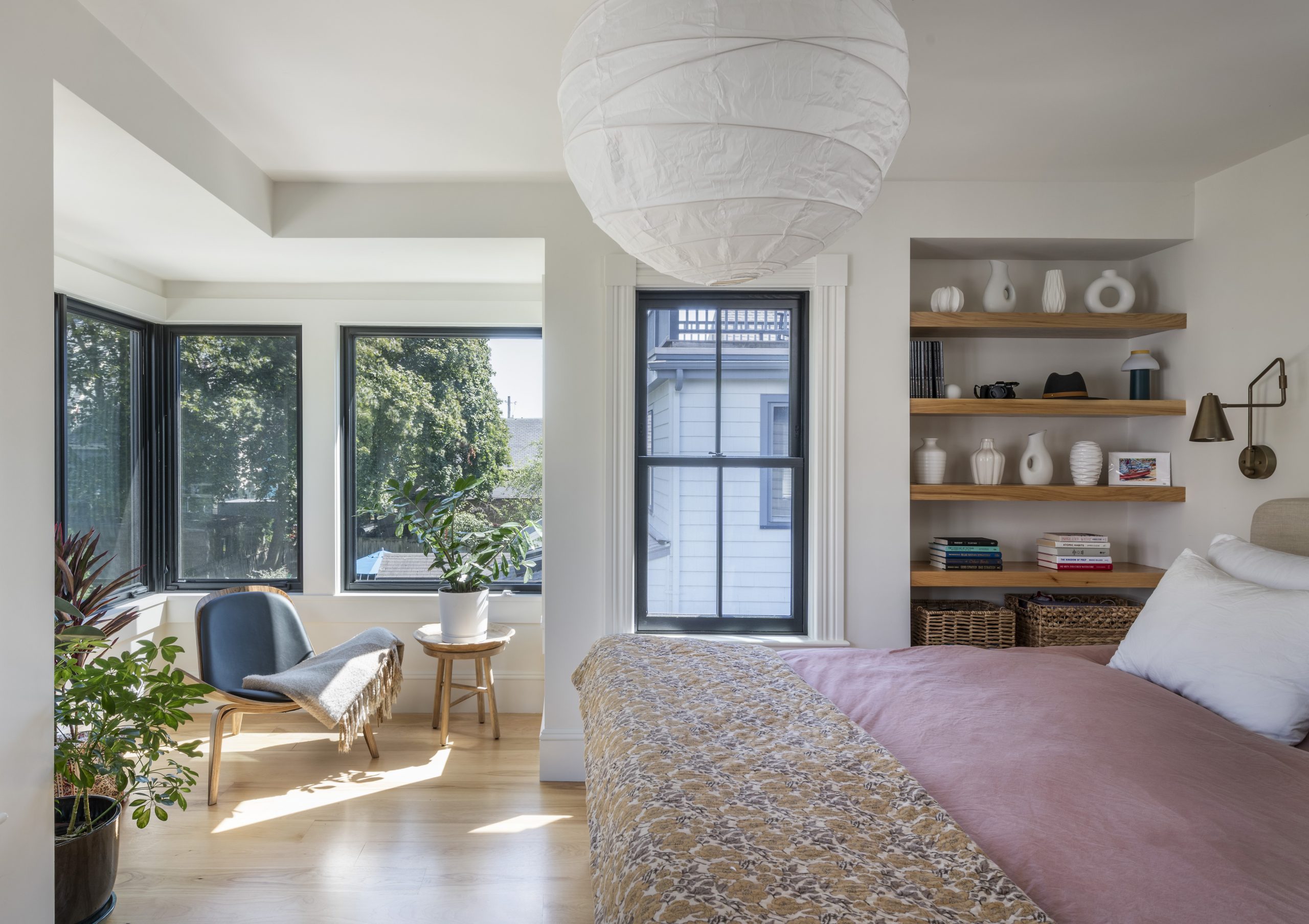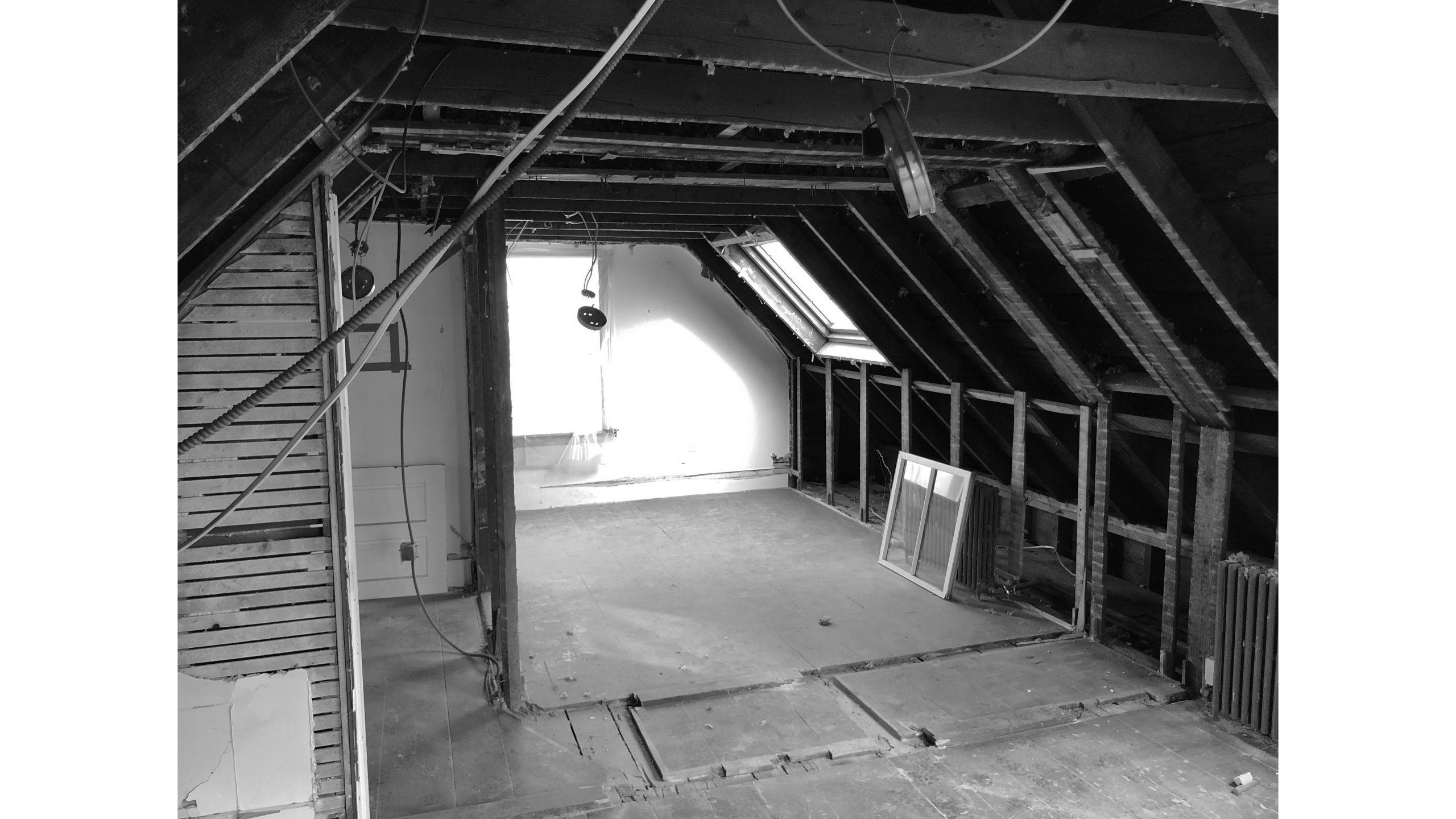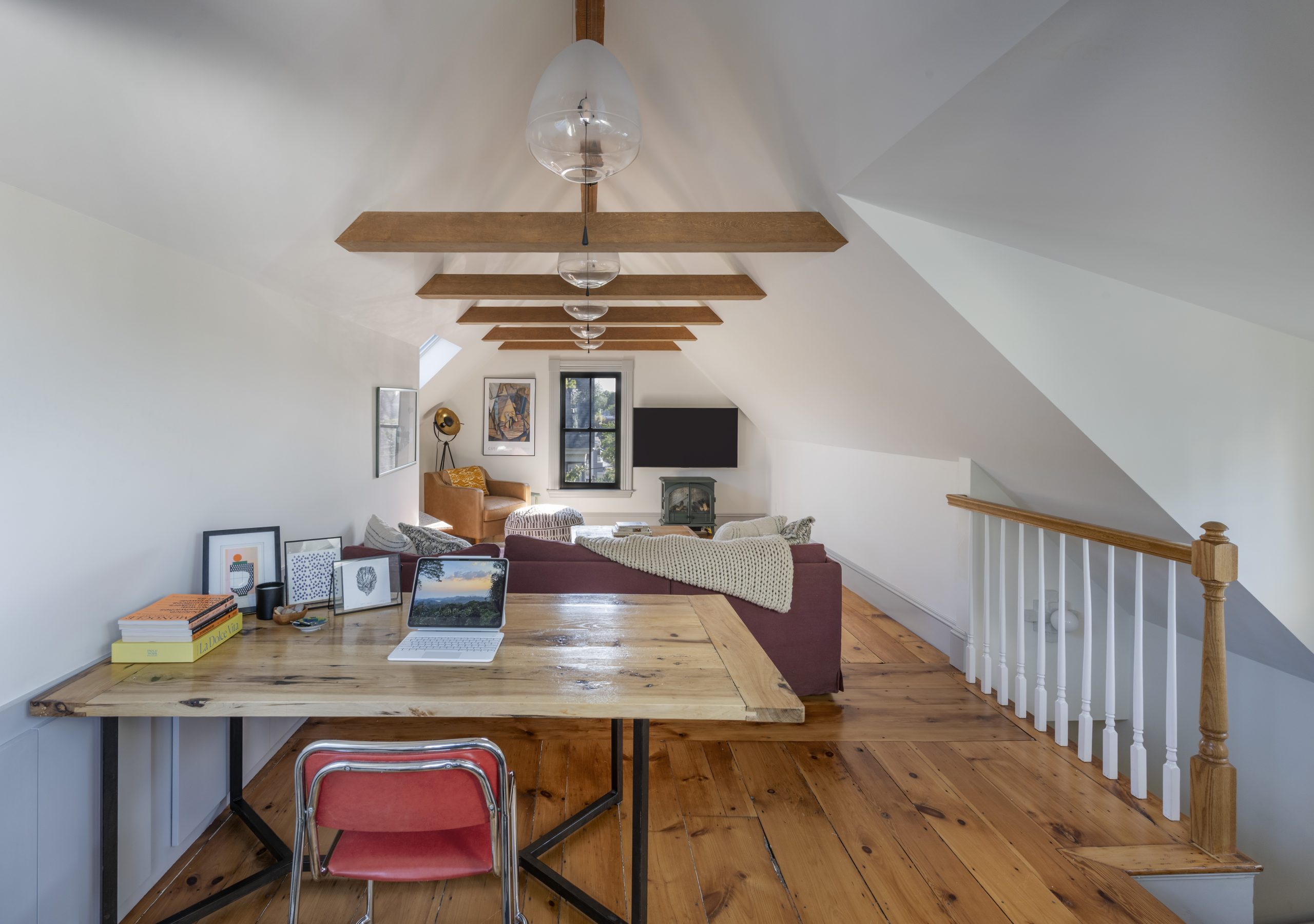 The attic space under the roof was opened up; the existing structure was simple 2x lumber rafters ties, which didn’t clean up well when exposed, so we doubled them and removed alternate ties, and clad them in natural wood. The original floor, sanded, remains.