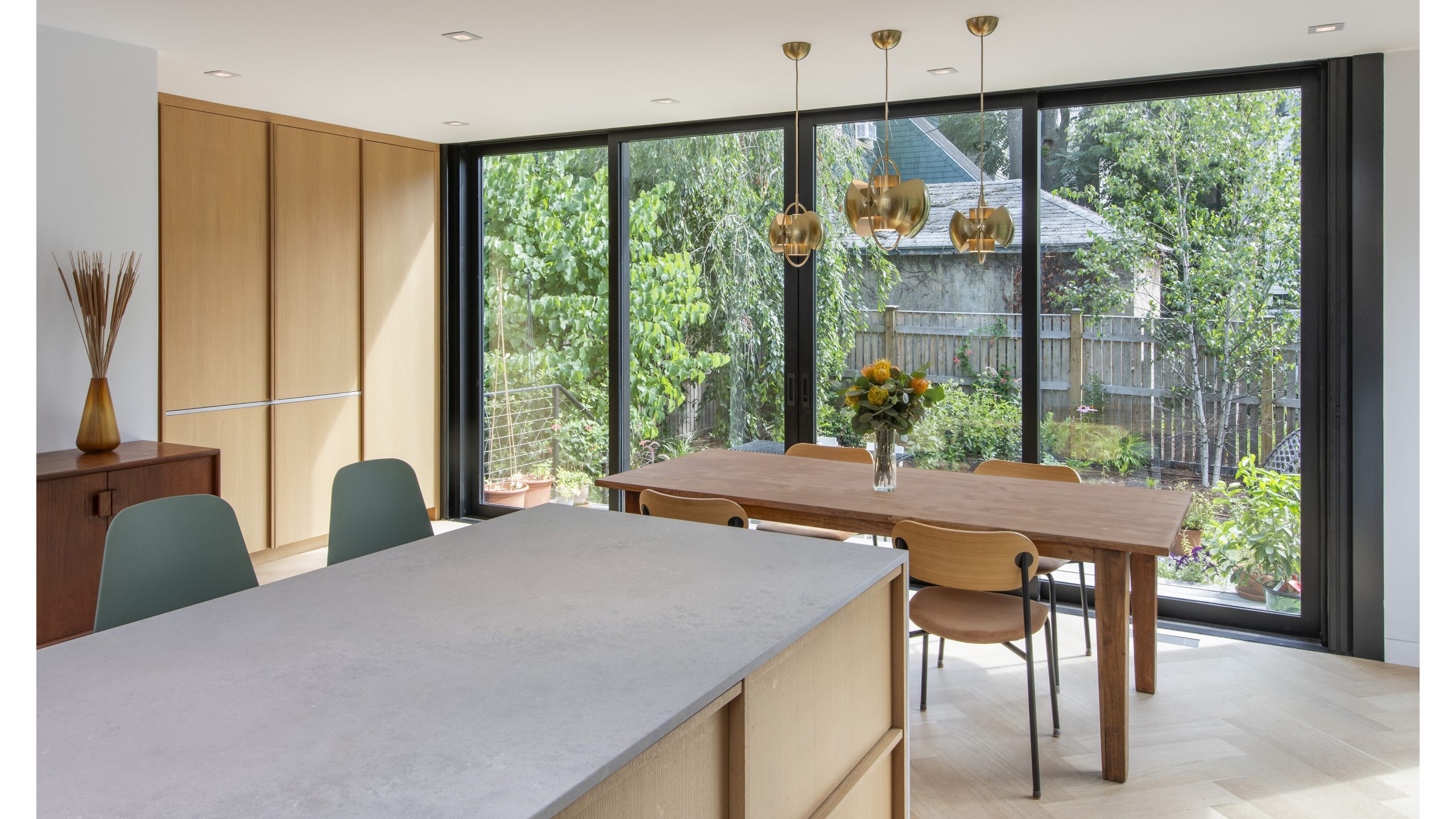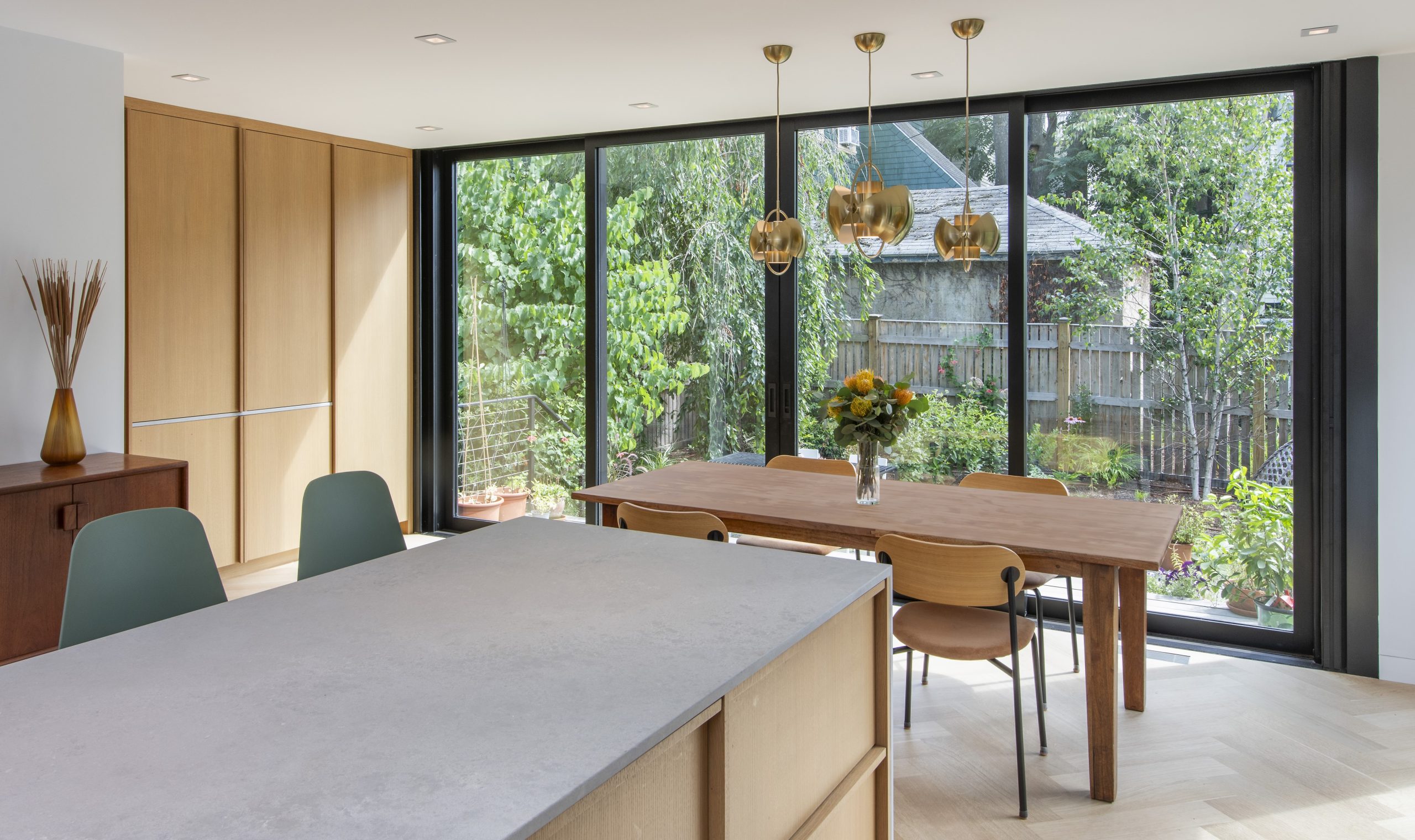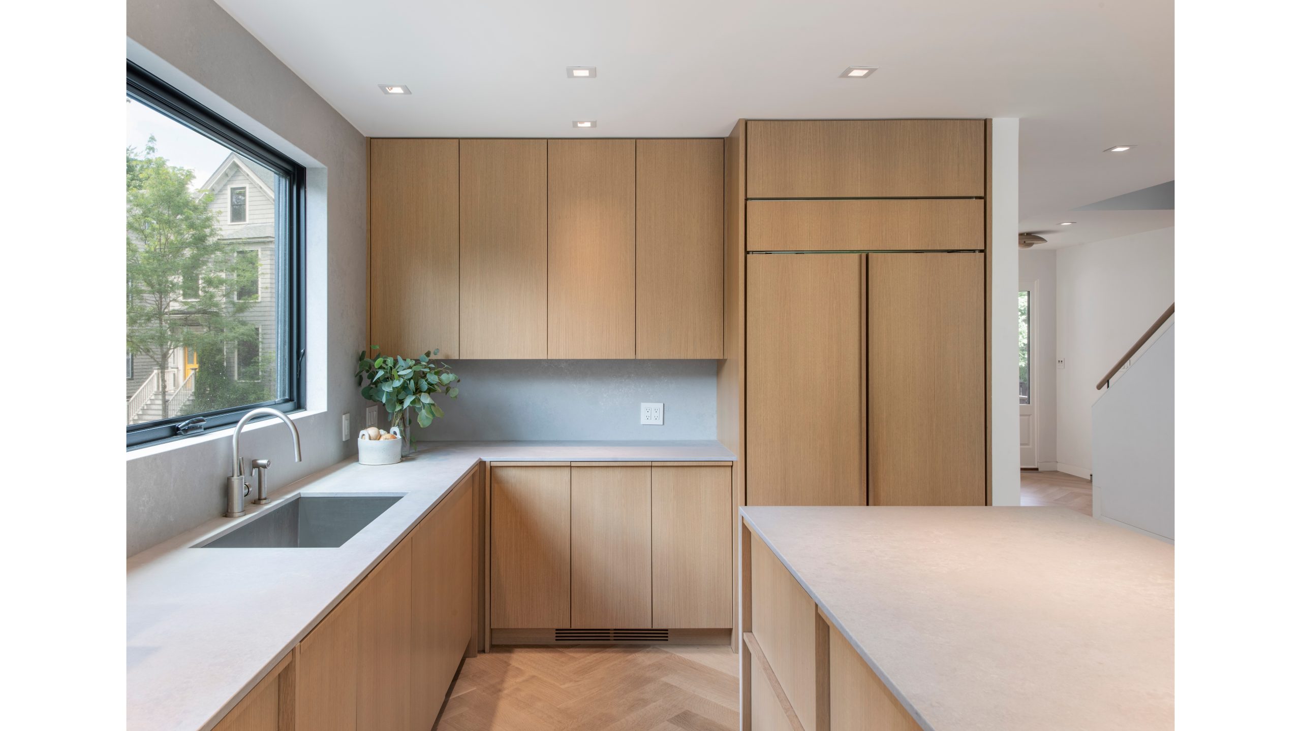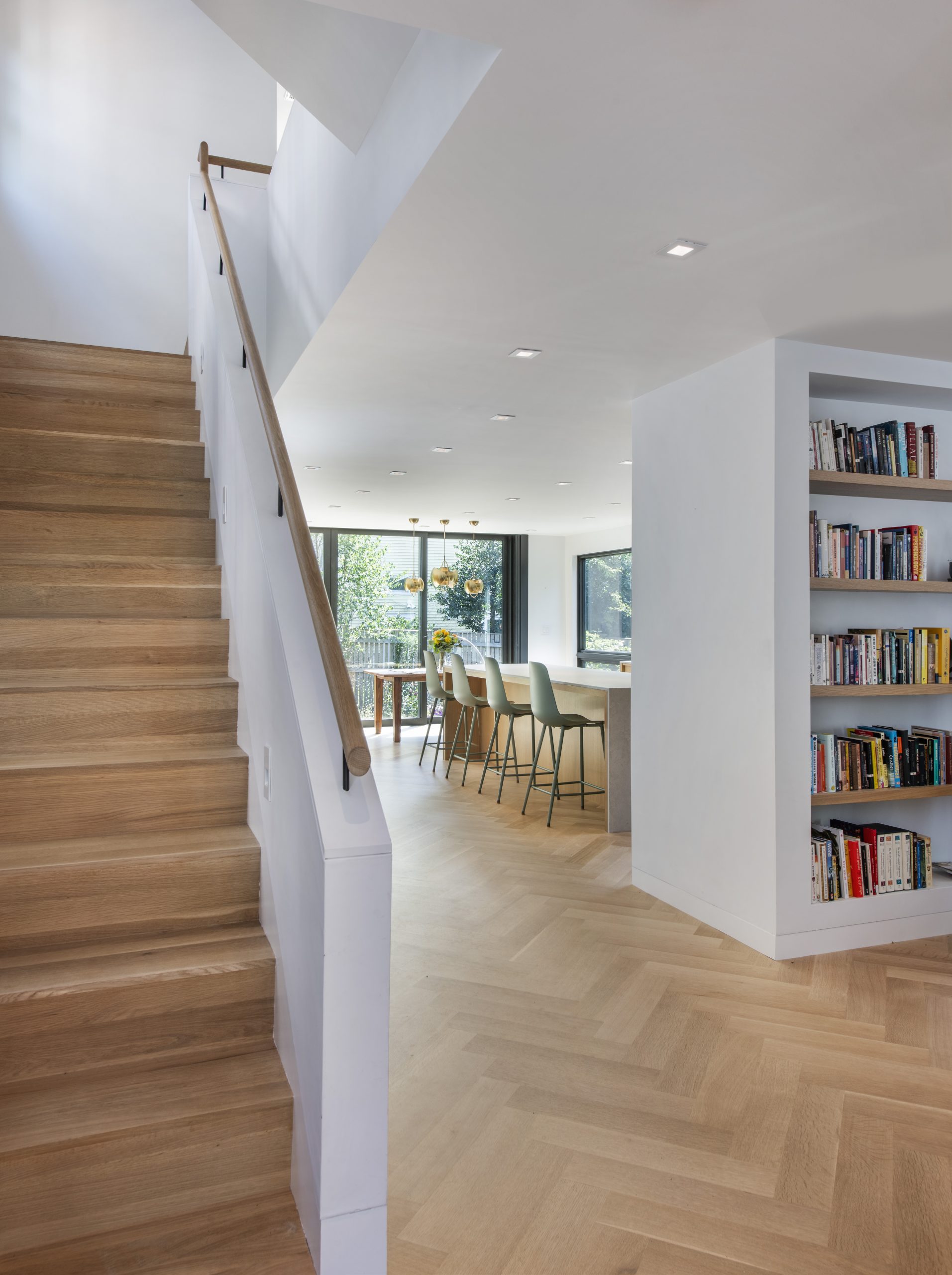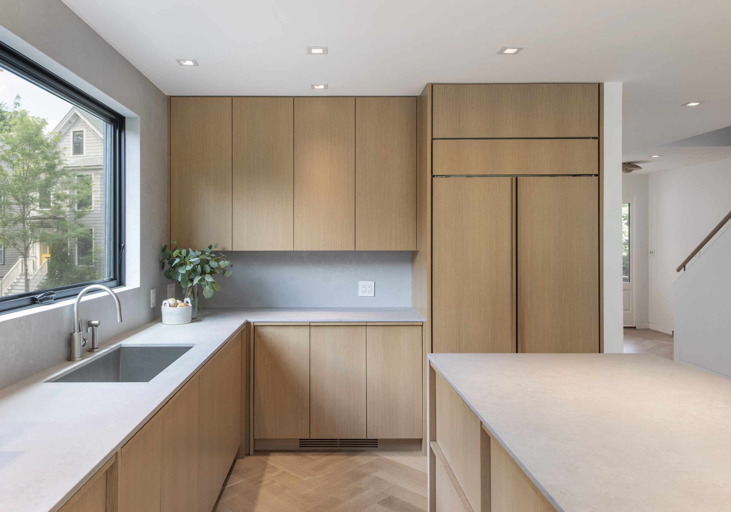 Our clients, a young couple with two young children, purchased a two-family rental in Cambridge and wanted to turn it into a single family home. The aesthetic mandate was to be clean, bright, light and modern. Functionally, the biggest challenge were the winder stairs, which were steep and had a very low head clearance, so the first order of business was to figure out where and how a single stair could be introduced. After many studies, we elected to leave the stair in its current location, but expand a dormer on the top floor to make the stair work. Now, the ribbon stair with custom brackets and railing unify the house, from family living spaces on the ground level to the bedrooms and office/yoga on the top floor. The detailing is crisp and simple; a European door system that provides full heights doors to the ceiling and an integrated base set the tone for the crisp details elsewhere. The biggest changes to the interior are on the ground level, where several small rooms were opened up to create a floor through space with a family/living room, kitchen, and dining areas. At the back, the house extends into the landscape with large double lift and slide doors to the terrace and yard. Inside, details and materials are simple. Oak floors in a herringbone provide some visual complexity, while the cabinets are detailed with no visible pulls. The cabinet design looks deceptively simple, but the detailing doesn’t allow for hinged doors so all storage is in drawers. Rift oak cabinets and a simple palate of gray and white set a calm foundation for family life. On the first floor, massive doors open to the yard beyond, expanding the house both visually and functionally.
