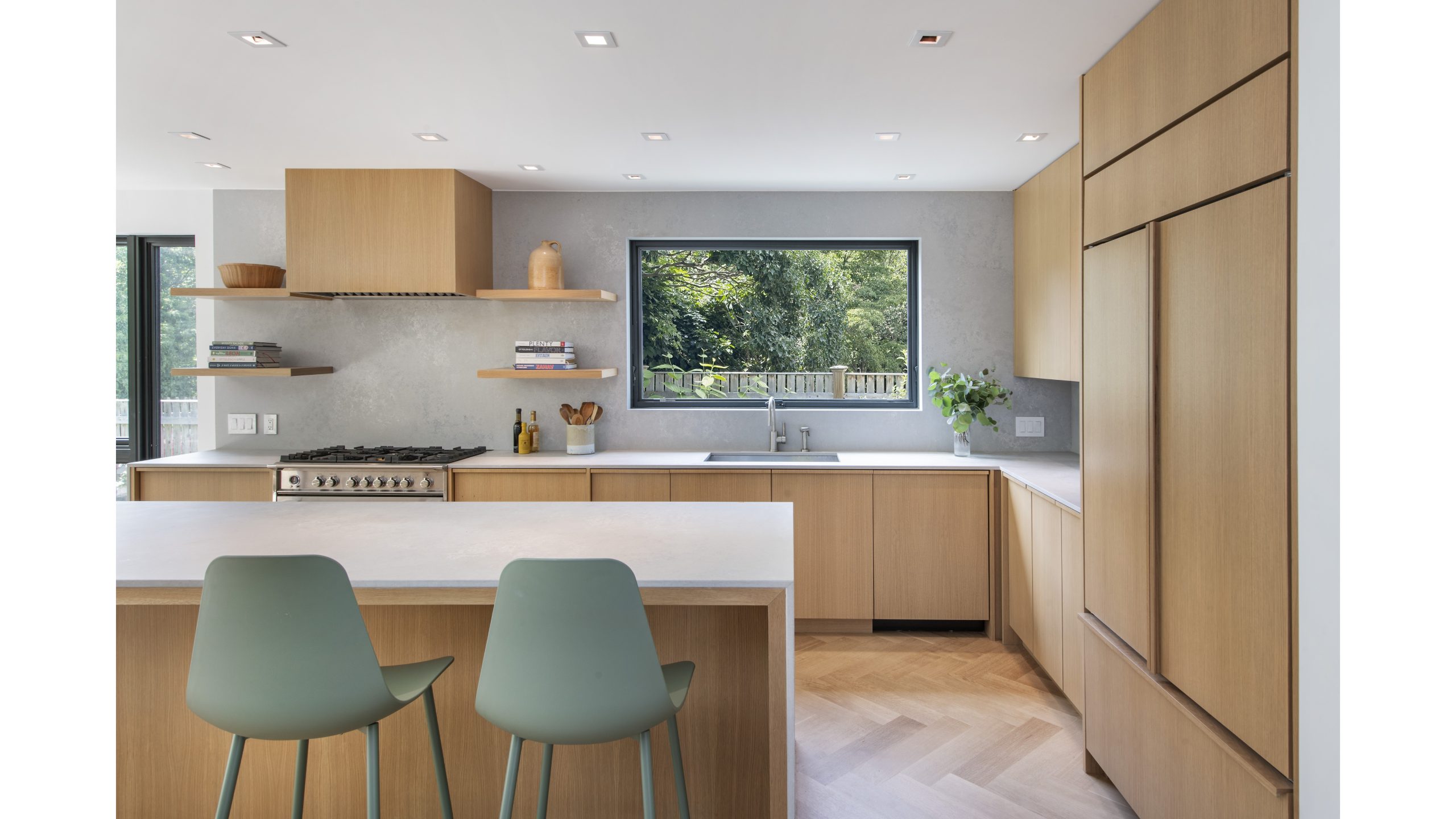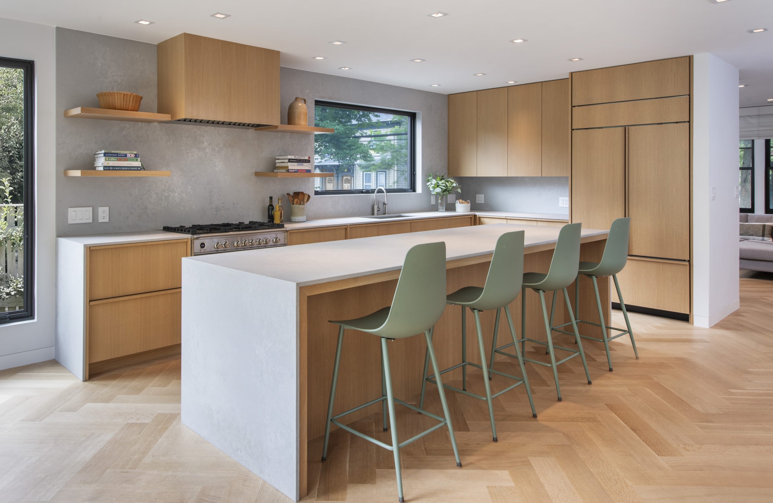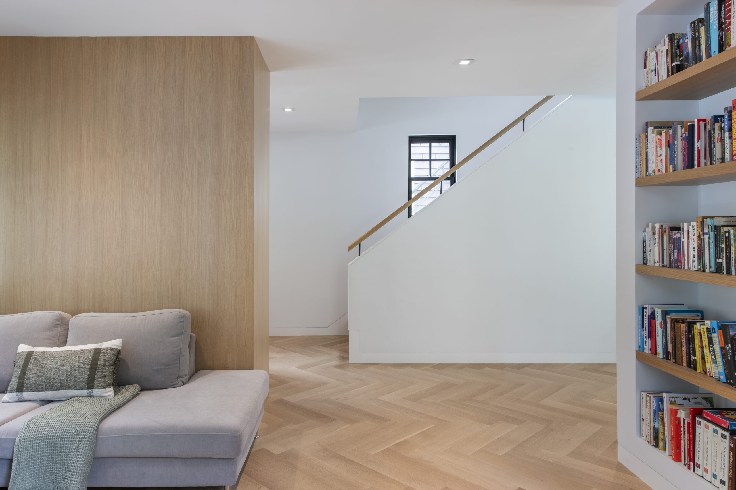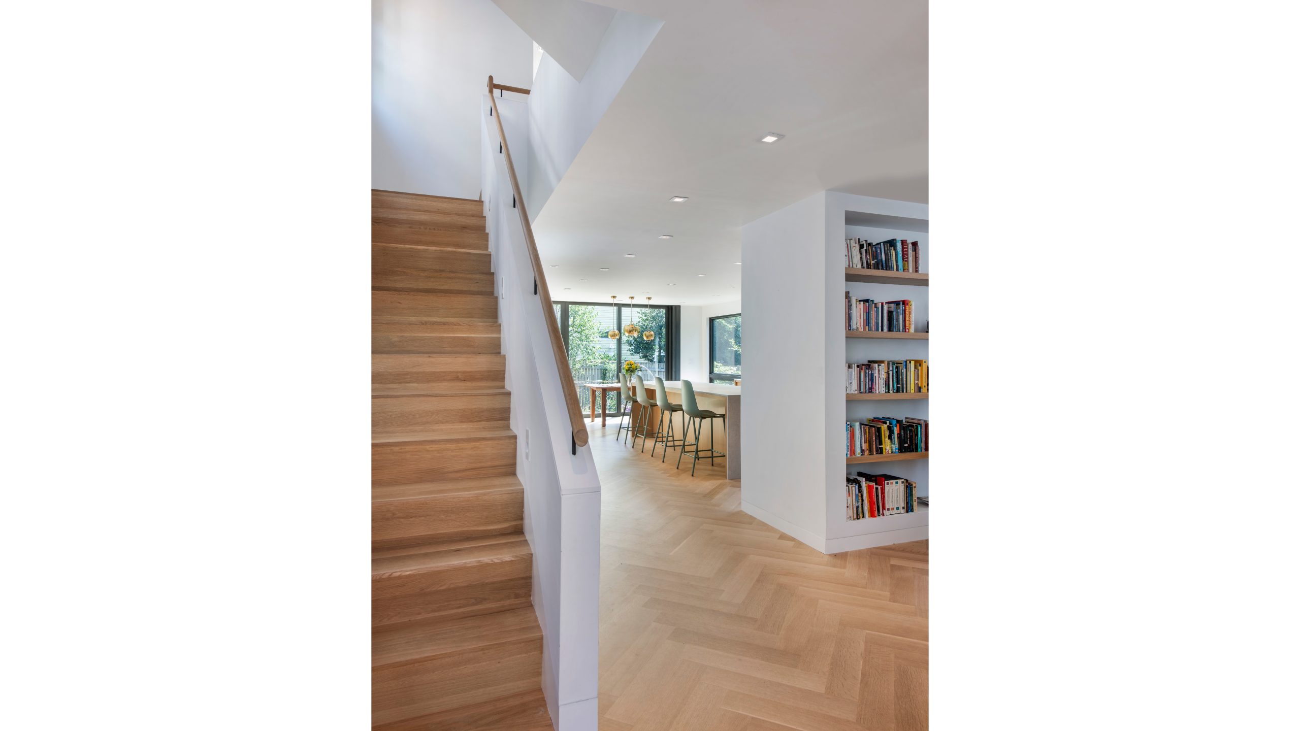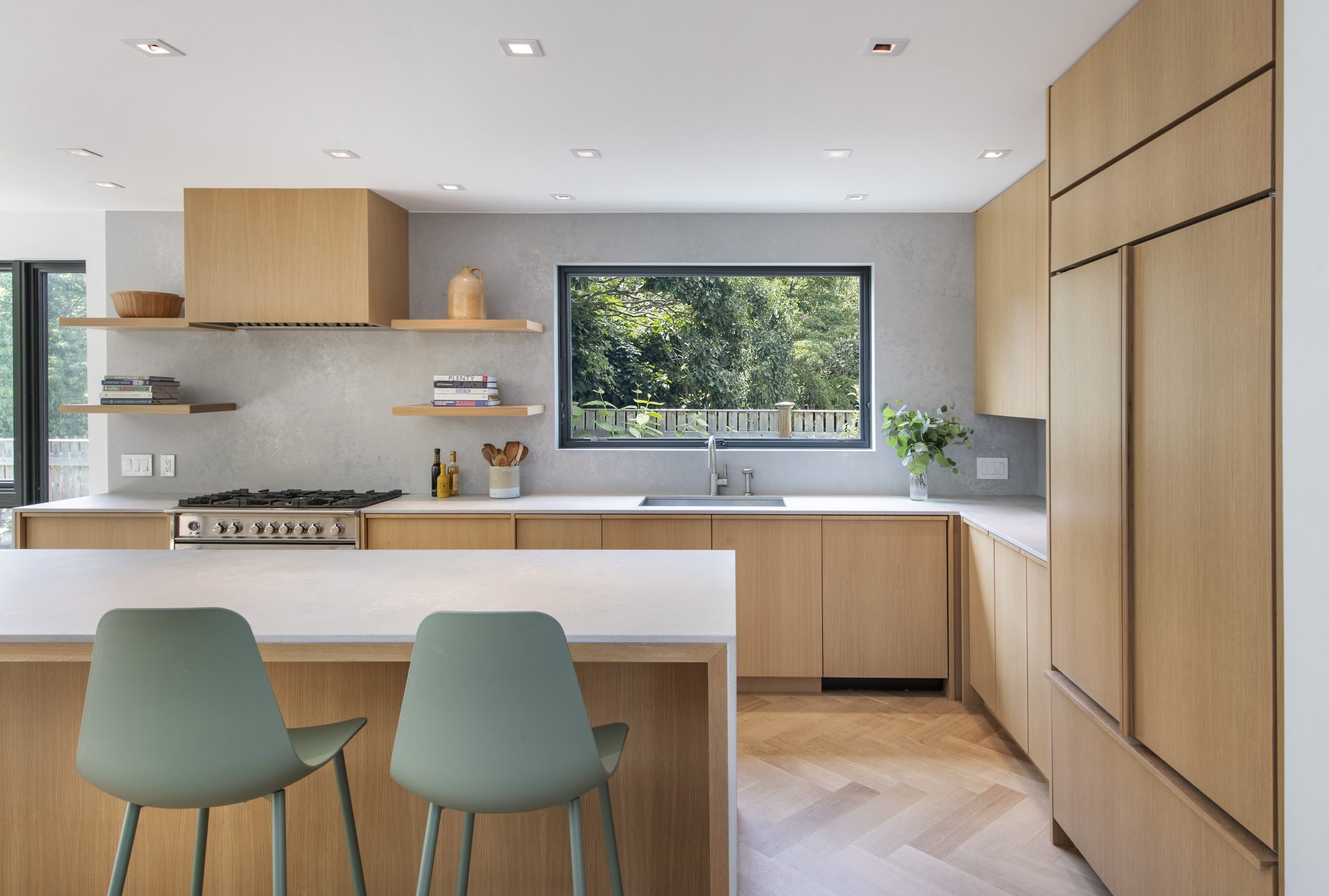 Our clients, a young couple with two young children, purchased a two-family rental in Cambridge and wanted to turn it into a single family home. The aesthetic mandate was to be clean, bright, light and modern. Functionally, the biggest challenge were the winder stairs, which were steep and had a very low head clearance, so the first order of business was to figure out where and how a single stair could be introduced. After many studies, we elected to leave the stair in its current location, but expand a dormer on the top floor to make the stair work. Now, the ribbon stair with custom brackets and railing unify the house, from family living spaces on the ground level to the bedrooms and office/yoga on the top floor. The detailing is crisp and simple; a European door system that provides full heights doors to the ceiling and an integrated base set the tone for the crisp details elsewhere. The biggest changes to the interior are on the ground level, where several small rooms were opened up to create a floor through space with a family/living room, kitchen, and dining areas. At the back, the house extends into the landscape with large double lift and slide doors to the terrace and yard. Inside, details and materials are simple. Oak floors in a herringbone provide some visual complexity, while the cabinets are detailed with no visible pulls. The cabinet design looks deceptively simple, but the detailing doesn’t allow for hinged doors so all storage is in drawers. Rift oak cabinets and a simple palate of gray and white set a calm foundation for family life. On the first floor, massive doors open to the yard beyond, expanding the house both visually and functionally.