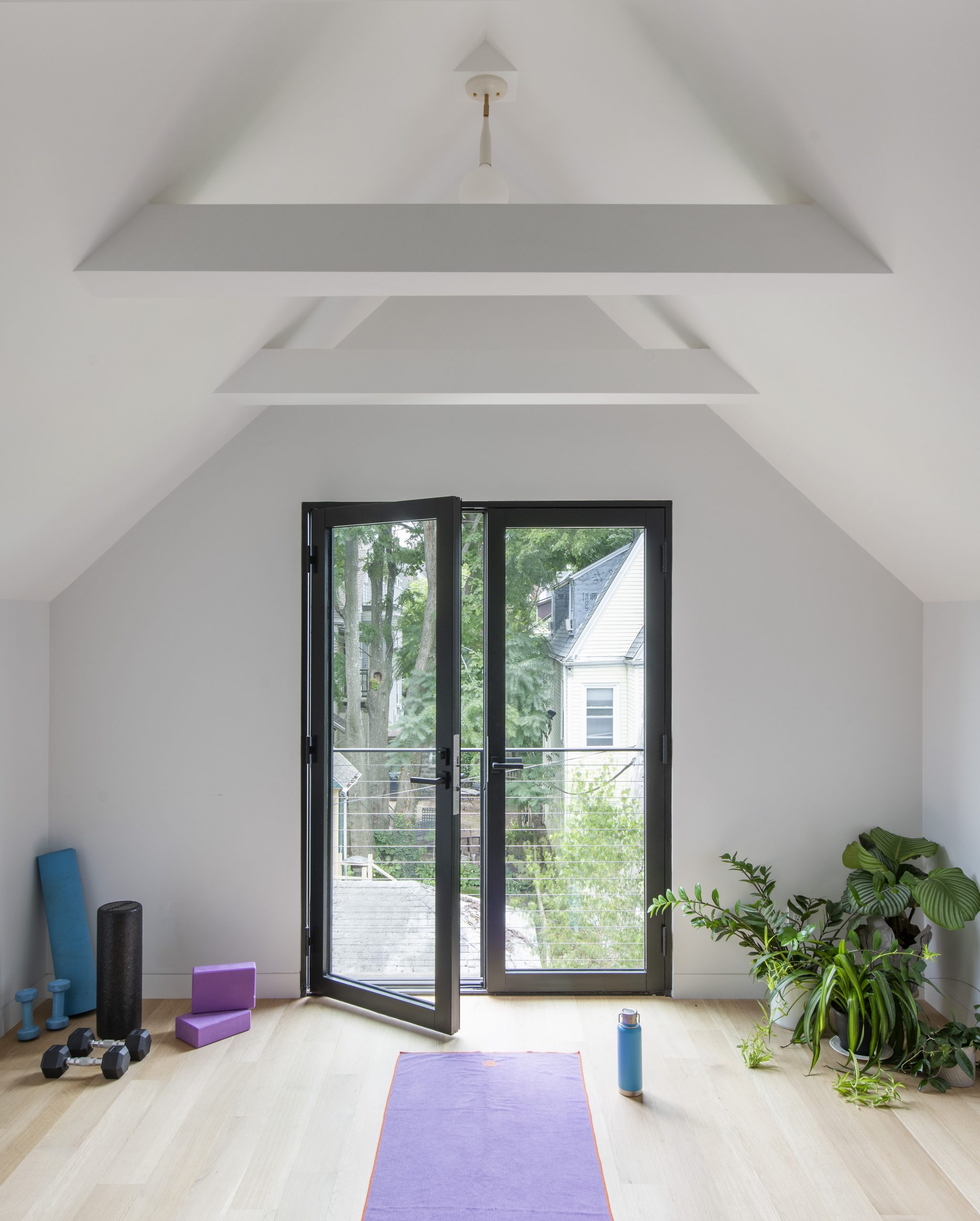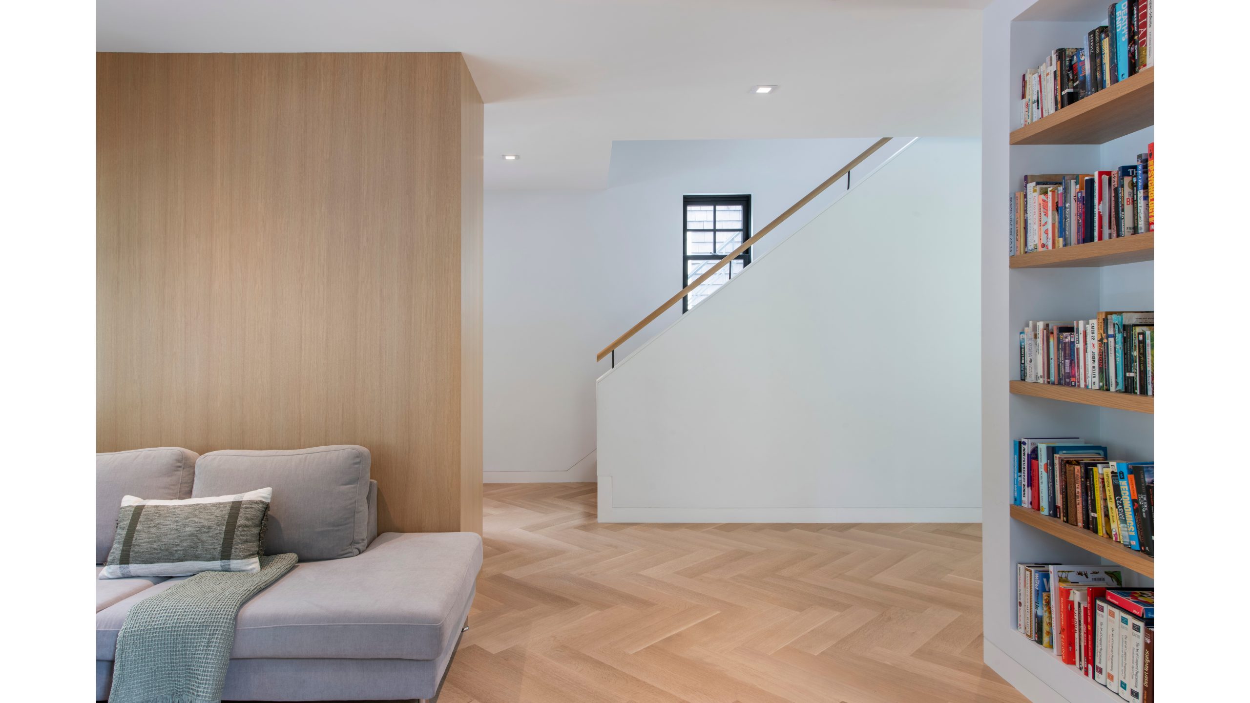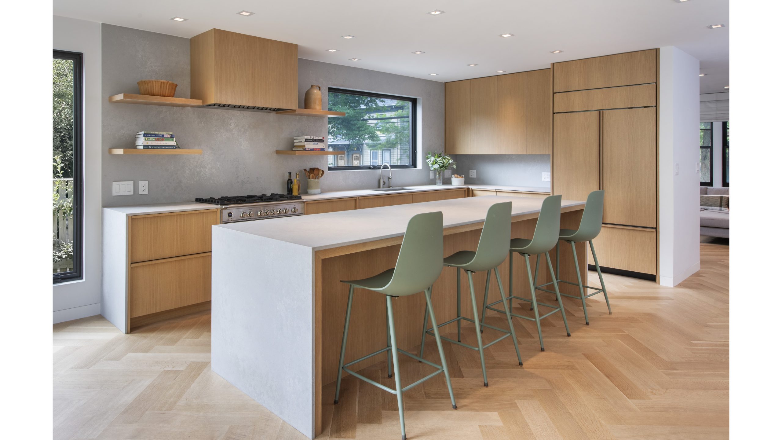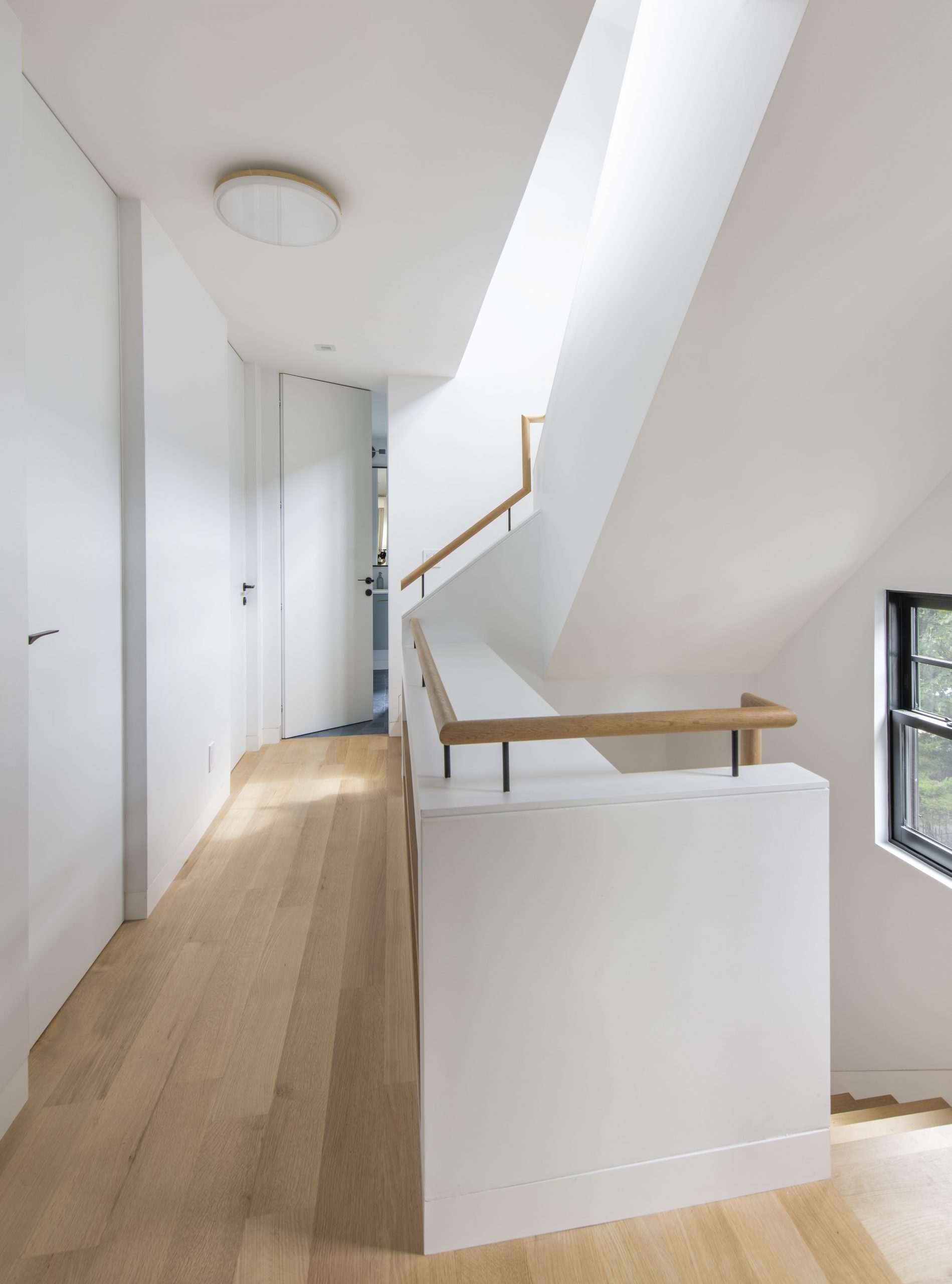 Our clients, a young couple with two young children, purchased a two-family rental in Cambridge and wanted to turn it into a single family home. The aesthetic mandate was to be clean, bright, light and modern. Functionally, the biggest challenge were the winder stairs, which were steep and had a very low head clearance, so the first order of business was to figure out where and how a single stair could be introduced. After many studies, we elected to leave the stair in its current location, but expand a dormer on the top floor to make the stair work. Now, the ribbon stair with custom brackets and railing unify the house, from family living spaces on the ground level to the bedrooms and office/yoga on the top floor. The detailing is crisp and simple; a European door system that provides full heights doors to the ceiling and an integrated base set the tone for the crisp details elsewhere. The biggest changes to the interior are on the ground level, where several small rooms were opened up to create a floor through space with a family/living room, kitchen, and dining areas. At the back, the house extends into the landscape with large double lift and slide doors to the terrace and yard. Inside, details and materials are simple. Oak floors in a herringbone provide some visual complexity, while the cabinets are detailed with no visible pulls. The cabinet design looks deceptively simple, but the detailing doesn’t allow for hinged doors so all storage is in drawers. Rift oak cabinets and a simple palate of gray and white set a calm foundation for family life. On the first floor, massive doors open to the yard beyond, expanding the house both visually and functionally.