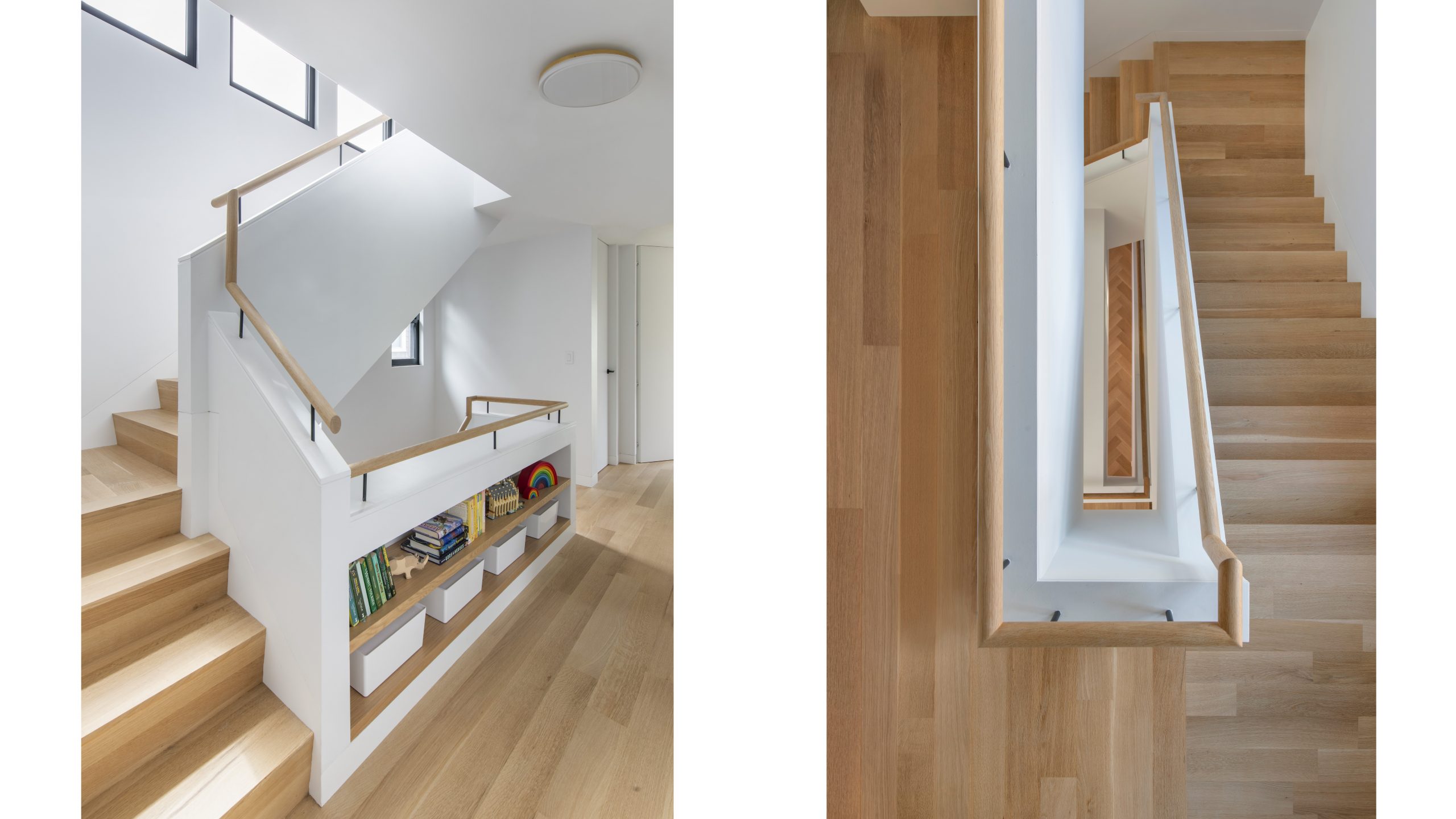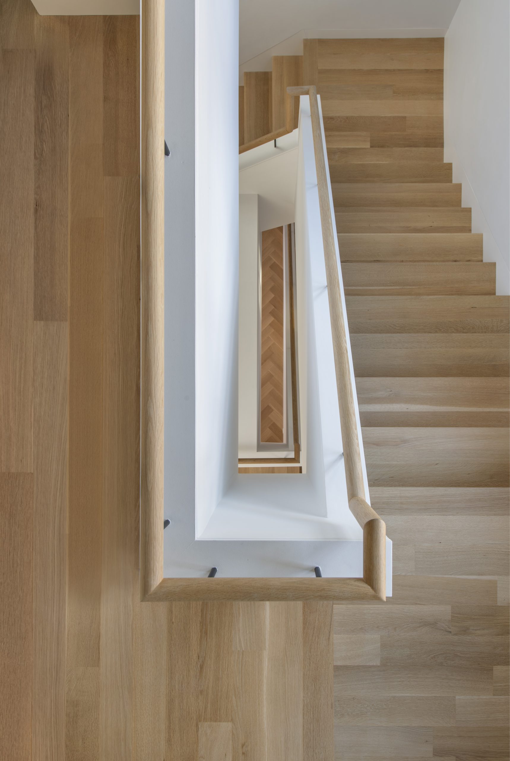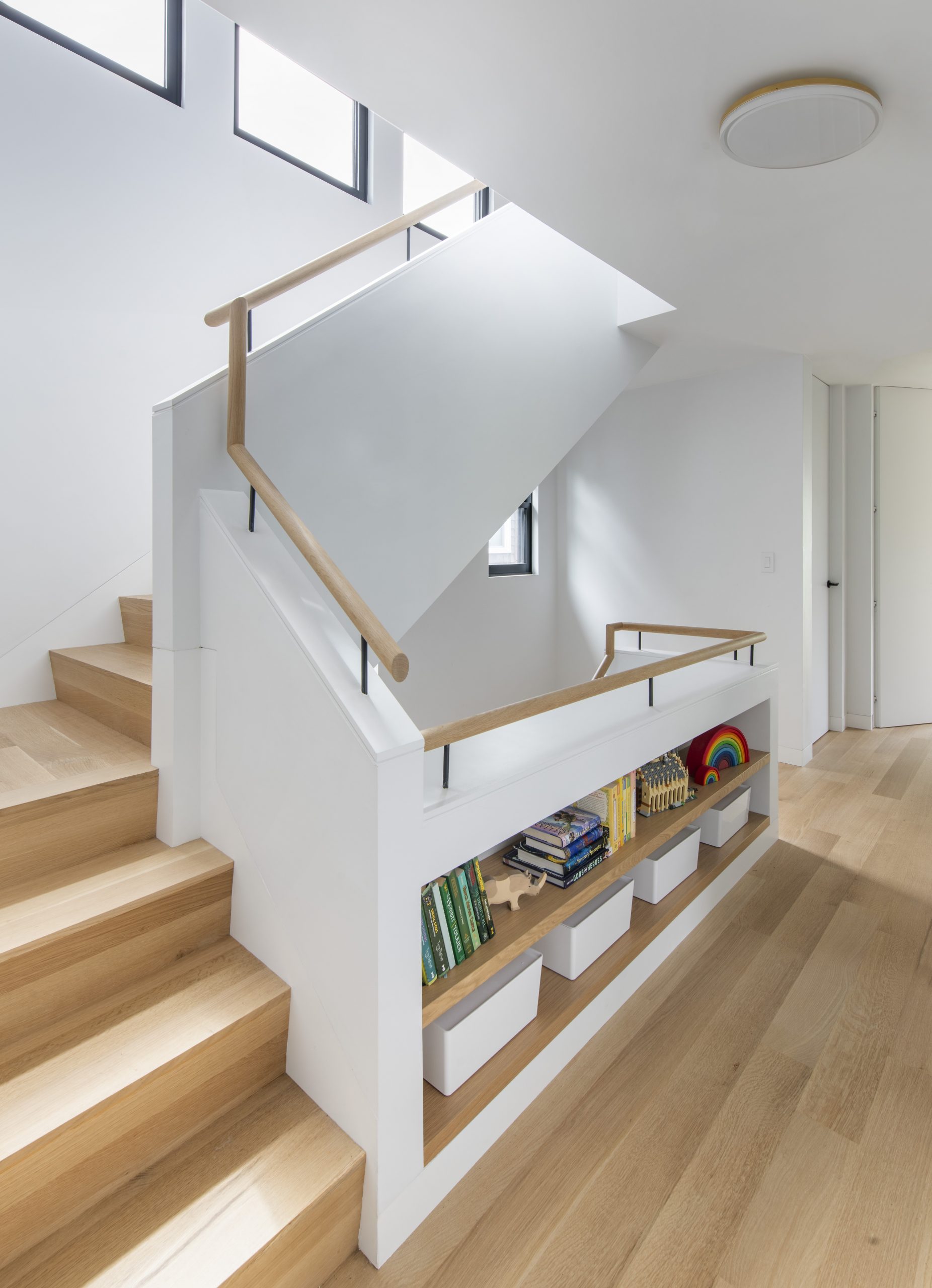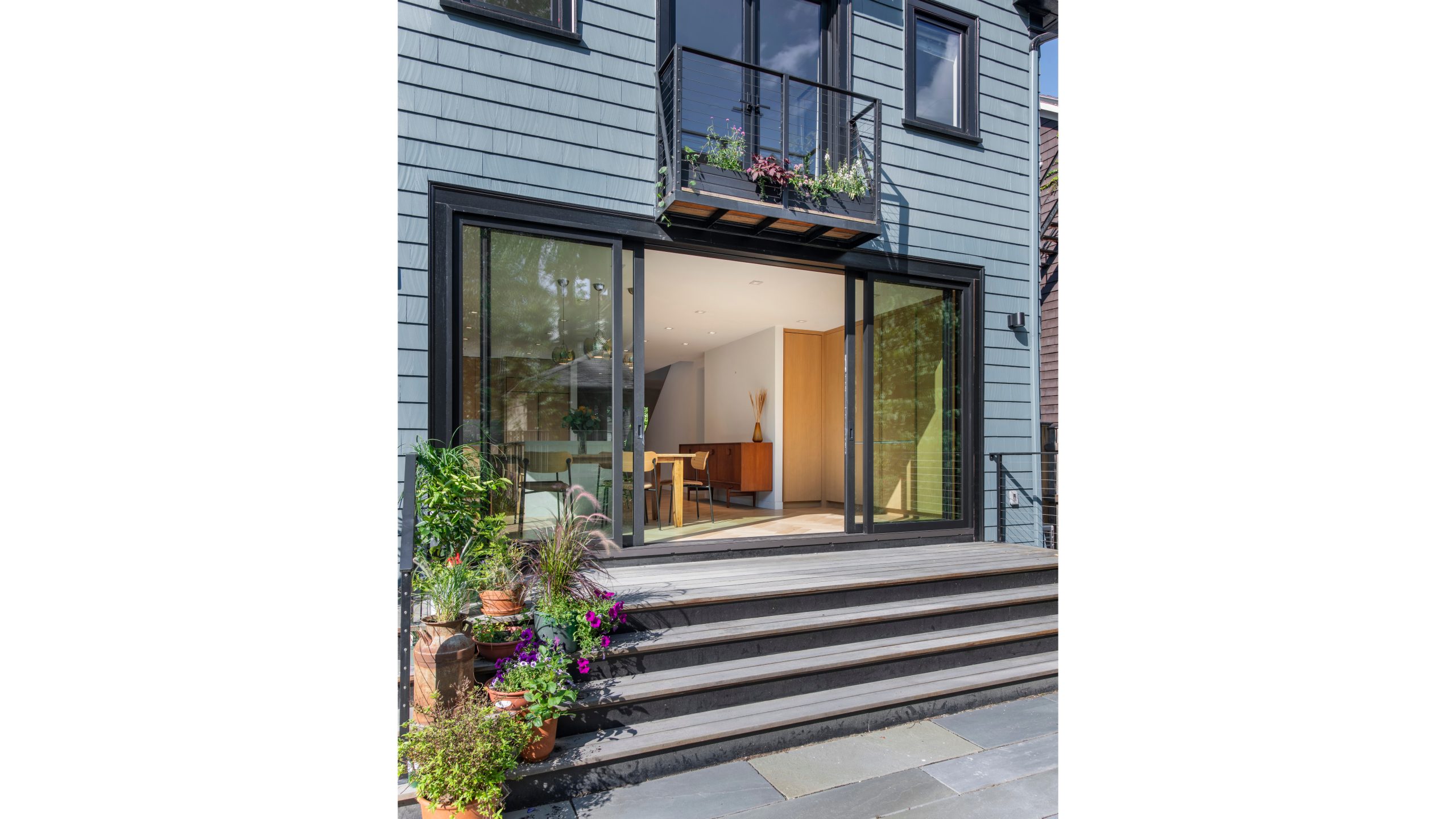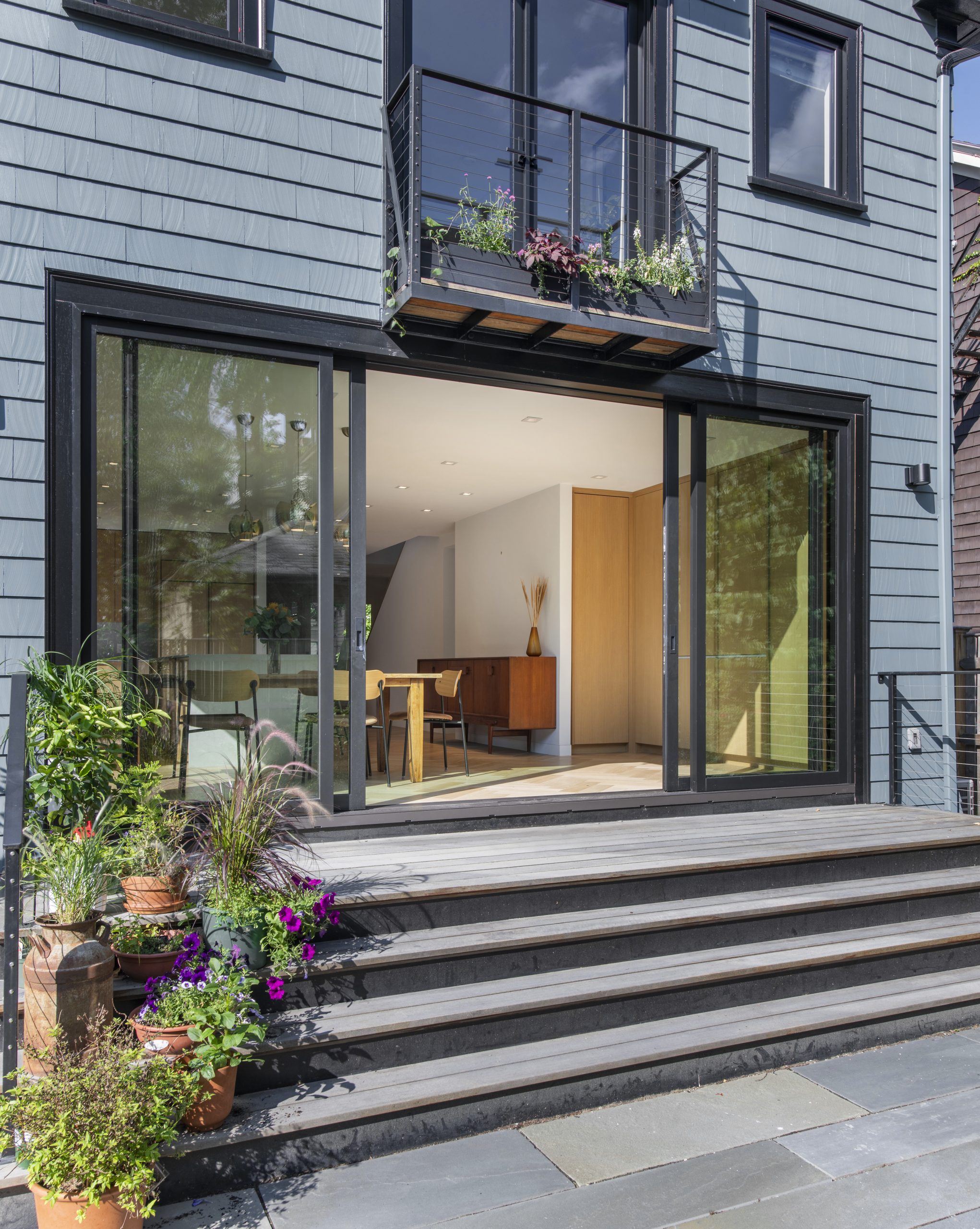Our clients, a young couple with two young children, purchased a two-family rental in Cambridge and wanted to turn it into a single family home. The aesthetic mandate was to be clean, bright, light and modern. Functionally, the biggest challenge were the winder stairs, which were steep and had a very low head clearance, so the first order of business was to figure out where and how a single stair could be introduced. After many studies, we elected to leave the stair in its current location, but expand a dormer on the top floor to make the stair work. Now, the ribbon stair with custom brackets and railing unify the house, from family living spaces on the ground level to the bedrooms and office/yoga on the top floor. The detailing is crisp and simple; a European door system that provides full heights doors to the ceiling and an integrated base set the tone for the crisp details elsewhere. The biggest changes to the interior are on the ground level, where several small rooms were opened up to create a floor through space with a family/living room, kitchen, and dining areas. At the back, the house extends into the landscape with large double lift and slide doors to the terrace and yard. Inside, details and materials are simple. Oak floors in a herringbone provide some visual complexity, while the cabinets are detailed with no visible pulls. The cabinet design looks deceptively simple, but the detailing doesn’t allow for hinged doors so all storage is in drawers. Rift oak cabinets and a simple palate of gray and white set a calm foundation for family life. On the first floor, massive doors open to the yard beyond, expanding the house both visually and functionally.