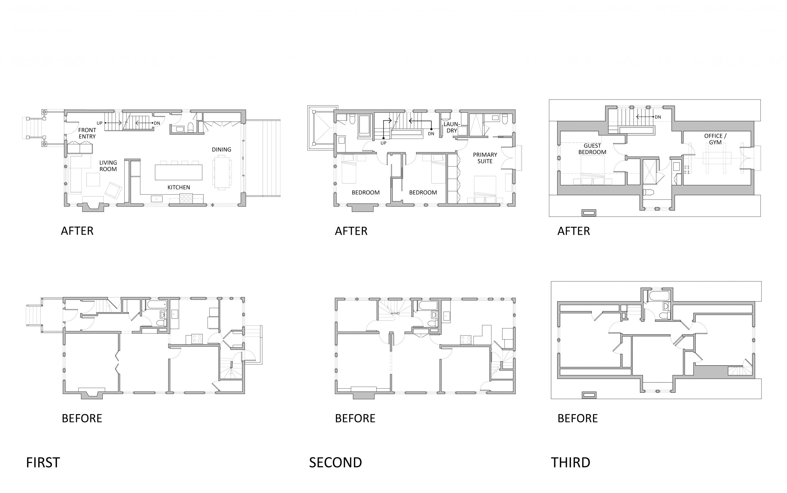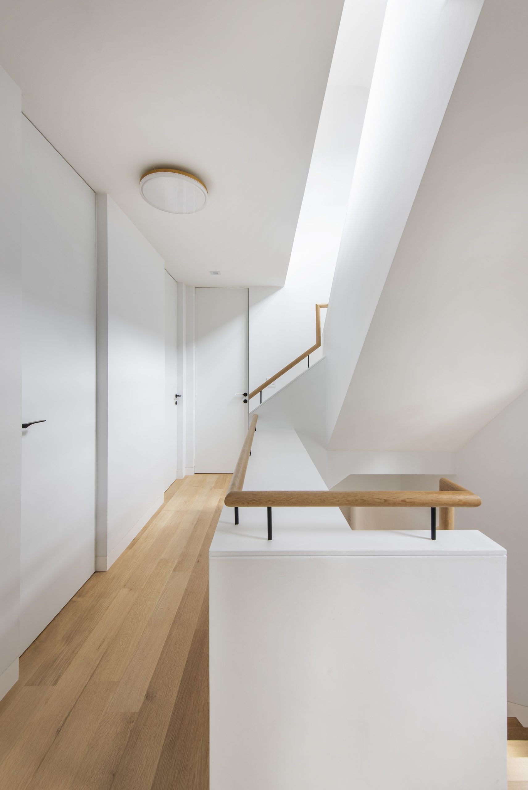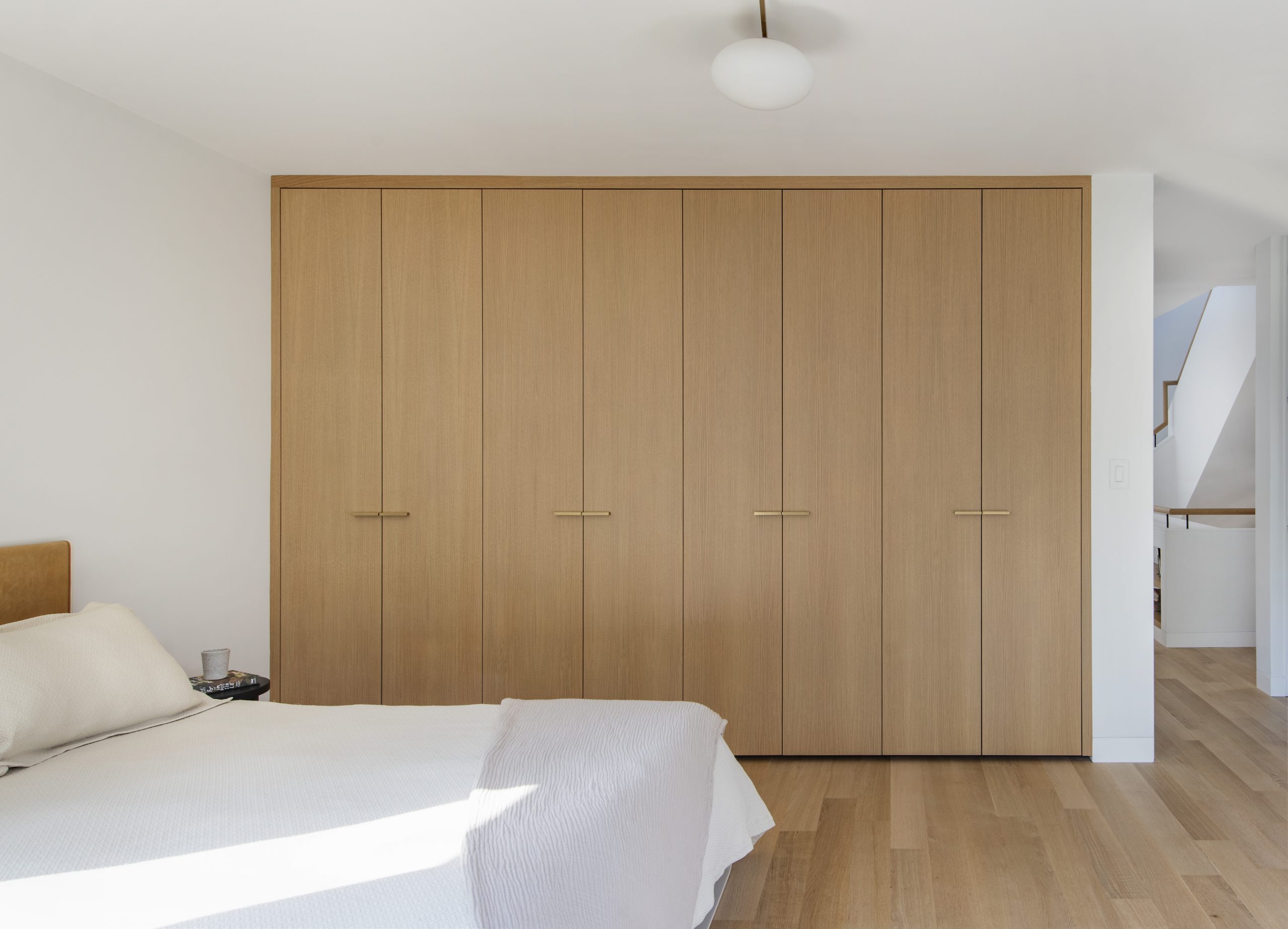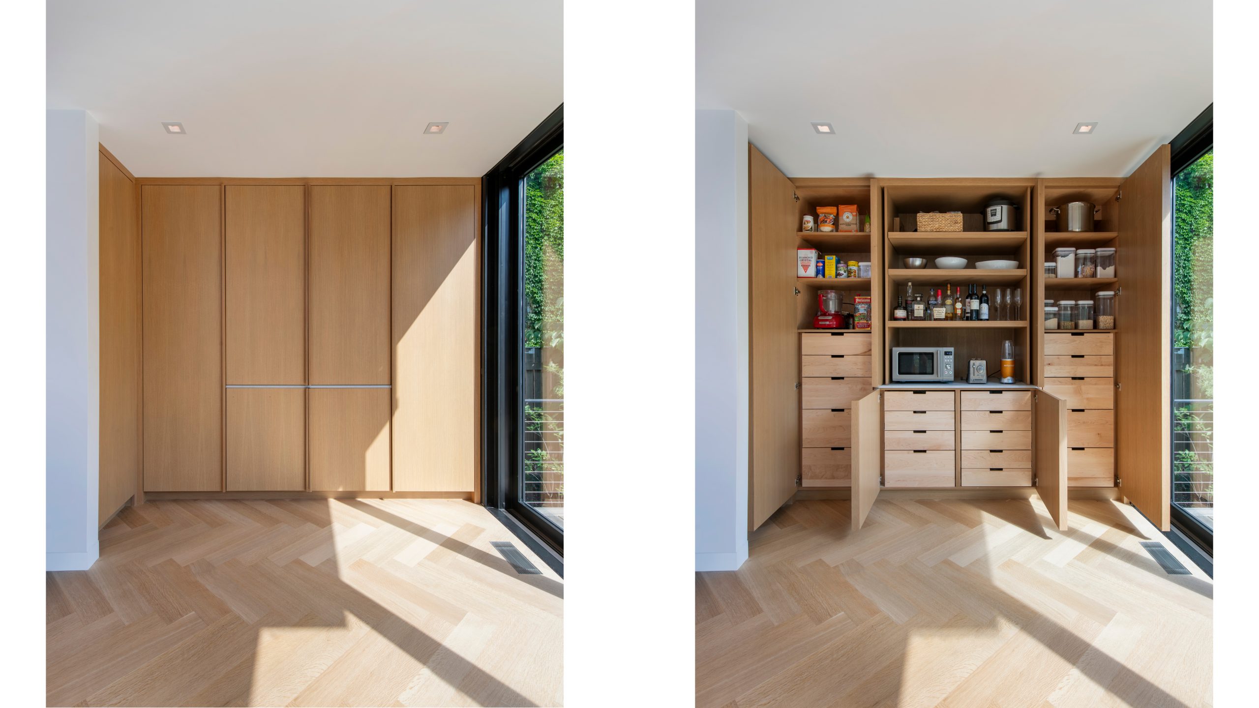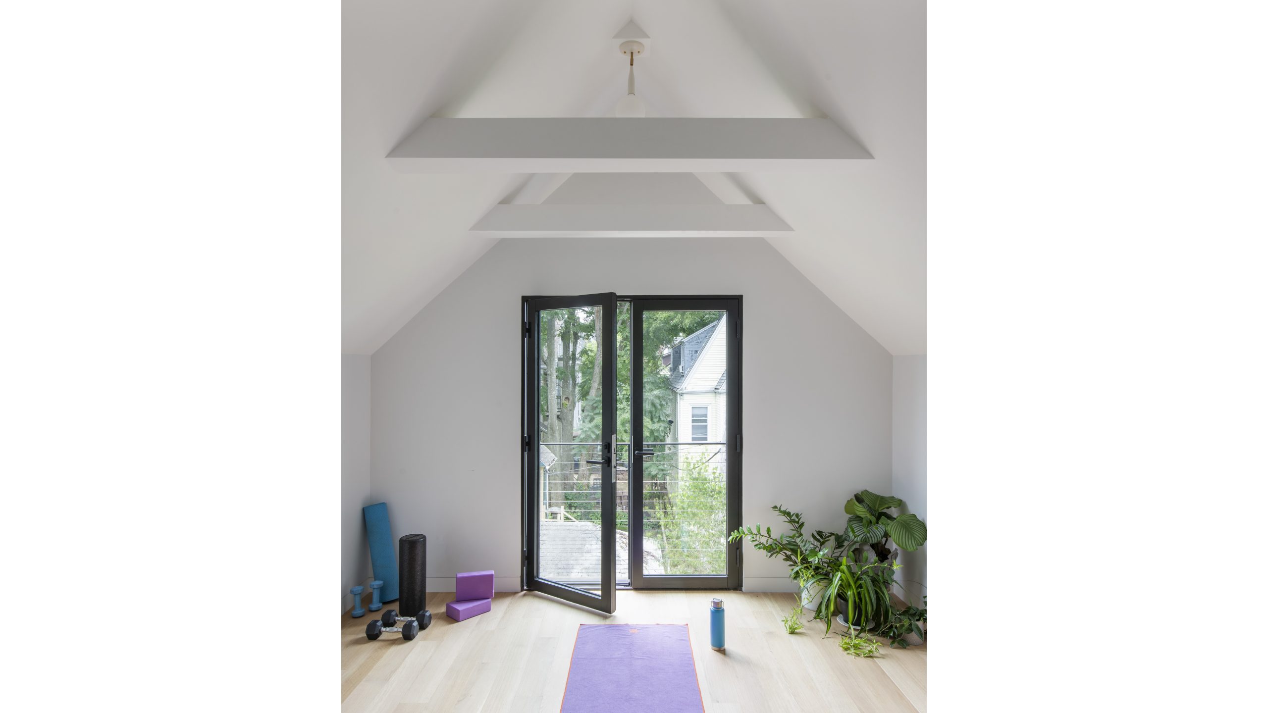 Our clients, a young couple with two young children, purchased a two-family rental in Cambridge and wanted to turn it into a single family home. The aesthetic mandate was to be clean, bright, light and modern. Functionally, the biggest challenge were the winder stairs, which were steep and had a very low head clearance, so the first order of business was to figure out where and how a single stair could be introduced. After many studies, we elected to leave the stair in its current location, but expand a dormer on the top floor to make the stair work. Now, the ribbon stair with custom brackets and railing unify the house, from family living spaces on the ground level to the bedrooms and office/yoga on the top floor. The detailing is crisp and simple; a European door system that provides full heights doors to the ceiling and an integrated base set the tone for the crisp details elsewhere. The biggest changes to the interior are on the ground level, where several small rooms were opened up to create a floor through space with a family/living room, kitchen, and dining areas. At the back, the house extends into the landscape with large double lift and slide doors to the terrace and yard. Inside, details and materials are simple. Oak floors in a herringbone provide some visual complexity, while the cabinets are detailed with no visible pulls. The cabinet design looks deceptively simple, but the detailing doesn’t allow for hinged doors so all storage is in drawers. Rift oak cabinets and a simple palate of gray and white set a calm foundation for family life. On the first floor, massive doors open to the yard beyond, expanding the house both visually and functionally.