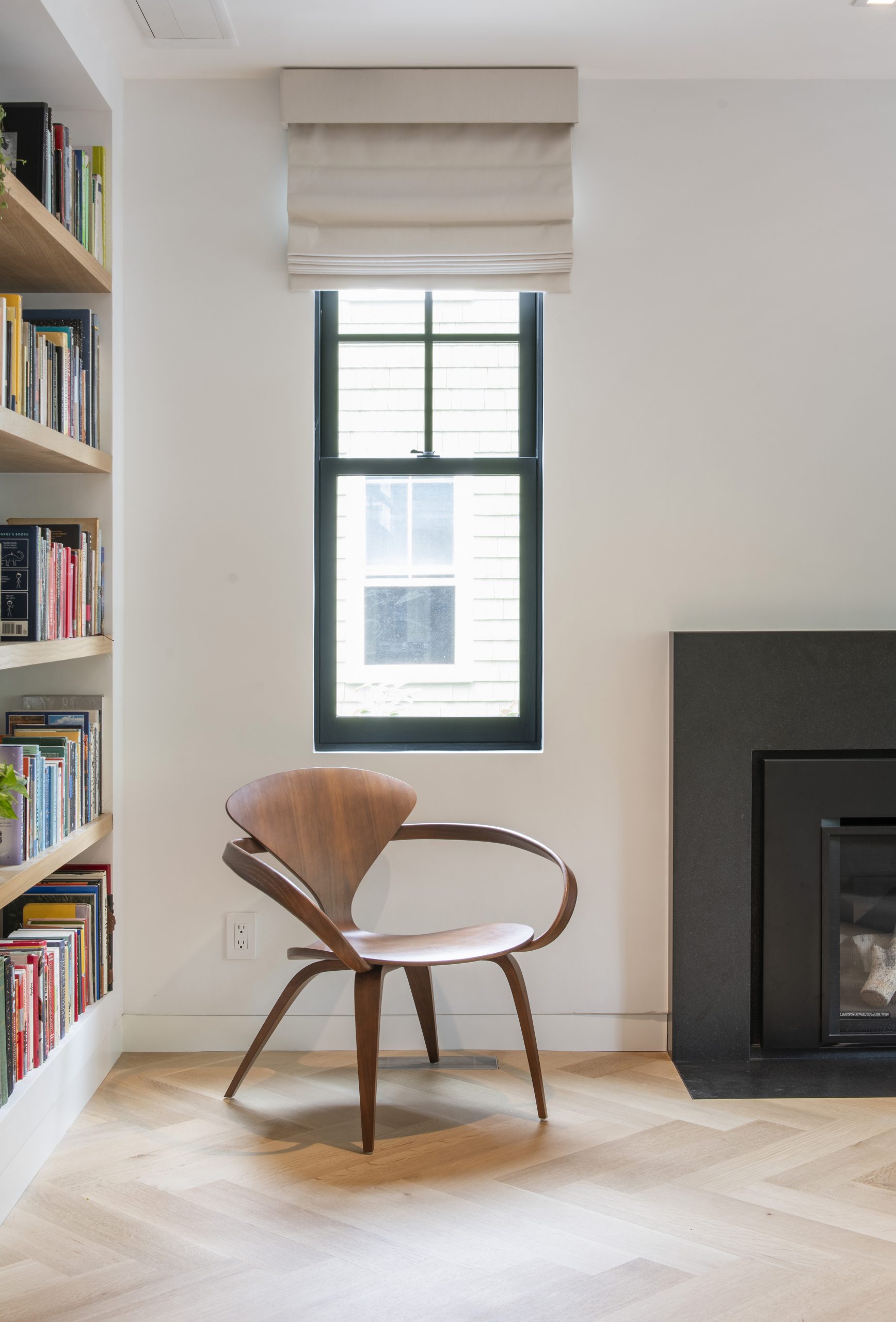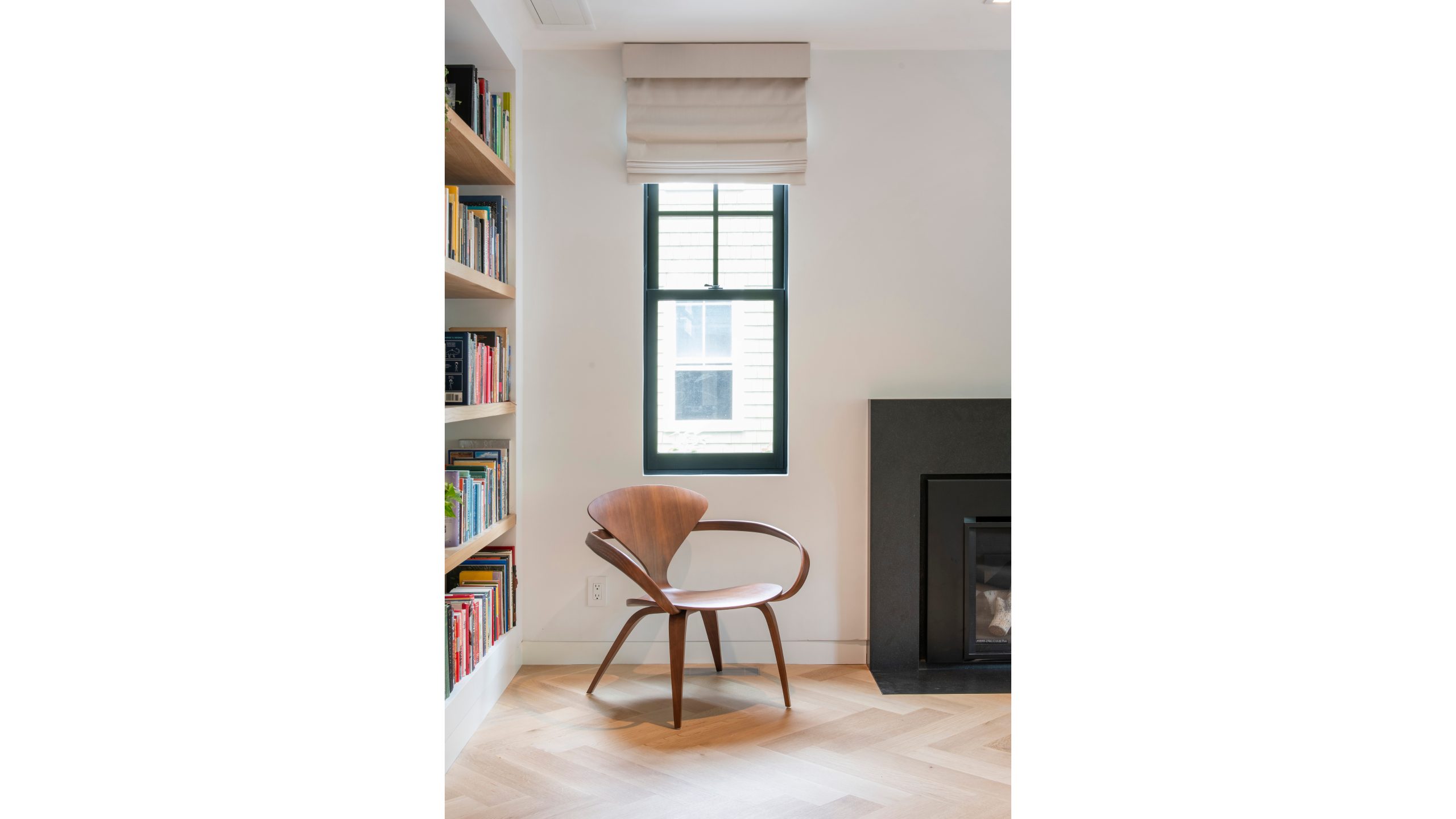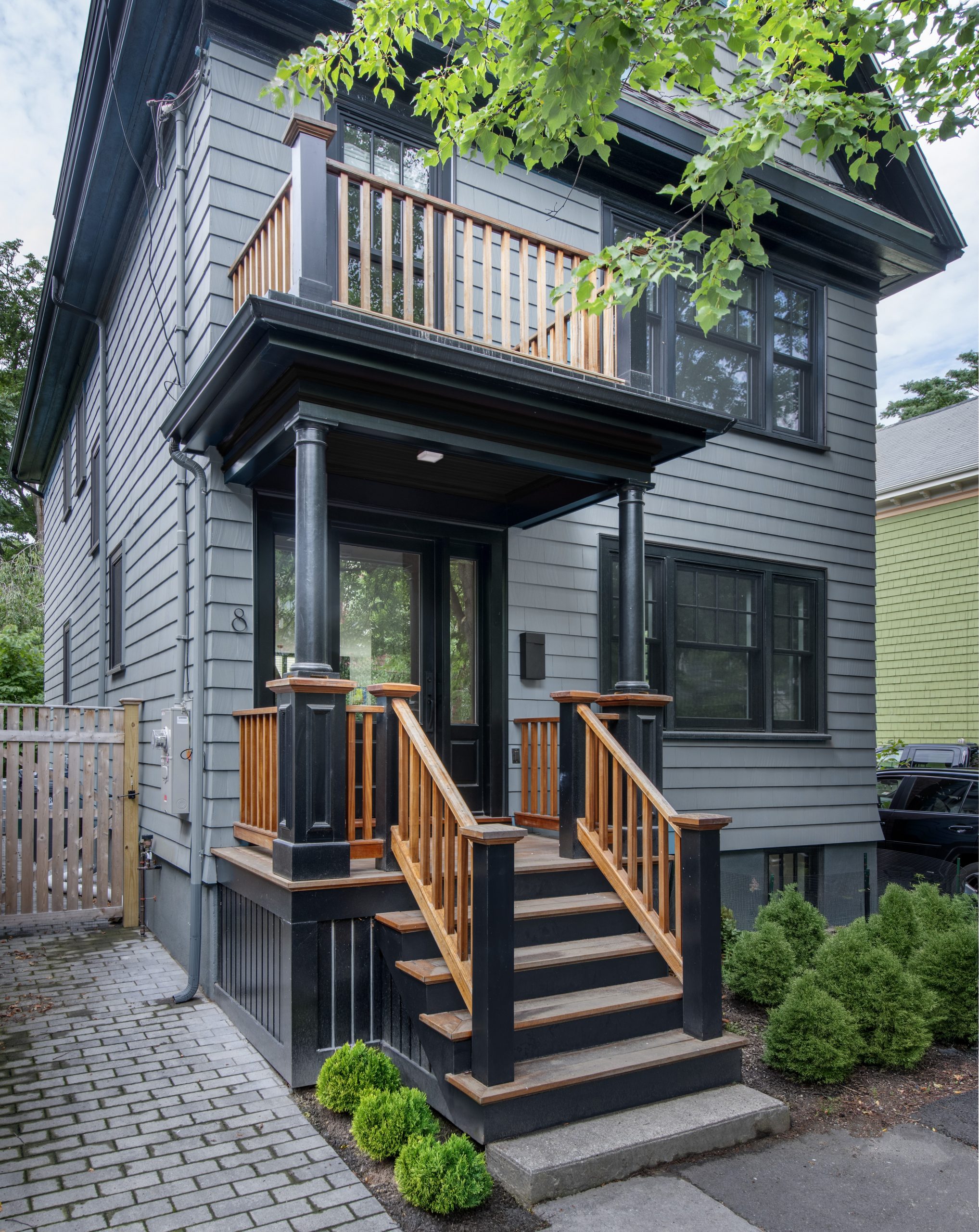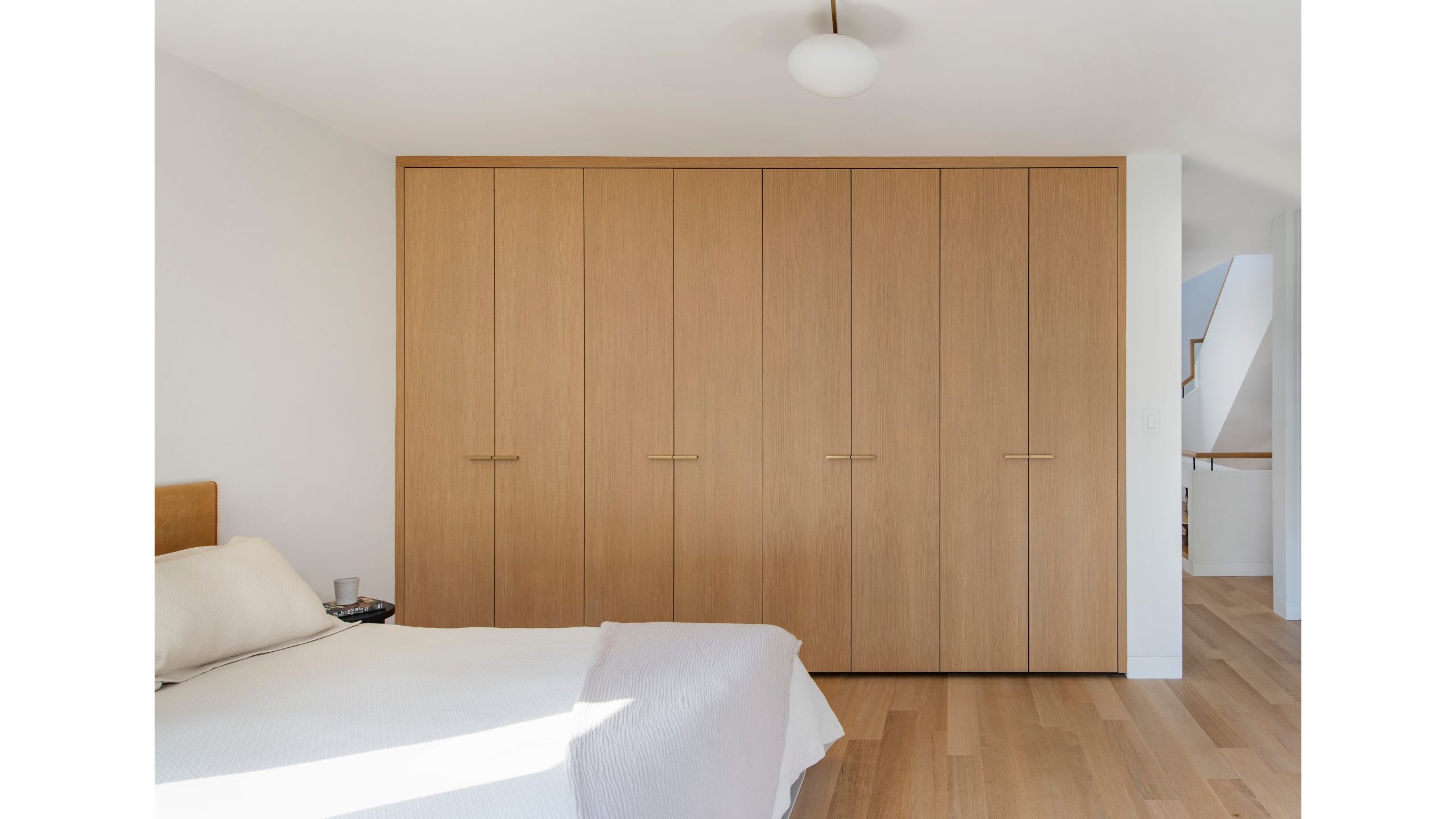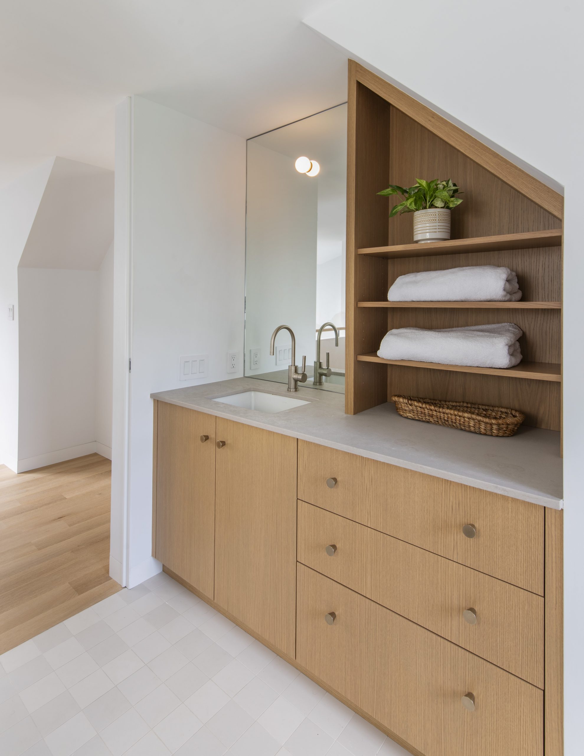 Our clients, a young couple with two young children, purchased a two-family rental in Cambridge and wanted to turn it into a single family home. The aesthetic mandate was to be clean, bright, light and modern. Functionally, the biggest challenge were the winder stairs, which were steep and had a very low head clearance, so the first order of business was to figure out where and how a single stair could be introduced. After many studies, we elected to leave the stair in its current location, but expand a dormer on the top floor to make the stair work. Now, the ribbon stair with custom brackets and railing unify the house, from family living spaces on the ground level to the bedrooms and office/yoga on the top floor. The detailing is crisp and simple; a European door system that provides full heights doors to the ceiling and an integrated base set the tone for the crisp details elsewhere. The biggest changes to the interior are on the ground level, where several small rooms were opened up to create a floor through space with a family/living room, kitchen, and dining areas. At the back, the house extends into the landscape with large double lift and slide doors to the terrace and yard. Inside, details and materials are simple. Oak floors in a herringbone provide some visual complexity, while the cabinets are detailed with no visible pulls. The cabinet design looks deceptively simple, but the detailing doesn’t allow for hinged doors so all storage is in drawers. Rift oak cabinets and a simple palate of gray and white set a calm foundation for family life. On the first floor, massive doors open to the yard beyond, expanding the house both visually and functionally.