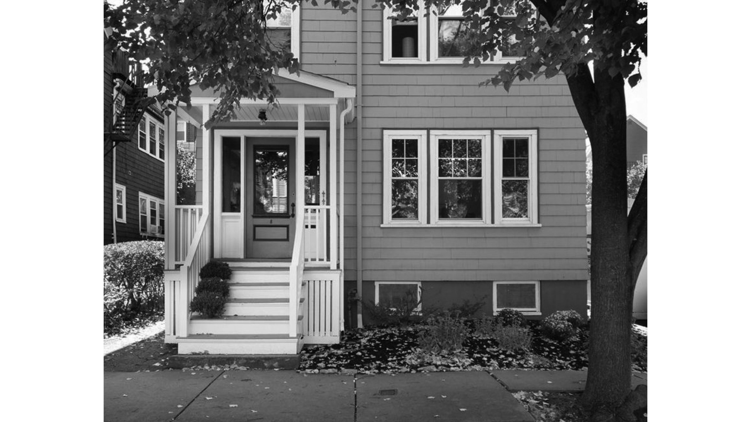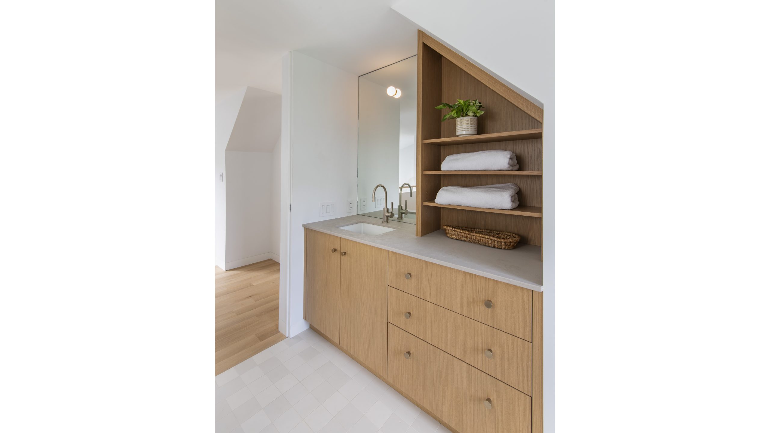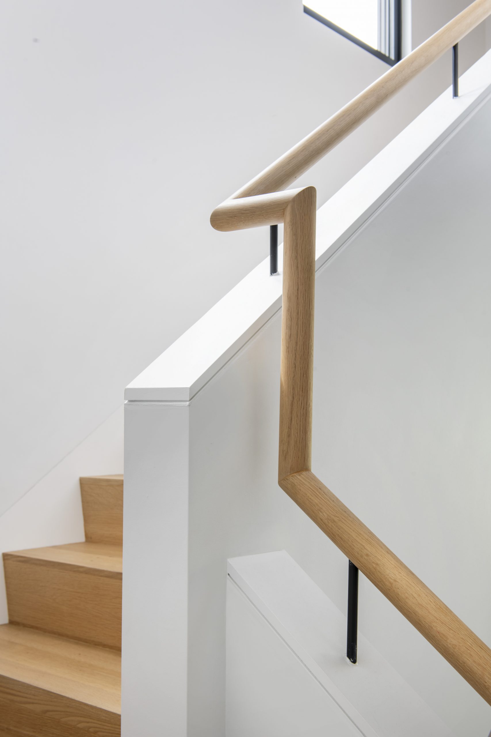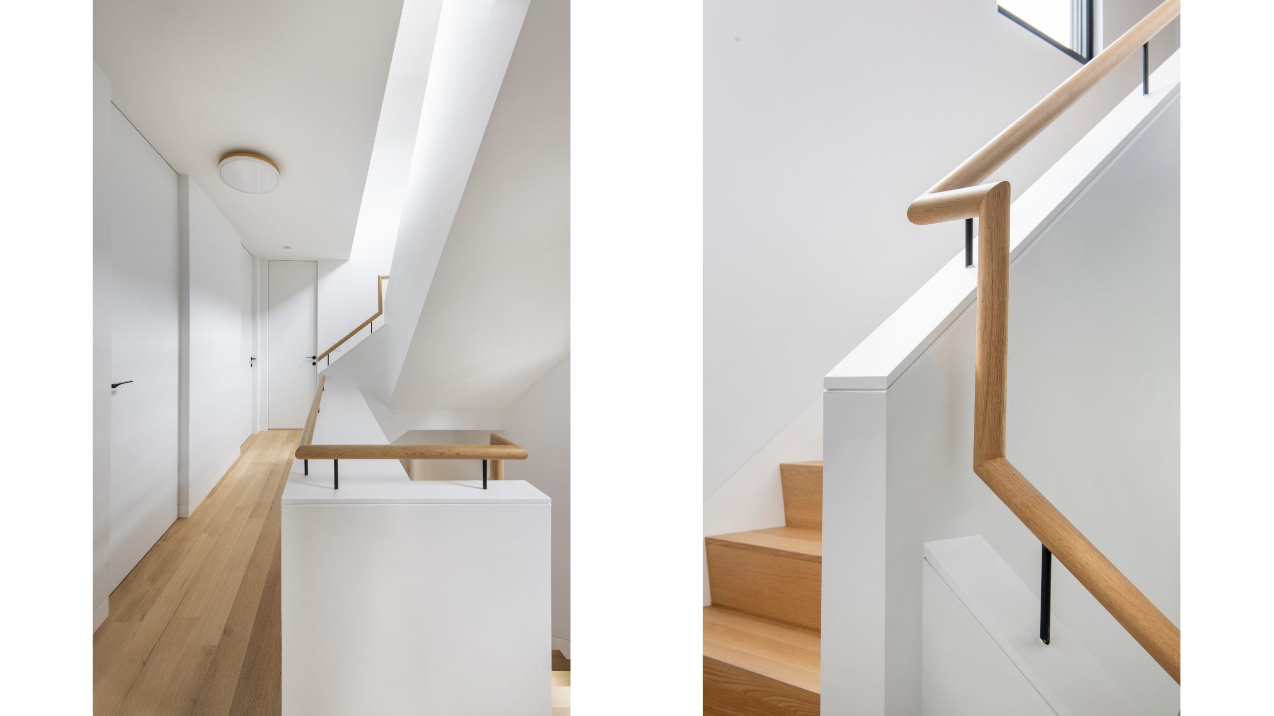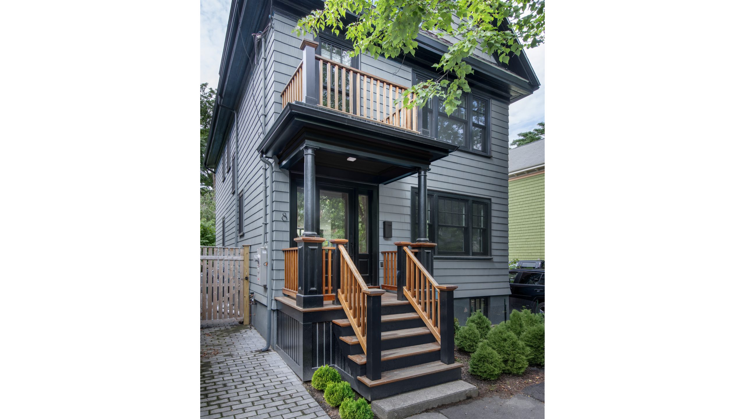 Our clients, a young couple with two young children, purchased a two-family rental in Cambridge and wanted to turn it into a single family home. The aesthetic mandate was to be clean, bright, light and modern. Functionally, the biggest challenge were the winder stairs, which were steep and had a very low head clearance, so the first order of business was to figure out where and how a single stair could be introduced. After many studies, we elected to leave the stair in its current location, but expand a dormer on the top floor to make the stair work. Now, the ribbon stair with custom brackets and railing unify the house, from family living spaces on the ground level to the bedrooms and office/yoga on the top floor. The detailing is crisp and simple; a European door system that provides full heights doors to the ceiling and an integrated base set the tone for the crisp details elsewhere. The biggest changes to the interior are on the ground level, where several small rooms were opened up to create a floor through space with a family/living room, kitchen, and dining areas. At the back, the house extends into the landscape with large double lift and slide doors to the terrace and yard. Inside, details and materials are simple. Oak floors in a herringbone provide some visual complexity, while the cabinets are detailed with no visible pulls. The cabinet design looks deceptively simple, but the detailing doesn’t allow for hinged doors so all storage is in drawers. Rift oak cabinets and a simple palate of gray and white set a calm foundation for family life. On the first floor, massive doors open to the yard beyond, expanding the house both visually and functionally.
