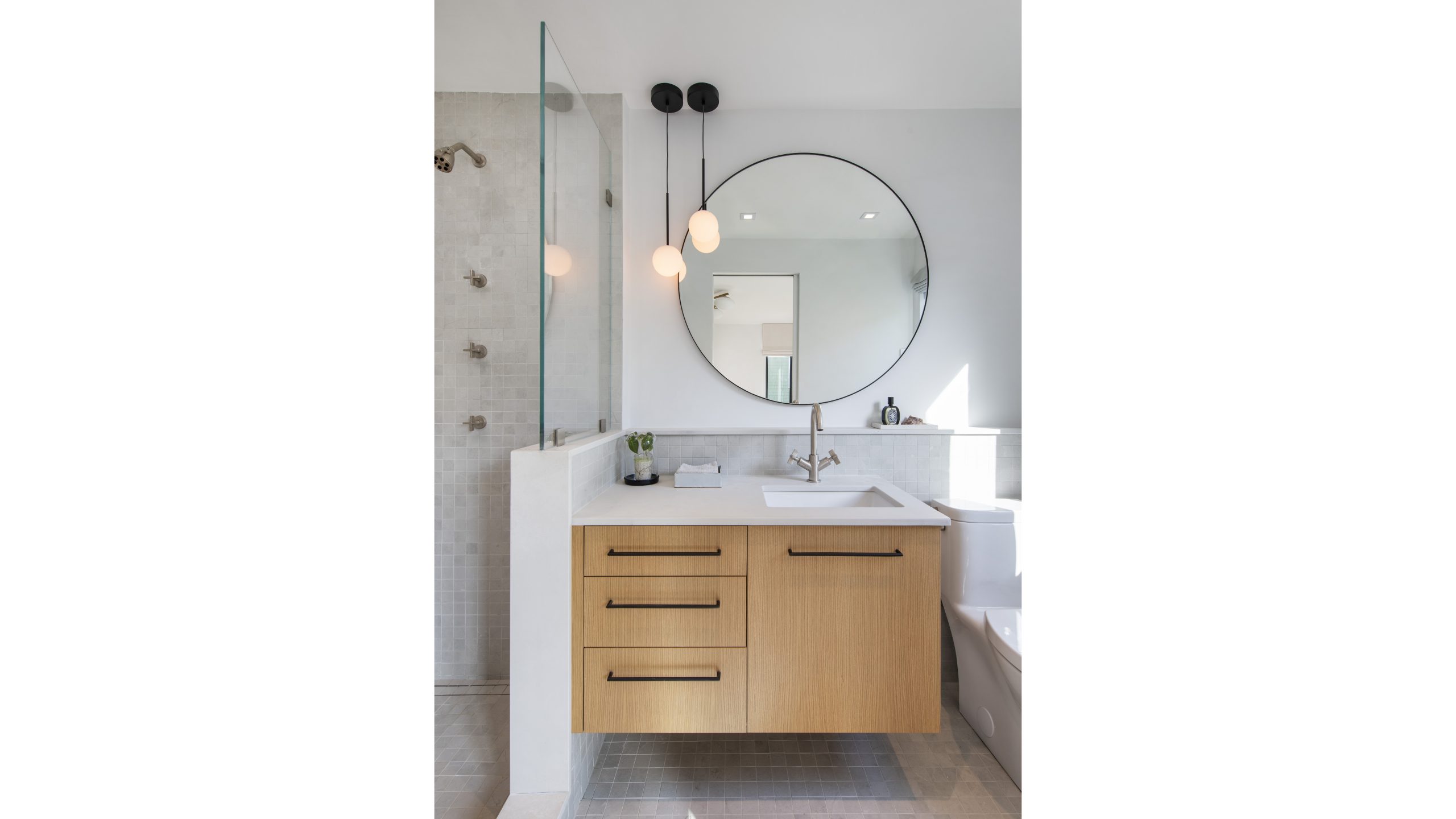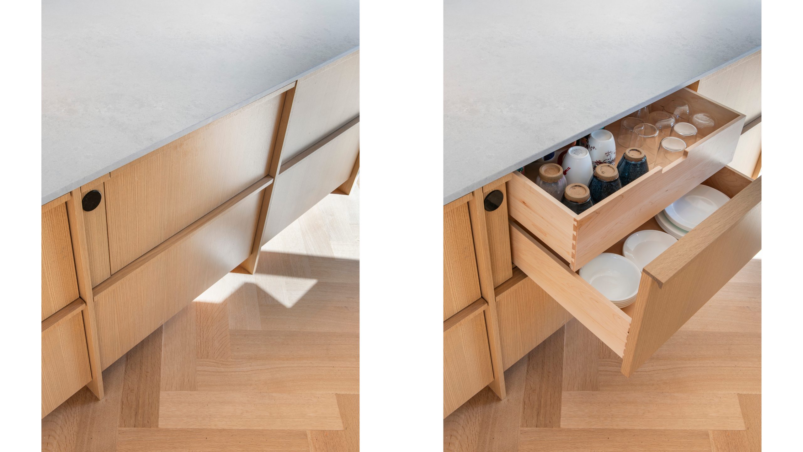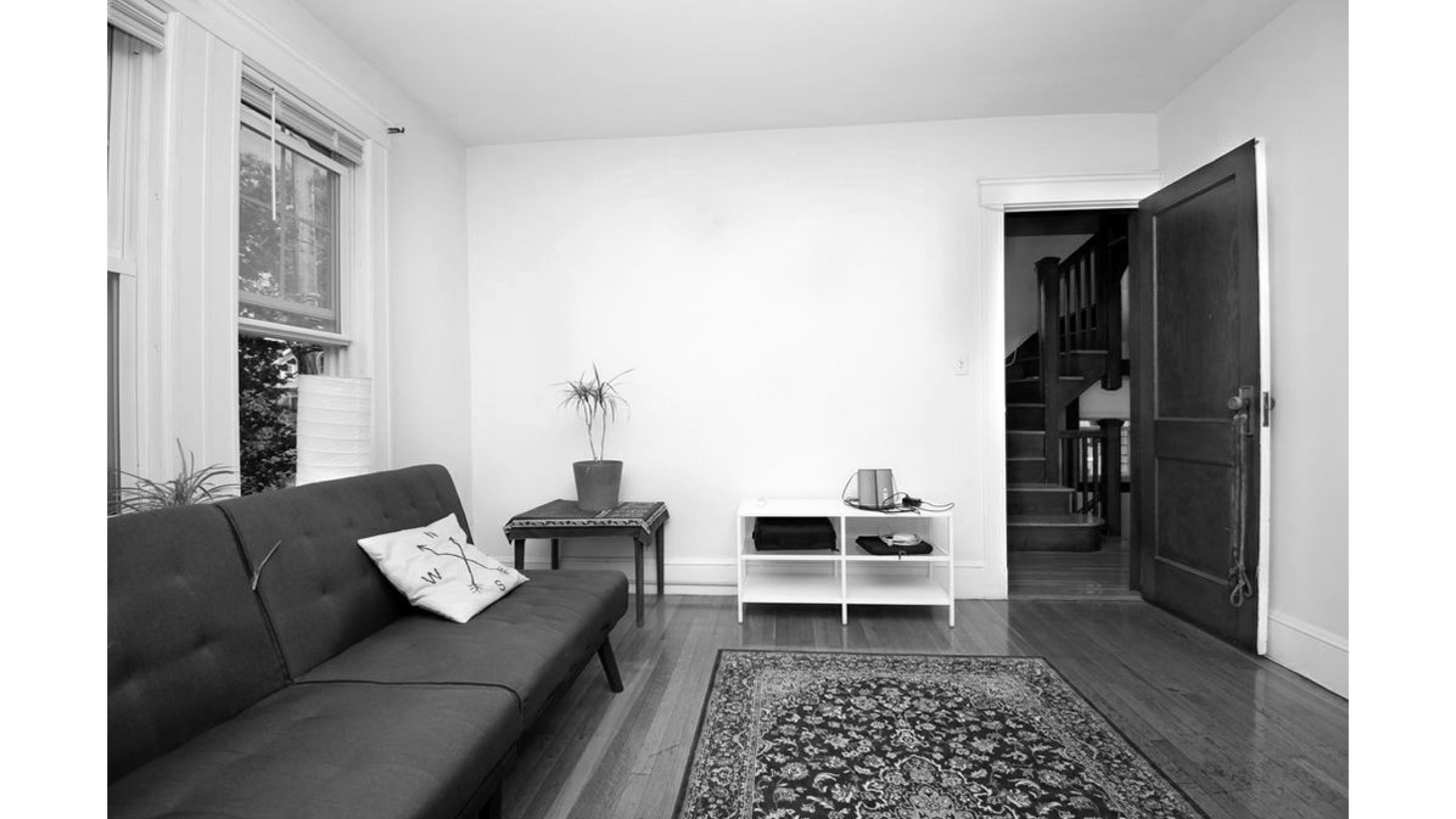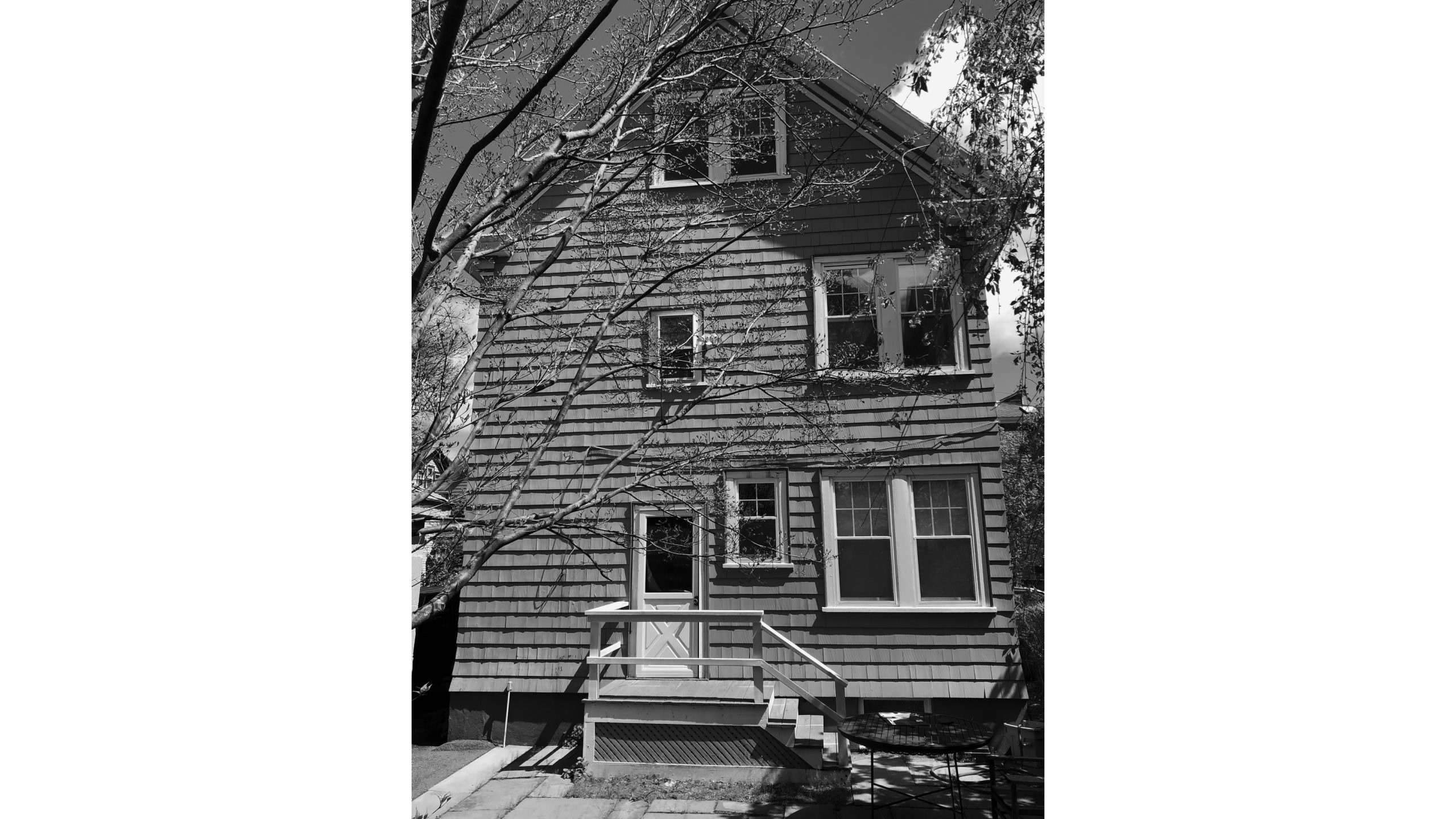 Our clients, a young couple with two young children, purchased a two-family rental in Cambridge and wanted to turn it into a single family home. The aesthetic mandate was to be clean, bright, light and modern. Functionally, the biggest challenge were the winder stairs, which were steep and had a very low head clearance, so the first order of business was to figure out where and how a single stair could be introduced. After many studies, we elected to leave the stair in its current location, but expand a dormer on the top floor to make the stair work. Now, the ribbon stair with custom brackets and railing unify the house, from family living spaces on the ground level to the bedrooms and office/yoga on the top floor. The detailing is crisp and simple; a European door system that provides full heights doors to the ceiling and an integrated base set the tone for the crisp details elsewhere. The biggest changes to the interior are on the ground level, where several small rooms were opened up to create a floor through space with a family/living room, kitchen, and dining areas. At the back, the house extends into the landscape with large double lift and slide doors to the terrace and yard. Inside, details and materials are simple. Oak floors in a herringbone provide some visual complexity, while the cabinets are detailed with no visible pulls. The cabinet design looks deceptively simple, but the detailing doesn’t allow for hinged doors so all storage is in drawers. Rift oak cabinets and a simple palate of gray and white set a calm foundation for family life. On the first floor, massive doors open to the yard beyond, expanding the house both visually and functionally.