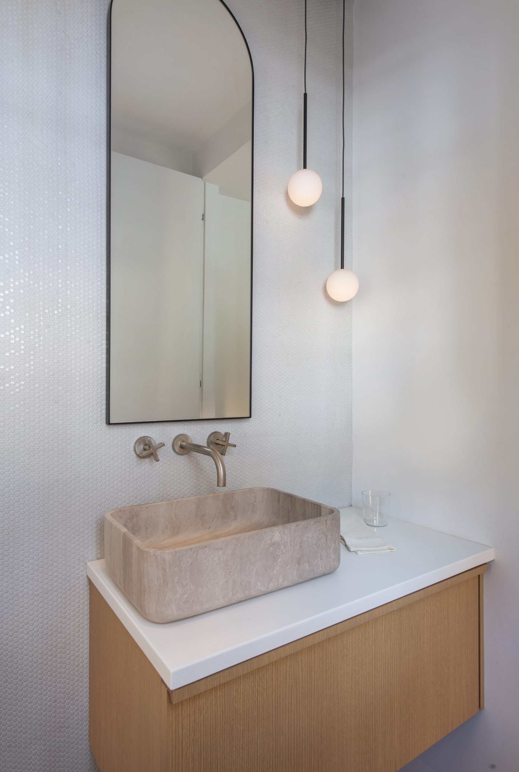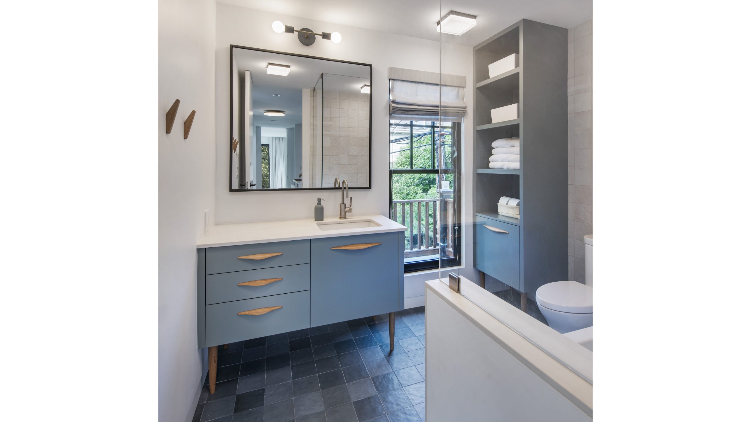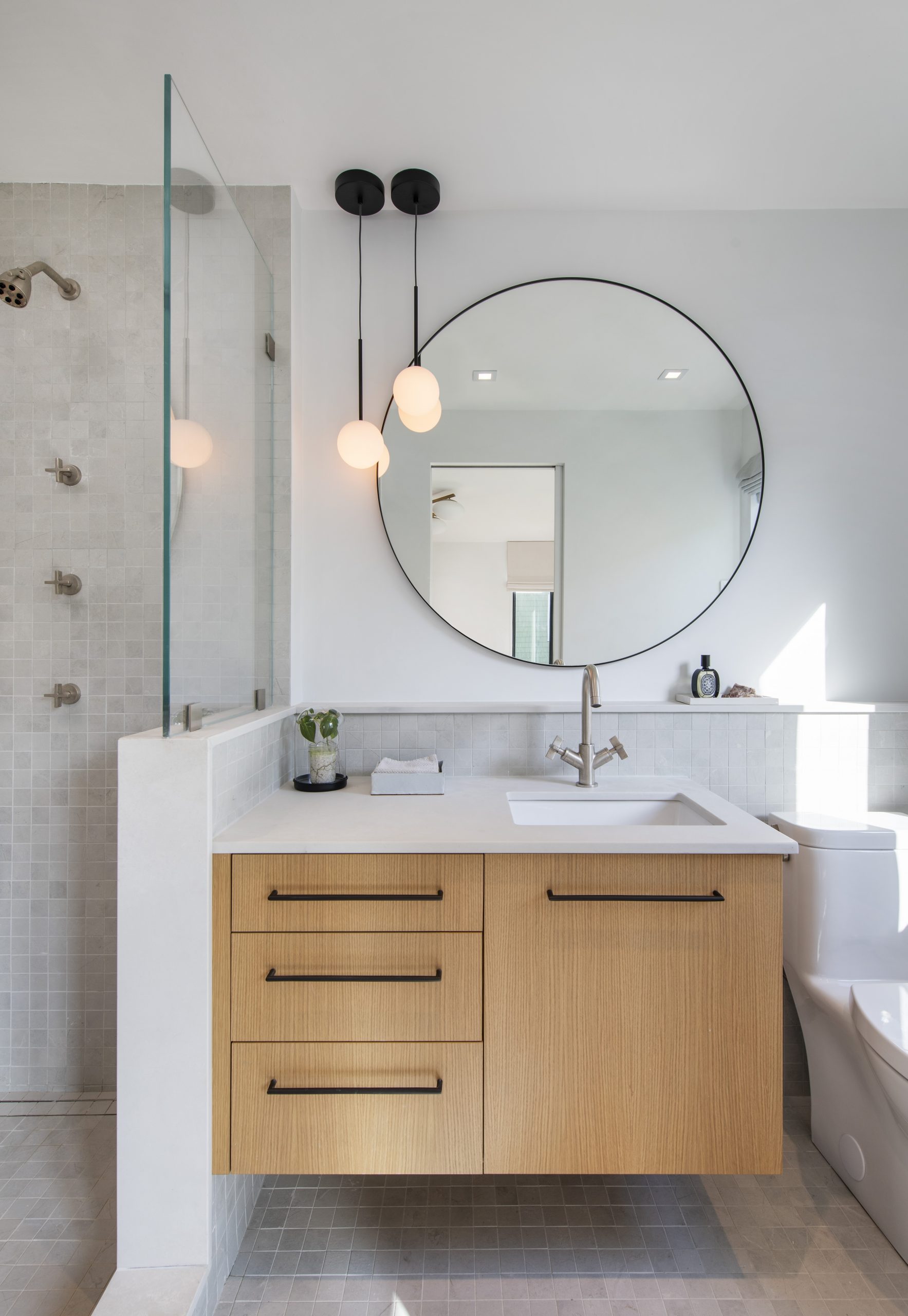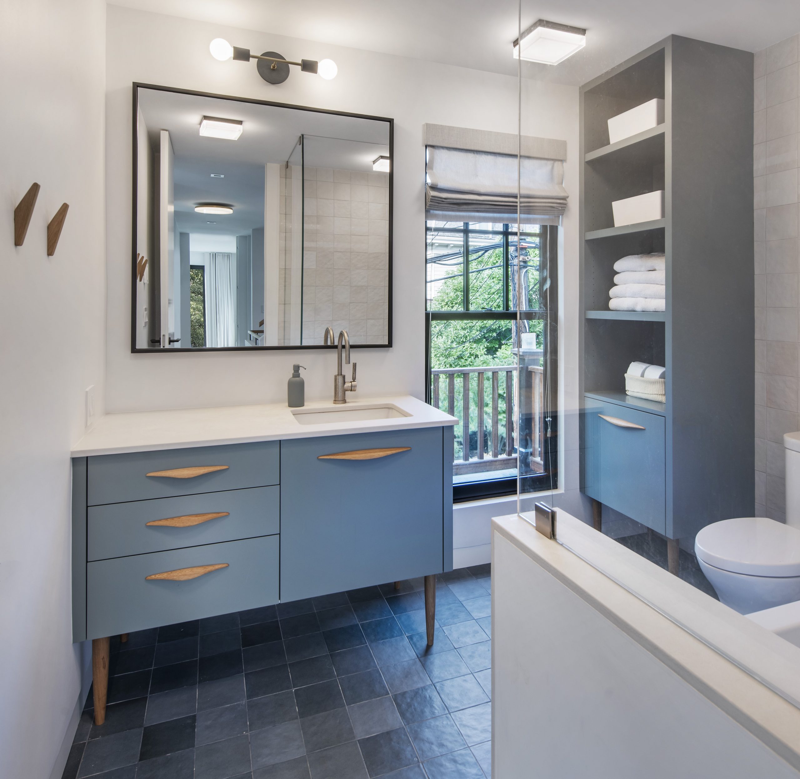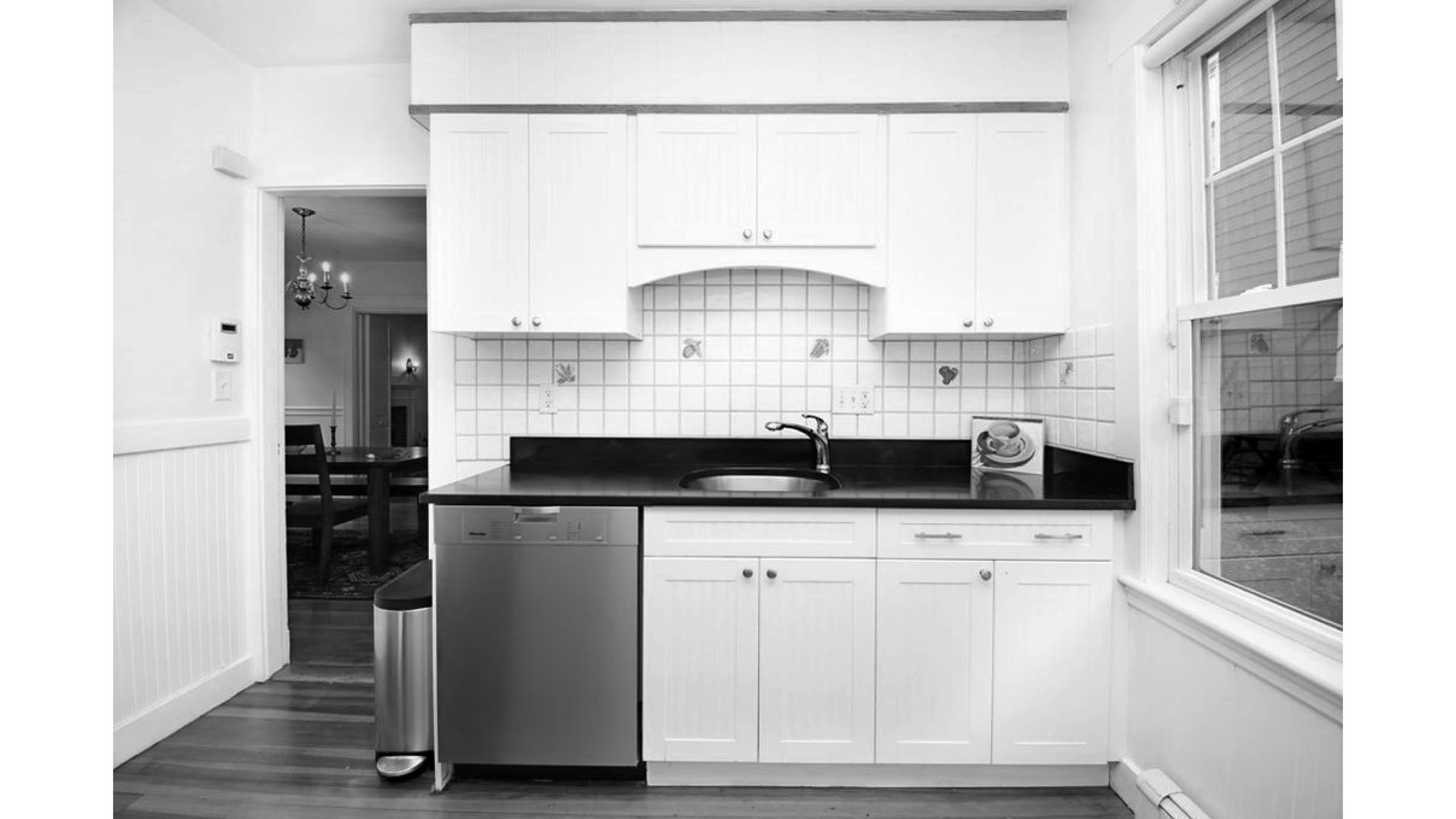 Our clients, a young couple with two young children, purchased a two-family rental in Cambridge and wanted to turn it into a single family home. The aesthetic mandate was to be clean, bright, light and modern. Functionally, the biggest challenge were the winder stairs, which were steep and had a very low head clearance, so the first order of business was to figure out where and how a single stair could be introduced. After many studies, we elected to leave the stair in its current location, but expand a dormer on the top floor to make the stair work. Now, the ribbon stair with custom brackets and railing unify the house, from family living spaces on the ground level to the bedrooms and office/yoga on the top floor. The detailing is crisp and simple; a European door system that provides full heights doors to the ceiling and an integrated base set the tone for the crisp details elsewhere. The biggest changes to the interior are on the ground level, where several small rooms were opened up to create a floor through space with a family/living room, kitchen, and dining areas. At the back, the house extends into the landscape with large double lift and slide doors to the terrace and yard. Inside, details and materials are simple. Oak floors in a herringbone provide some visual complexity, while the cabinets are detailed with no visible pulls. The cabinet design looks deceptively simple, but the detailing doesn’t allow for hinged doors so all storage is in drawers. Rift oak cabinets and a simple palate of gray and white set a calm foundation for family life. On the first floor, massive doors open to the yard beyond, expanding the house both visually and functionally.
