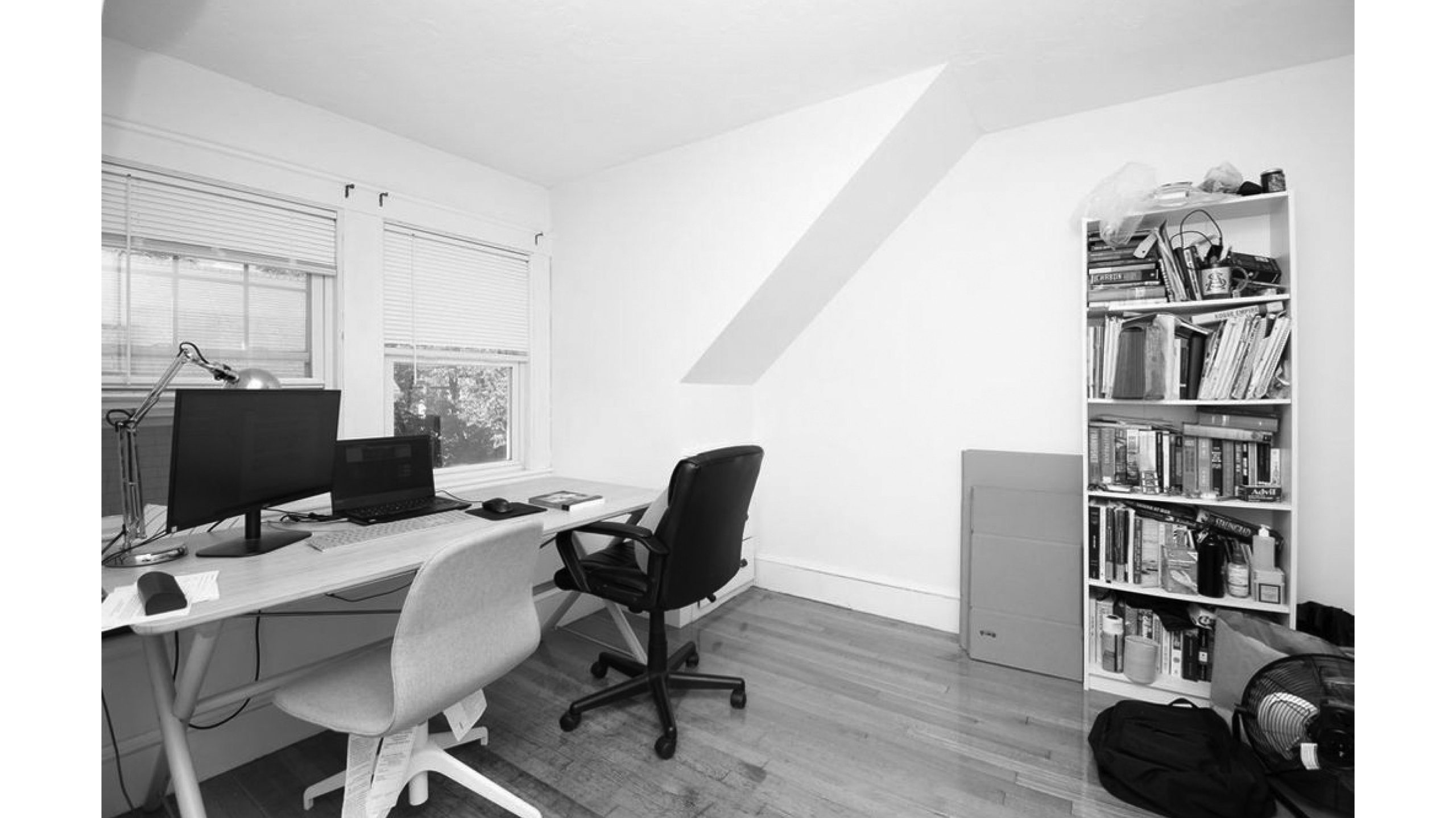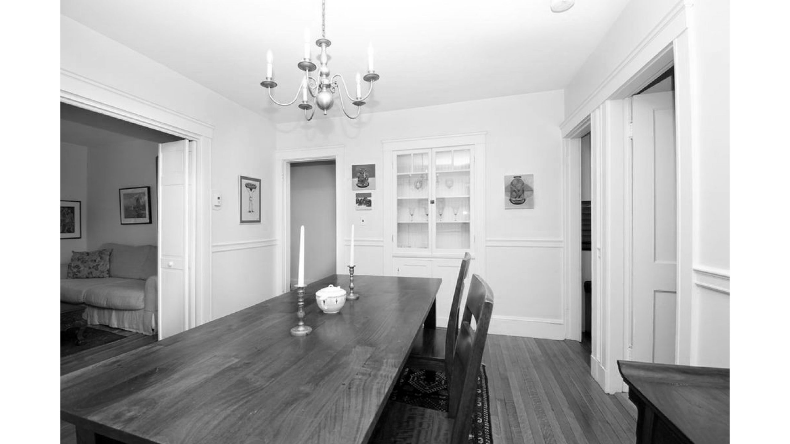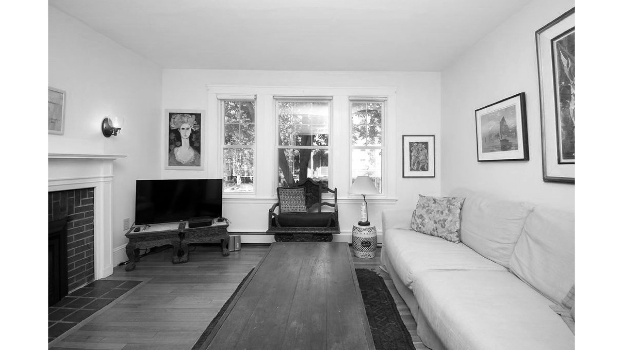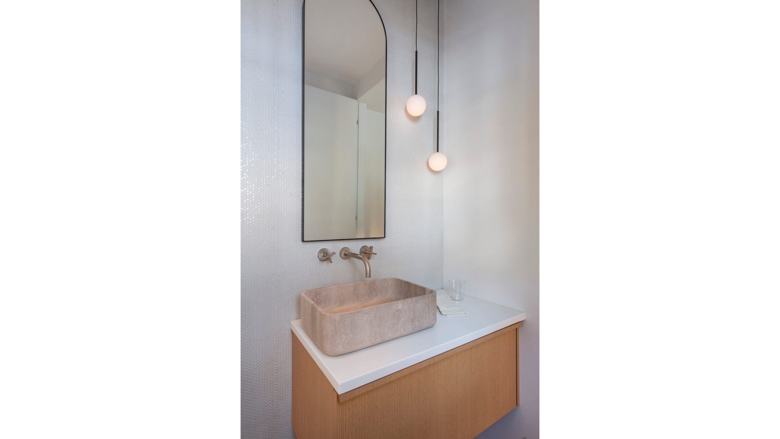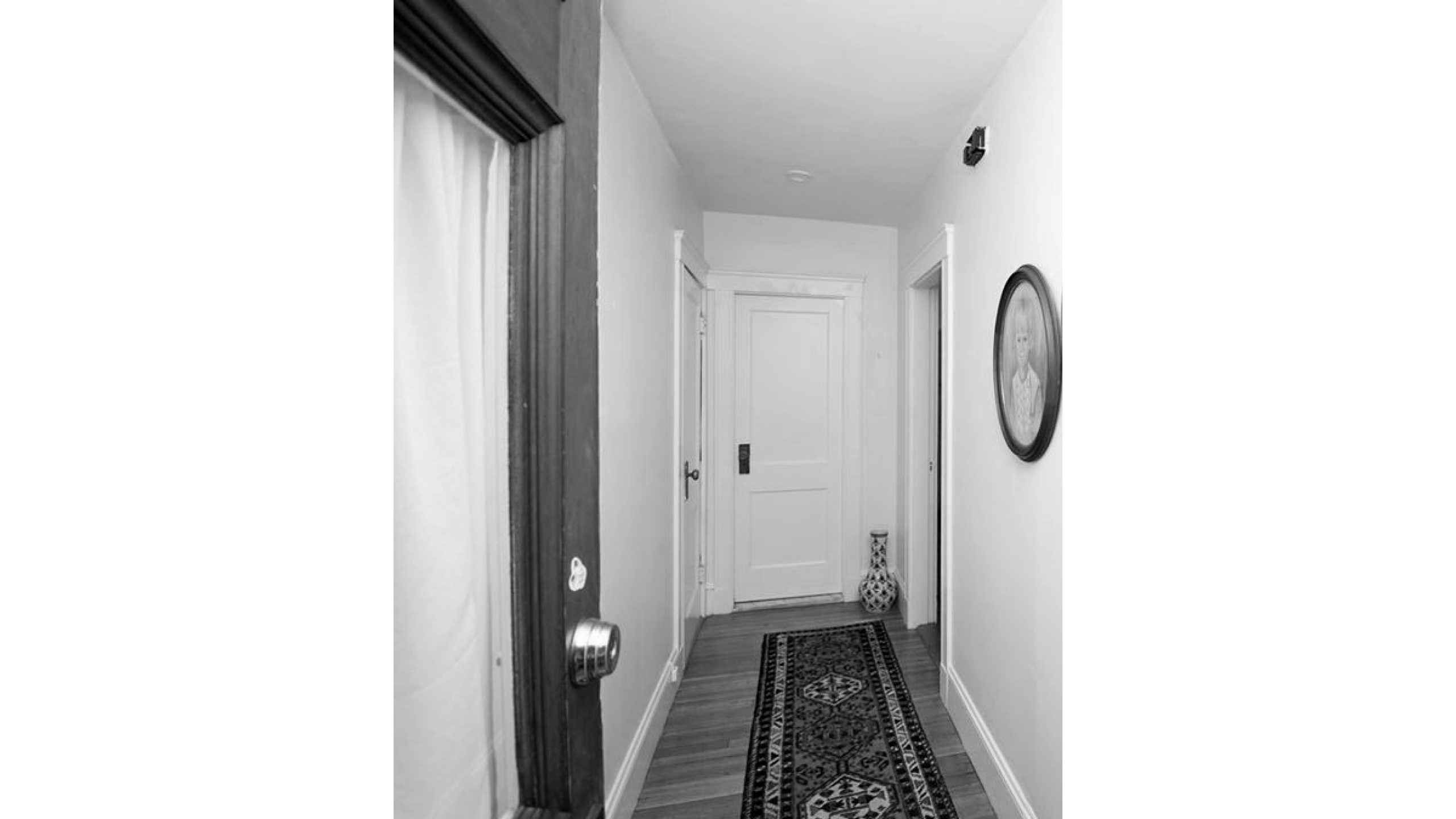 Our clients, a young couple with two young children, purchased a two-family rental in Cambridge and wanted to turn it into a single family home. The aesthetic mandate was to be clean, bright, light and modern. Functionally, the biggest challenge were the winder stairs, which were steep and had a very low head clearance, so the first order of business was to figure out where and how a single stair could be introduced. After many studies, we elected to leave the stair in its current location, but expand a dormer on the top floor to make the stair work. Now, the ribbon stair with custom brackets and railing unify the house, from family living spaces on the ground level to the bedrooms and office/yoga on the top floor. The detailing is crisp and simple; a European door system that provides full heights doors to the ceiling and an integrated base set the tone for the crisp details elsewhere. The biggest changes to the interior are on the ground level, where several small rooms were opened up to create a floor through space with a family/living room, kitchen, and dining areas. At the back, the house extends into the landscape with large double lift and slide doors to the terrace and yard. Inside, details and materials are simple. Oak floors in a herringbone provide some visual complexity, while the cabinets are detailed with no visible pulls. The cabinet design looks deceptively simple, but the detailing doesn’t allow for hinged doors so all storage is in drawers. Rift oak cabinets and a simple palate of gray and white set a calm foundation for family life. On the first floor, massive doors open to the yard beyond, expanding the house both visually and functionally.